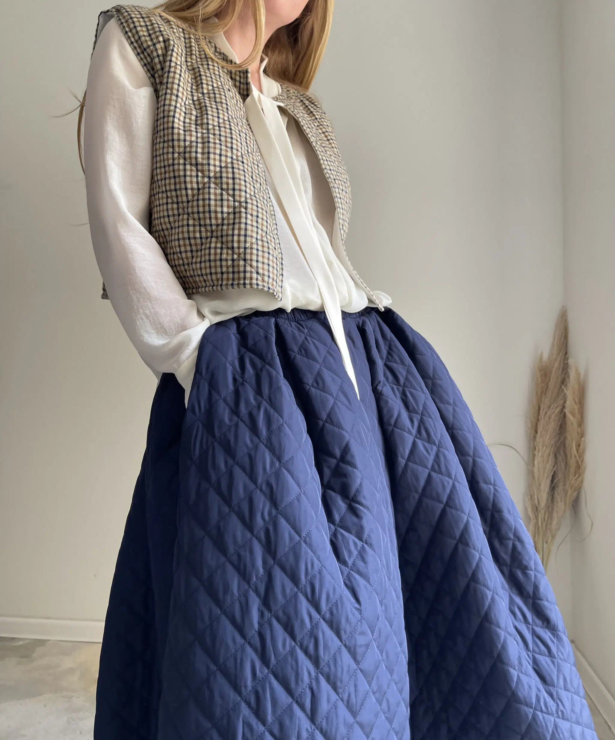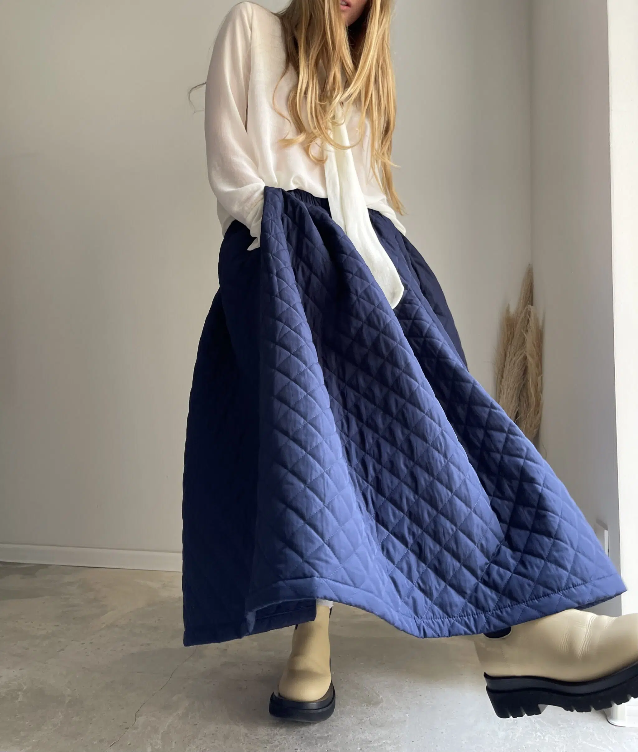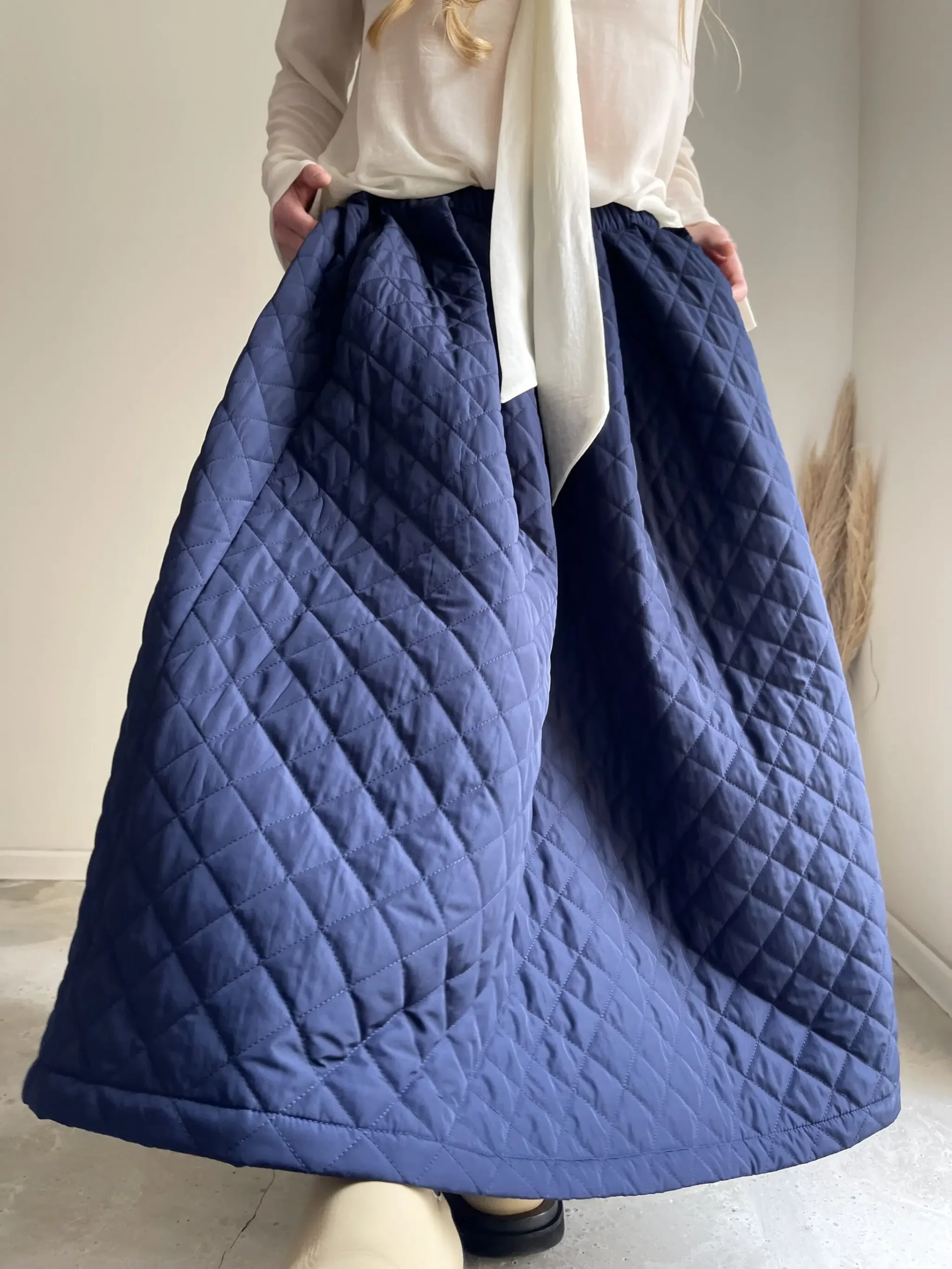 Jupe « AMBRE » dans un sublime tissu matelassé bleu nuit. Jupe longue, taille sur élastique, fronces, poches. Une jupe élégante, minimaliste et intemporelle. Un tissu unique pour une pièce unique.