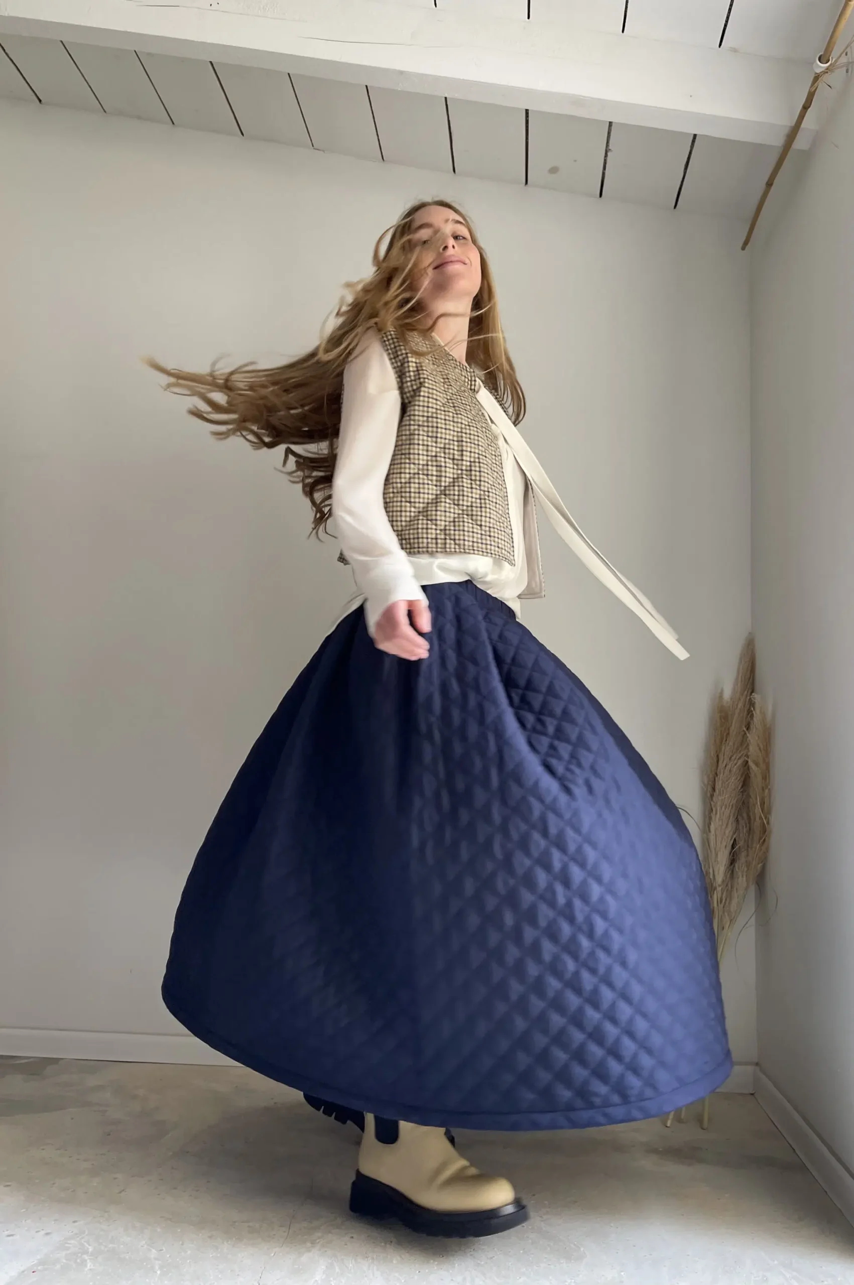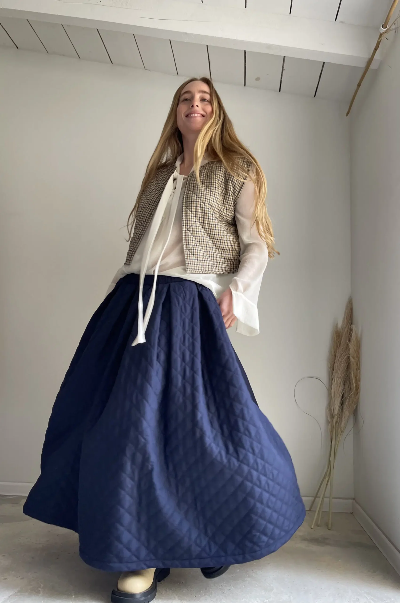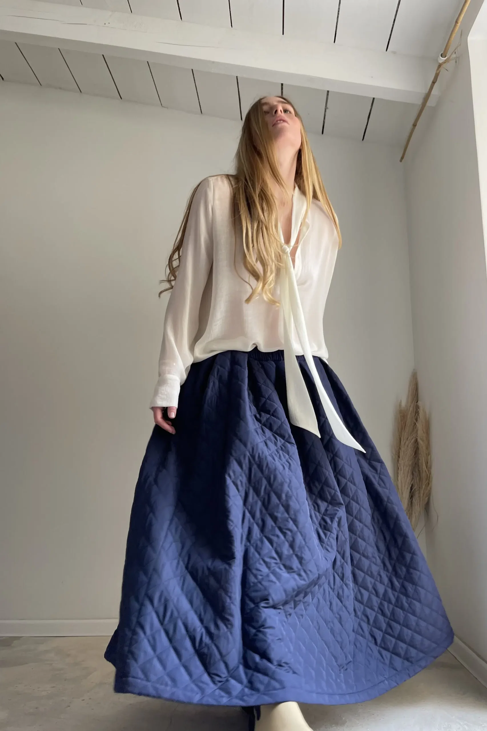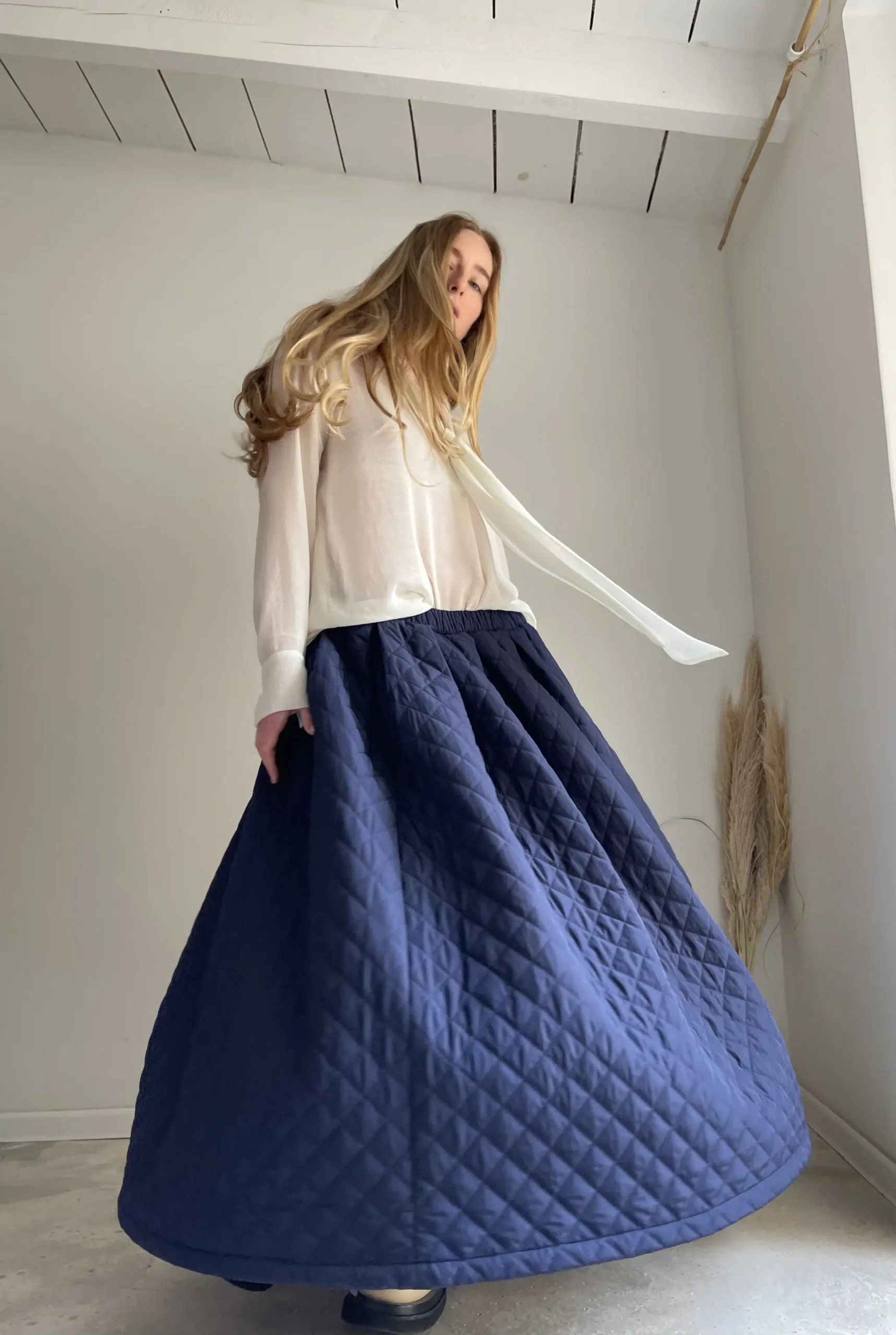 Jupe « AMBRE » dans un sublime tissu matelassé bleu nuit. Jupe longue, taille sur élastique, fronces, poches. Une jupe élégante, minimaliste et intemporelle. Un tissu unique pour une pièce unique.