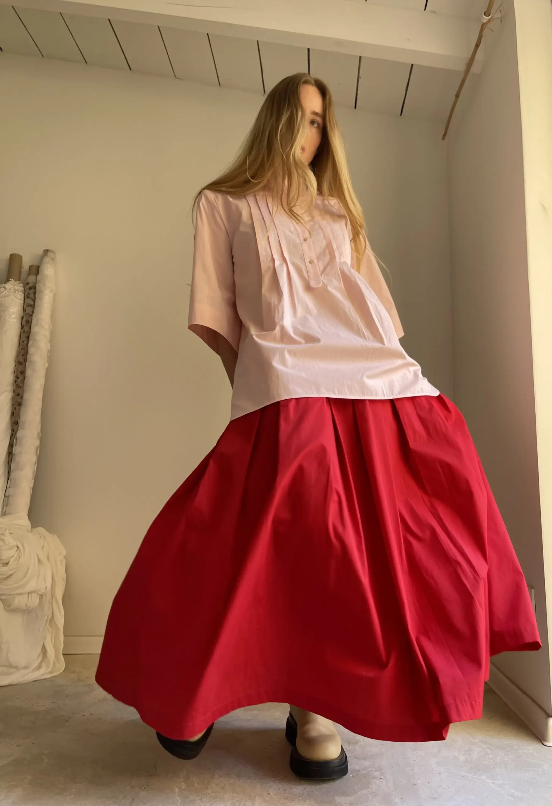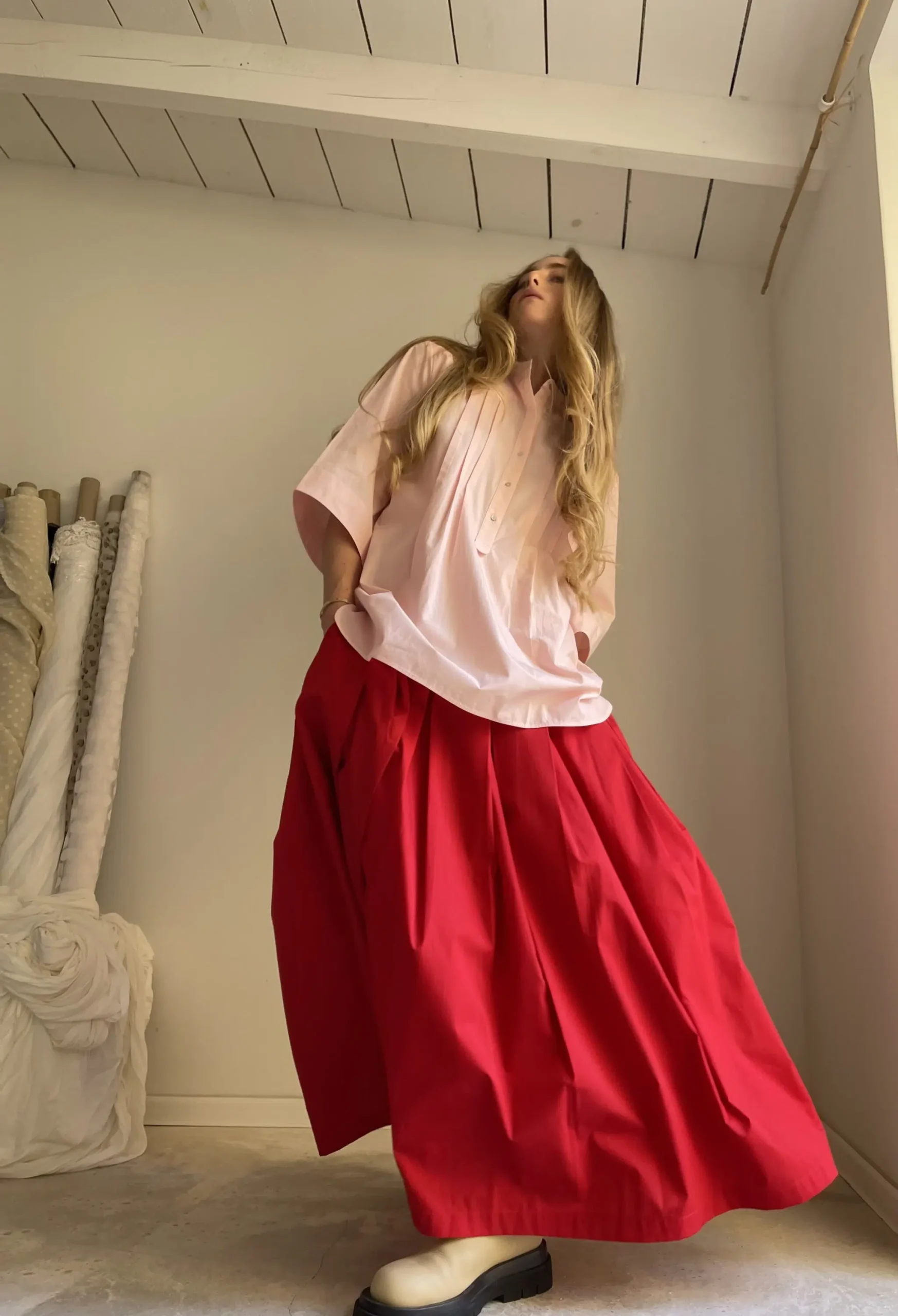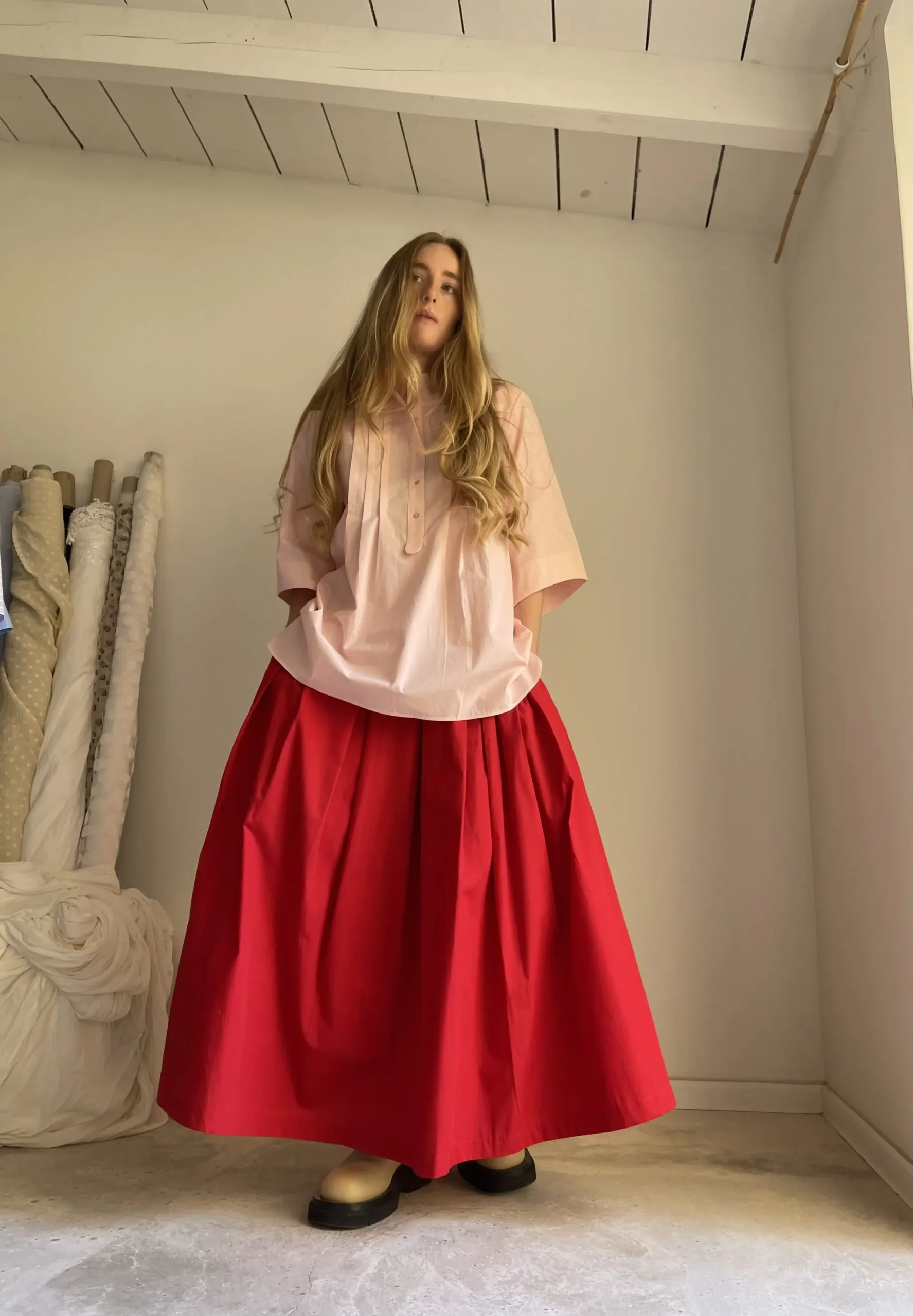 Jupe « MICHELLE » dans une belle popeline de coton rouge coquelicot, taille sur élastique, fronces, poches. Une jupe élégante, minimaliste et intemporelle. Pièce unique.