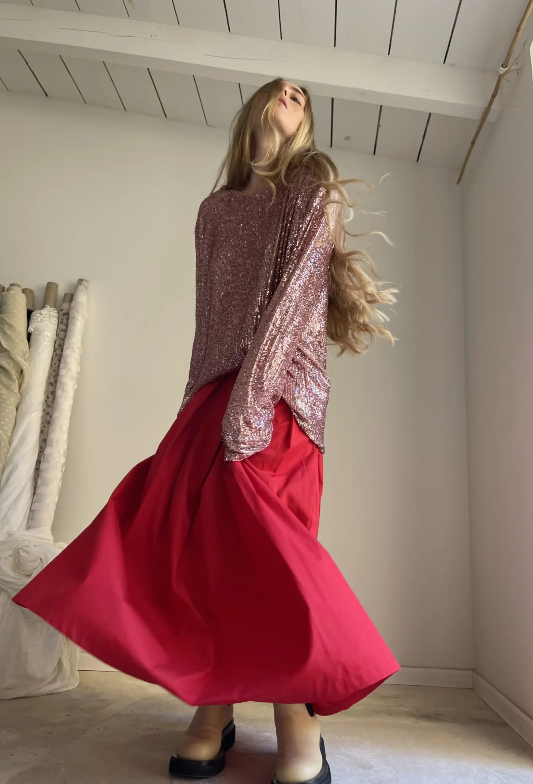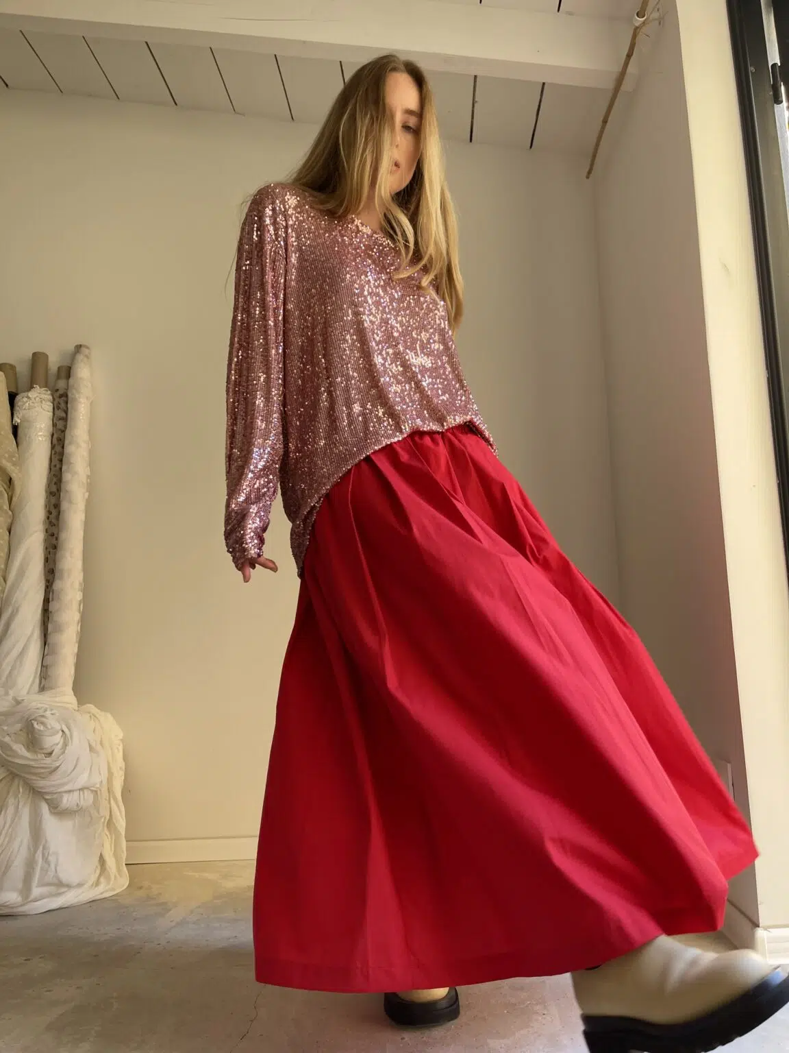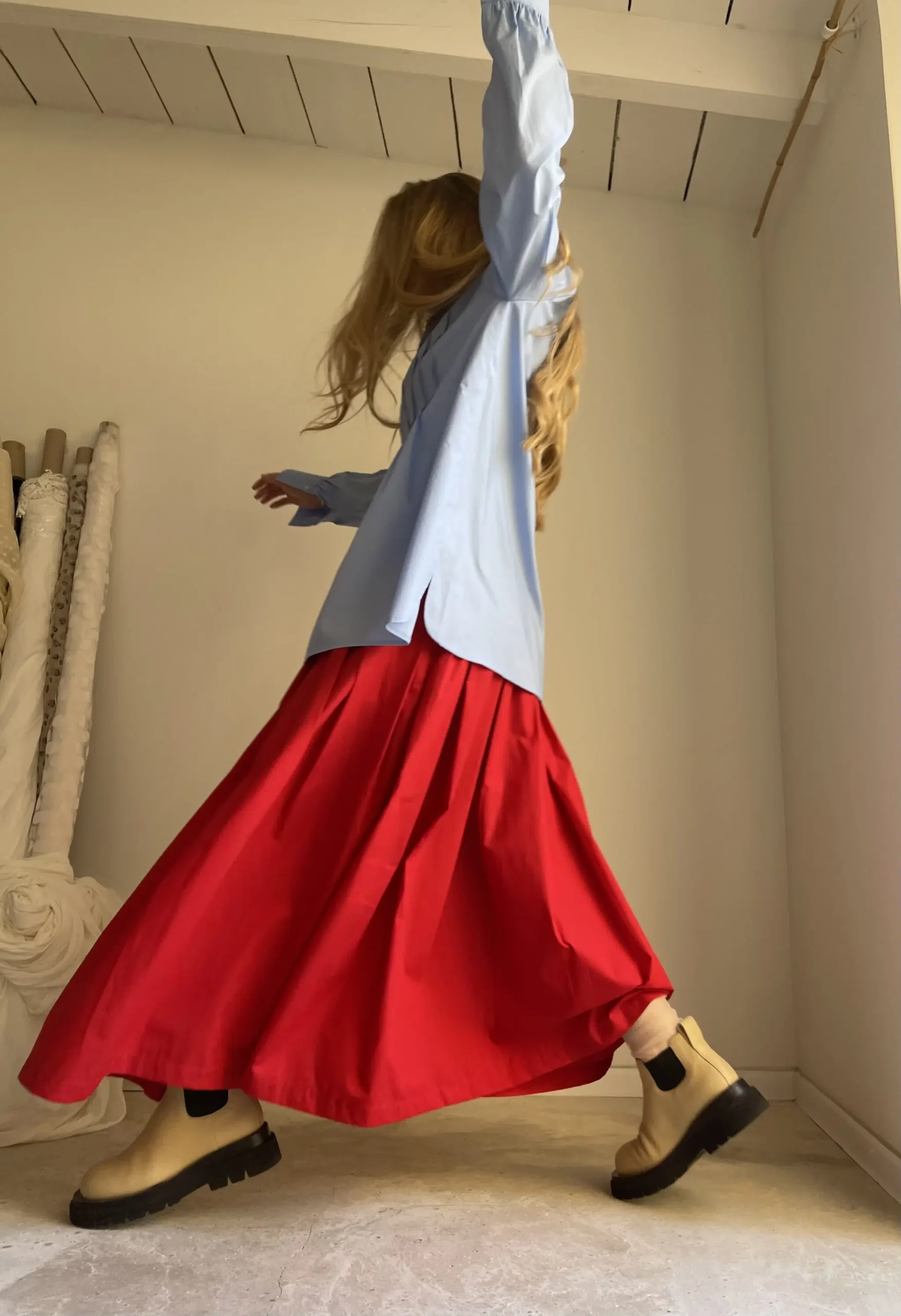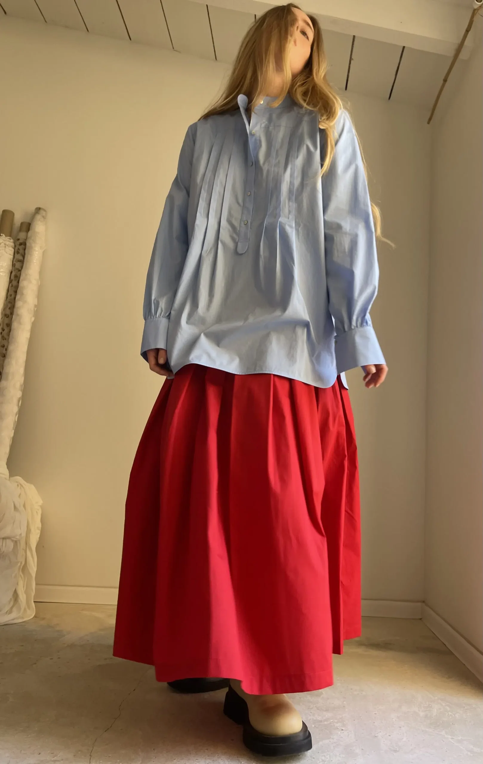 Jupe « MICHELLE » dans une belle popeline de coton rouge coquelicot, taille sur élastique, fronces, poches. Une jupe élégante, minimaliste et intemporelle. Pièce unique.