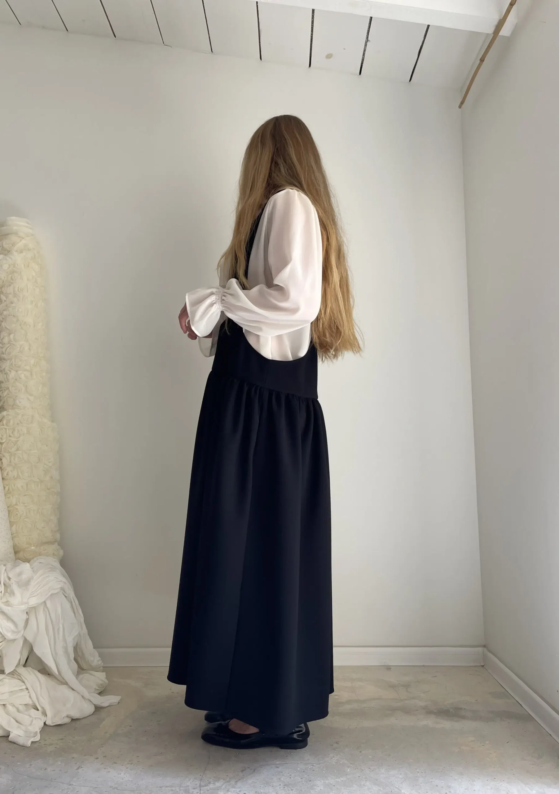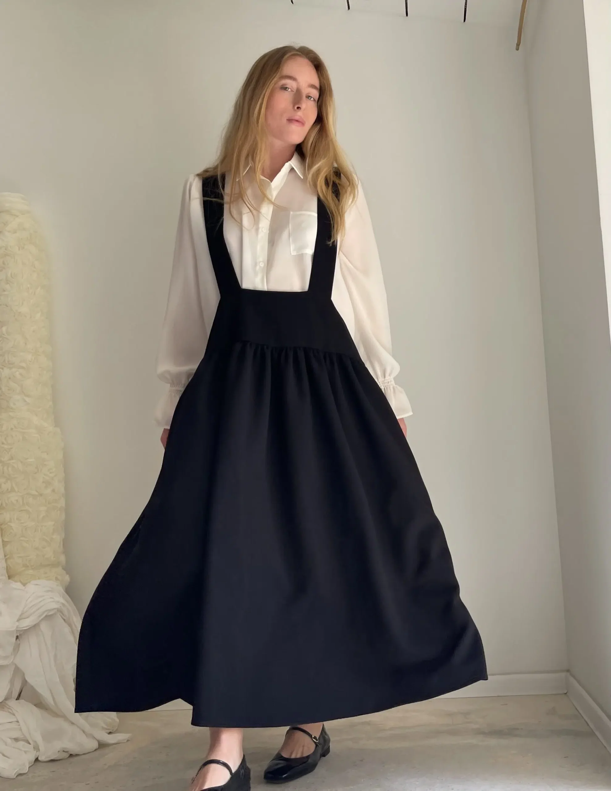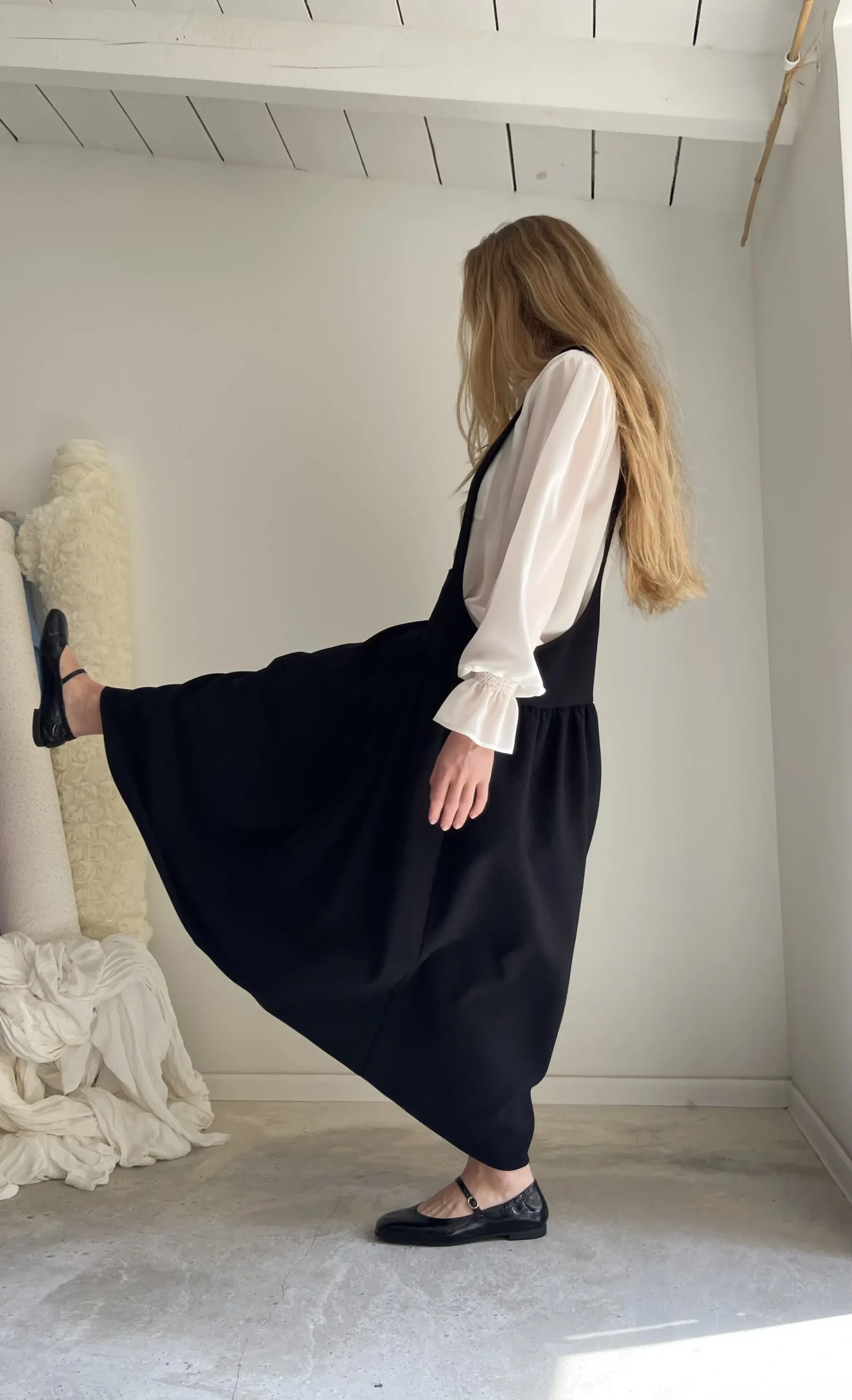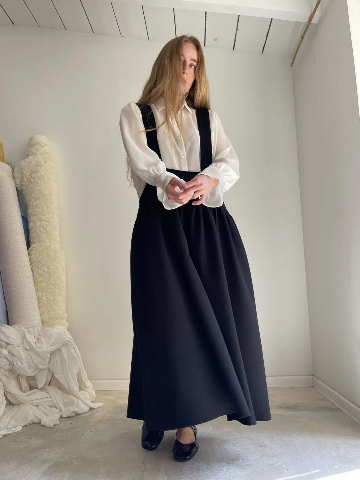 Jupe – Salopette dans un sublime crêpe noir. Création unique, à la coupe japonisante et minimaliste. Poches, non transparente. PIÈCE UNIQUE