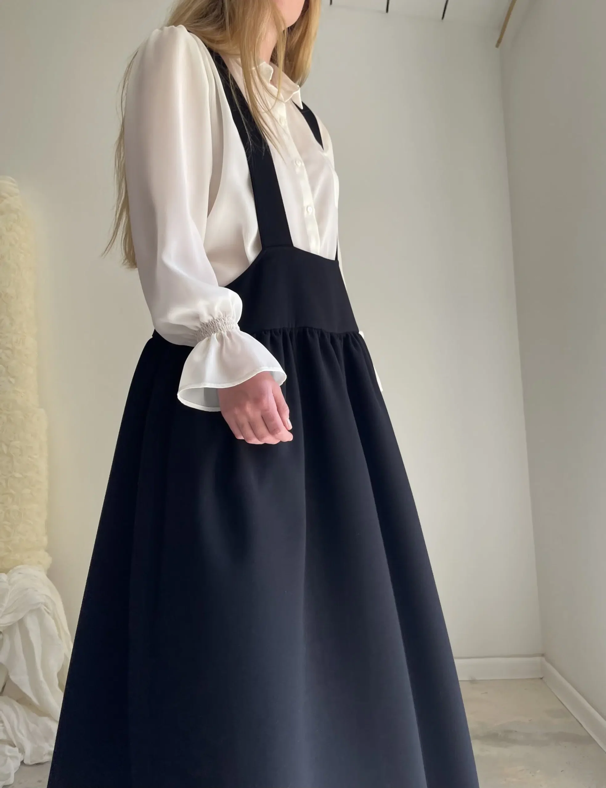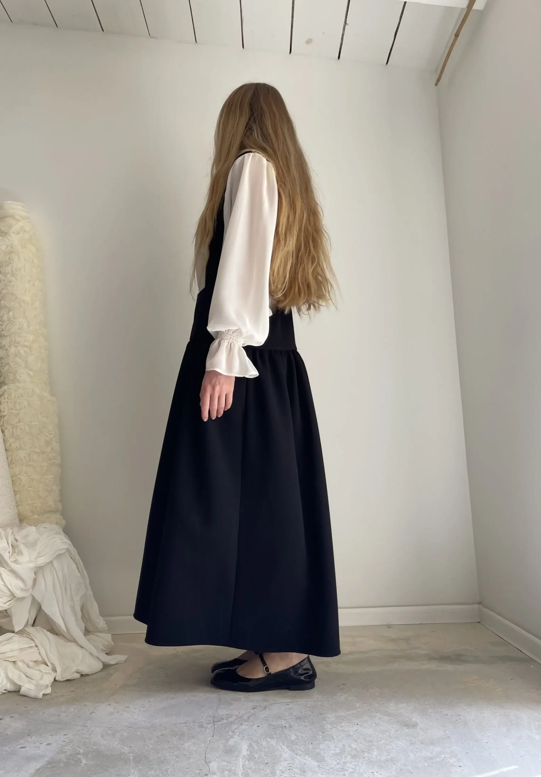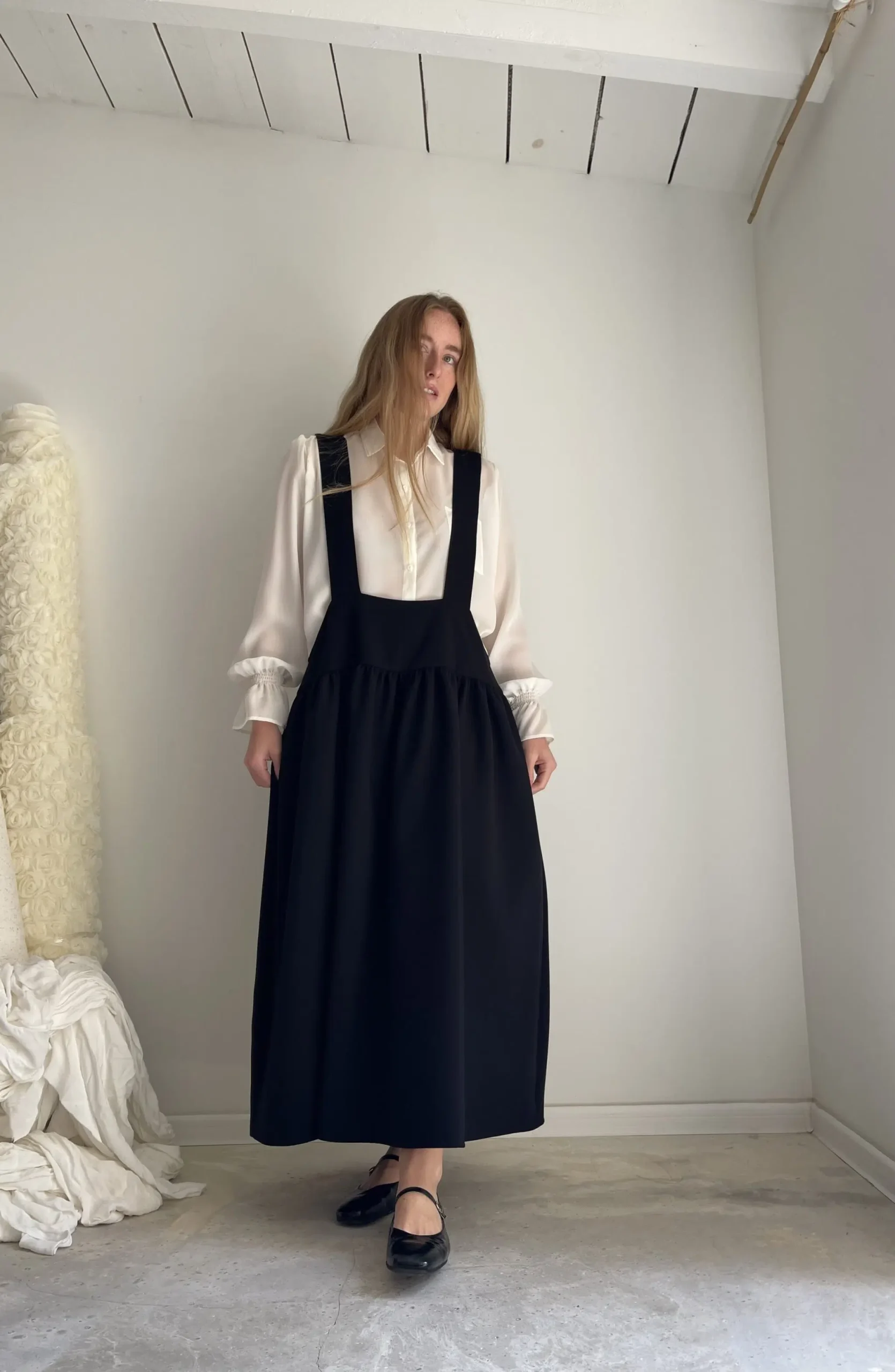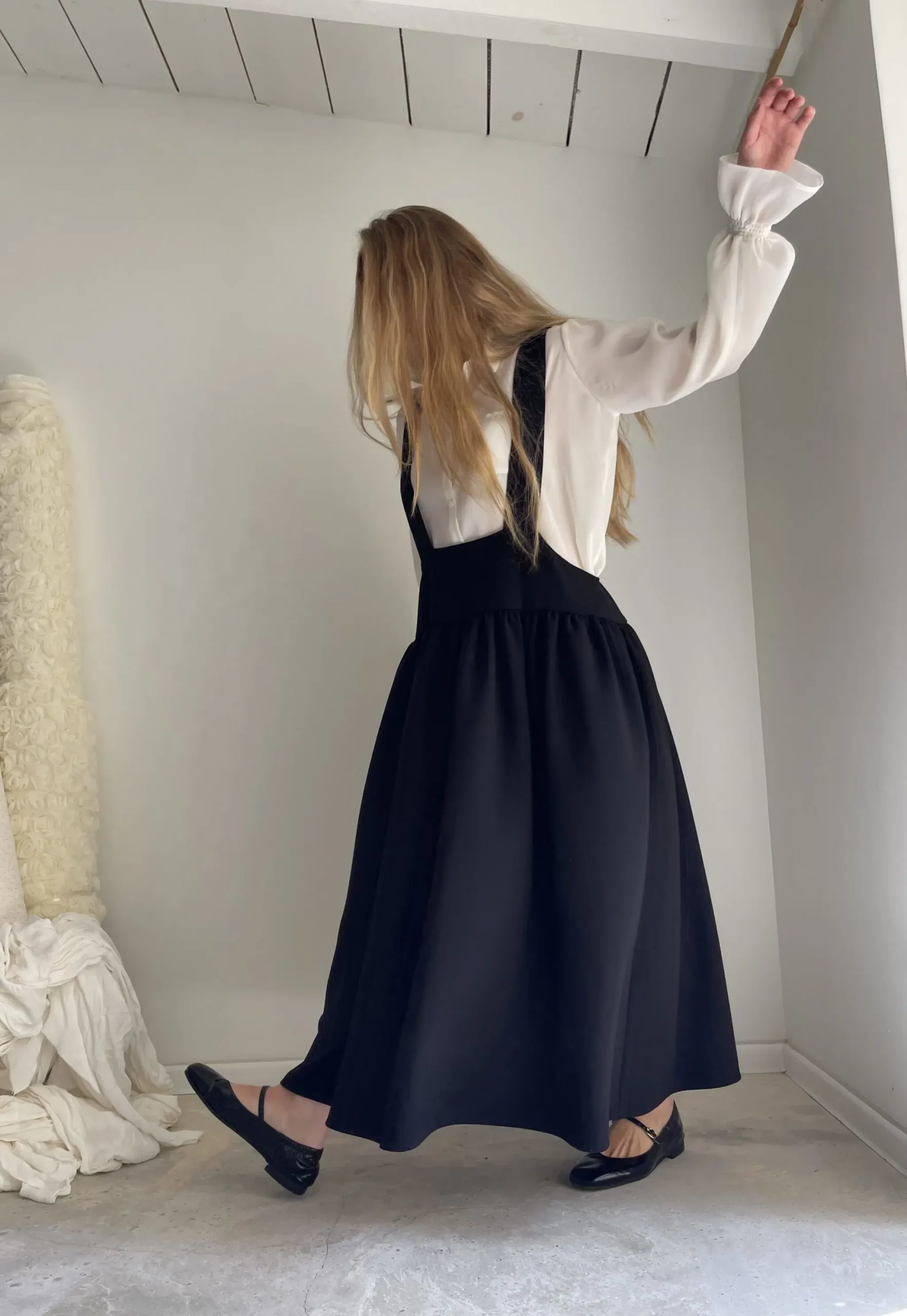 Jupe – Salopette dans un sublime crêpe noir. Création unique, à la coupe japonisante et minimaliste. Poches, non transparente. PIÈCE UNIQUE