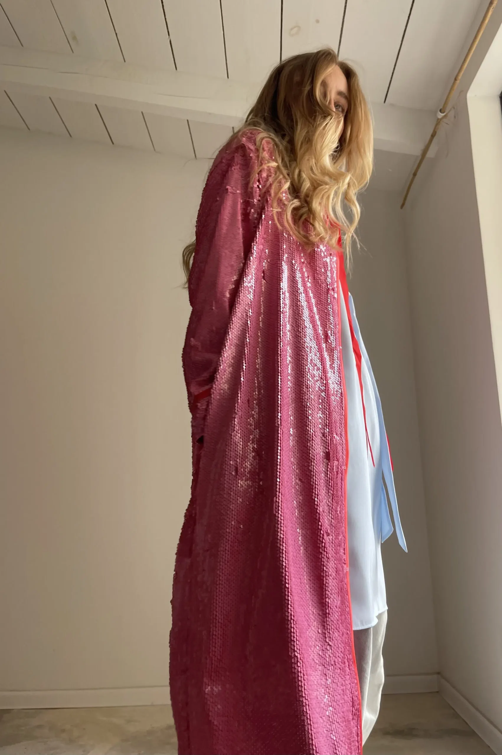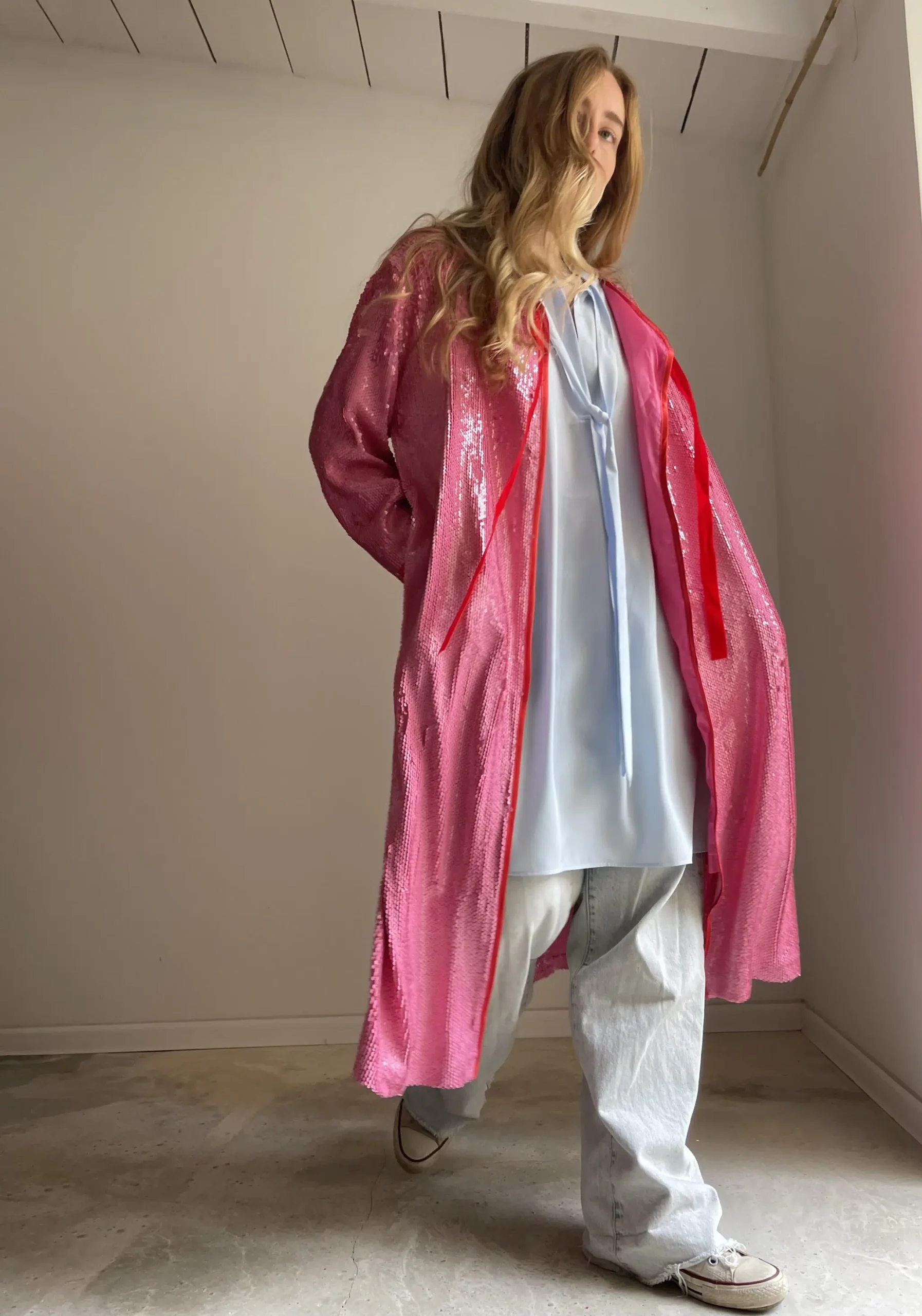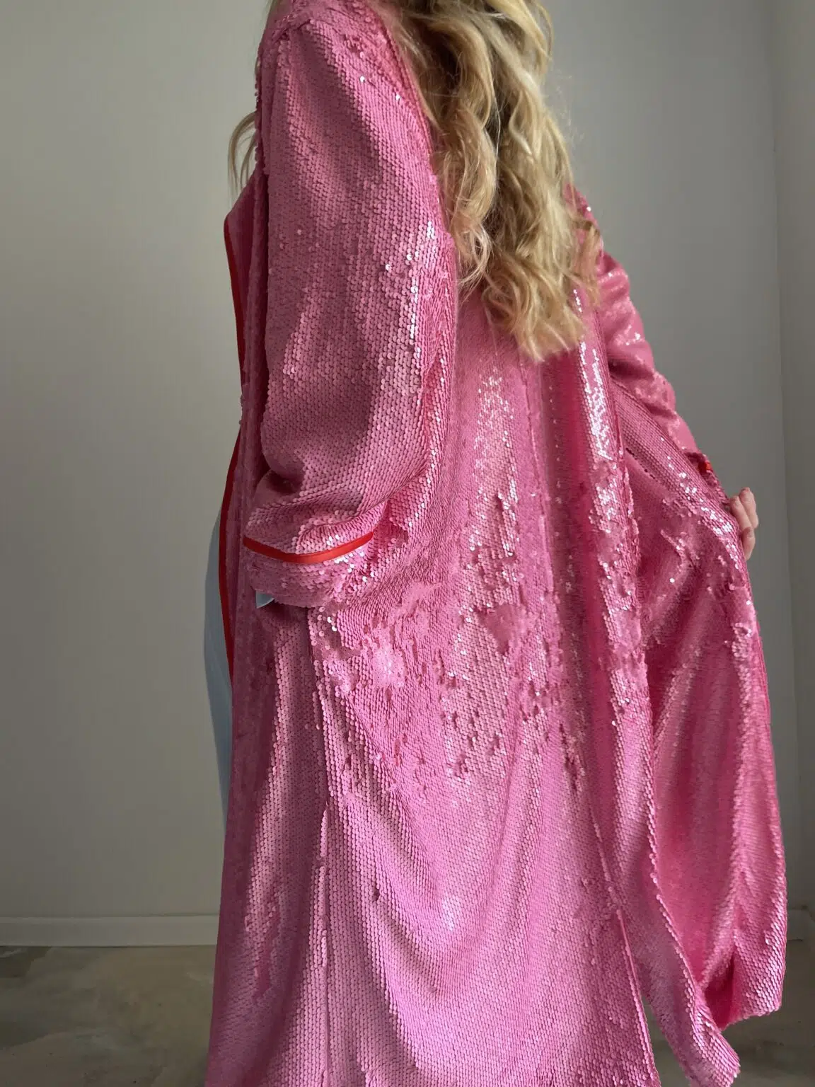 Manteau sequins rose, entièrement doublé et souligné de biais rouge, ruban velours ras au col, poches latérales. Une PIÈCE UNIQUE et ORIGINALE ! Un COUP DE CŒUR !