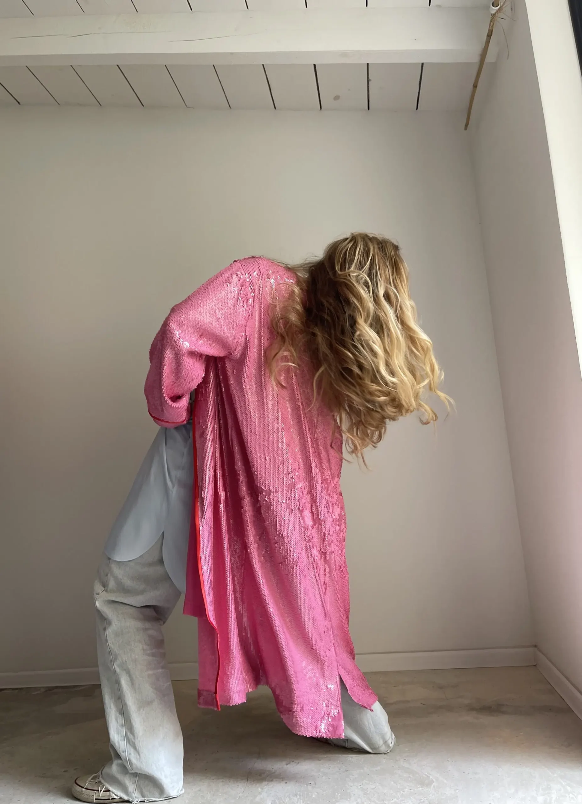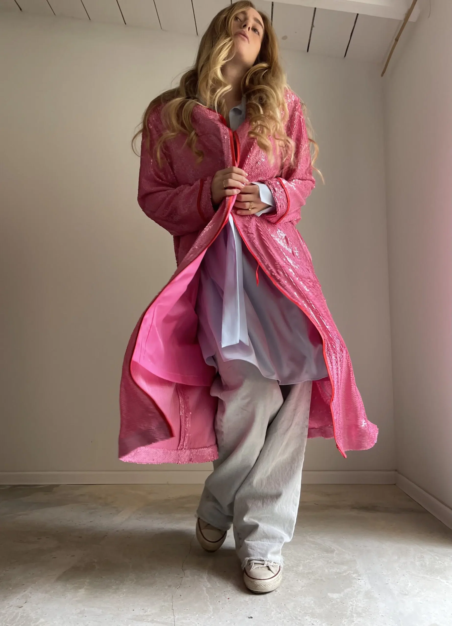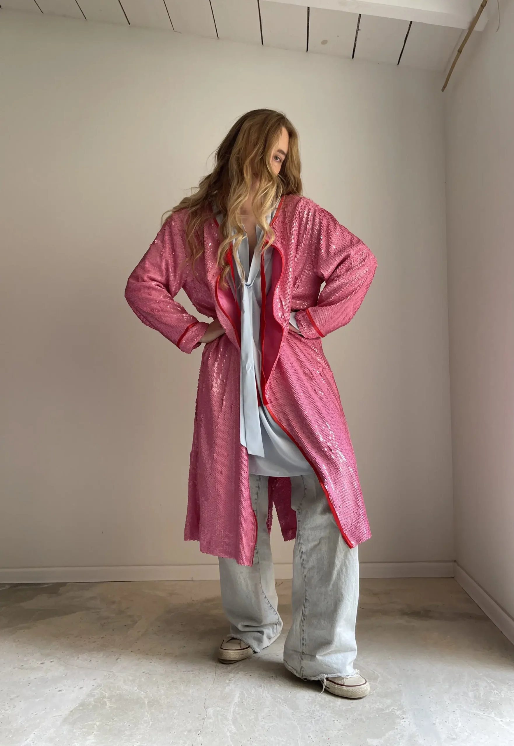 Manteau sequins rose, entièrement doublé et souligné de biais rouge, ruban velours ras au col, poches latérales. Une PIÈCE UNIQUE et ORIGINALE ! Un COUP DE CŒUR !
