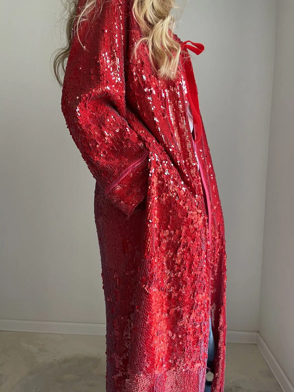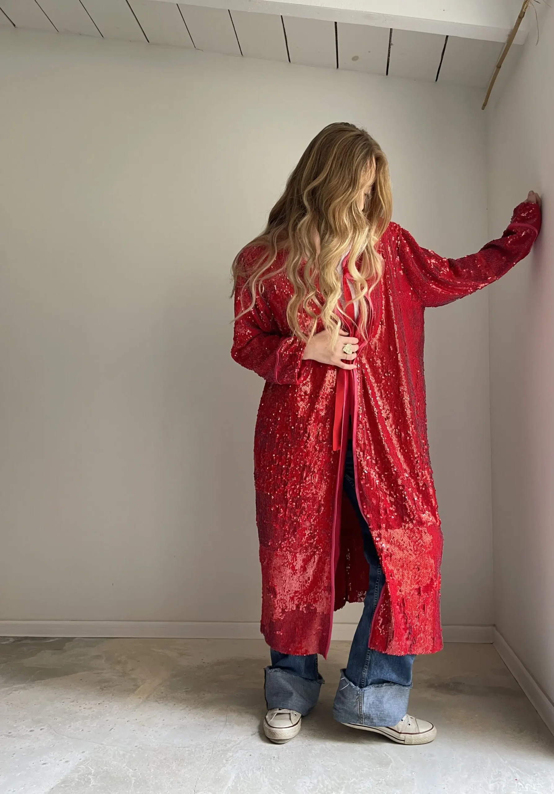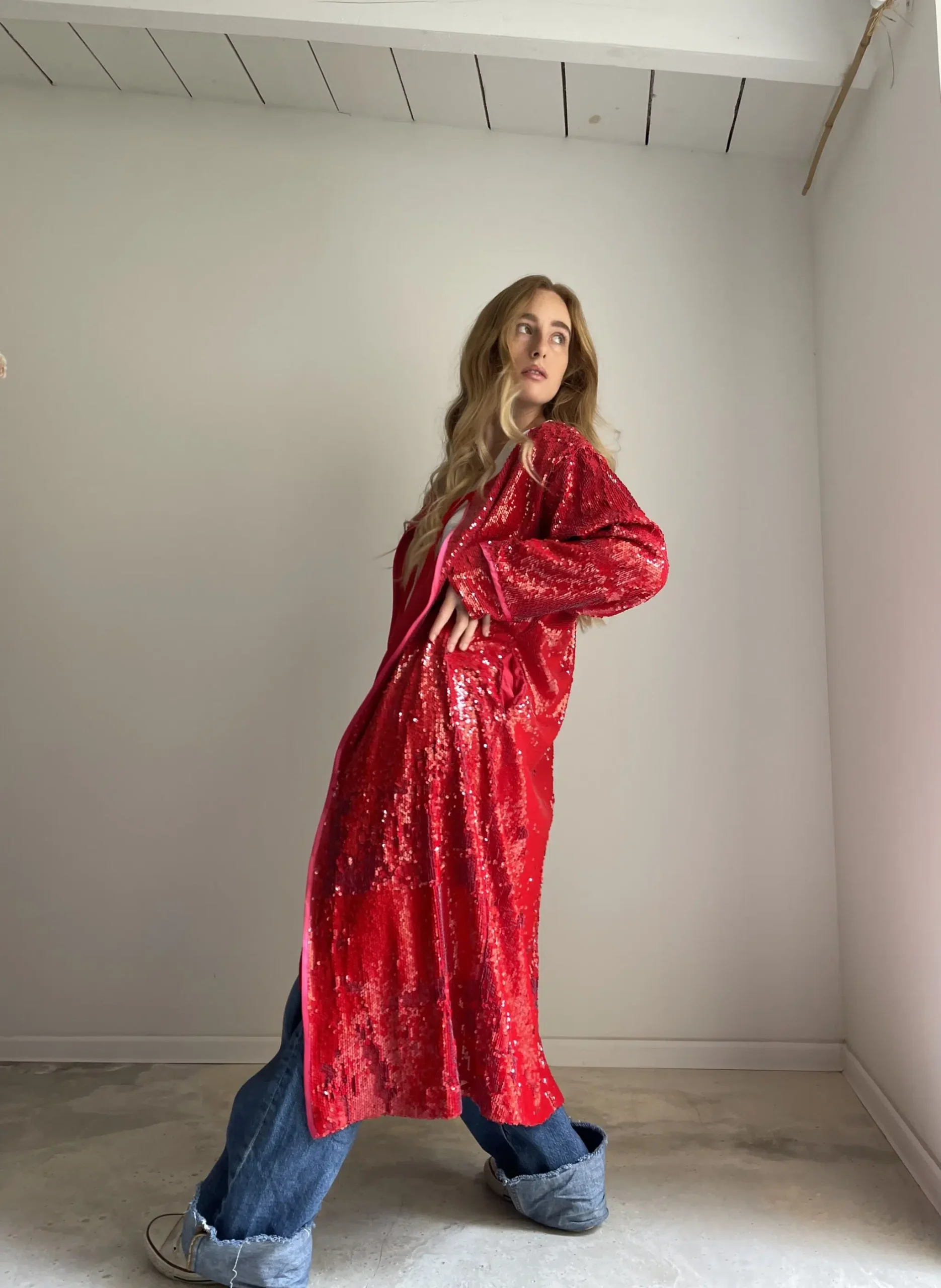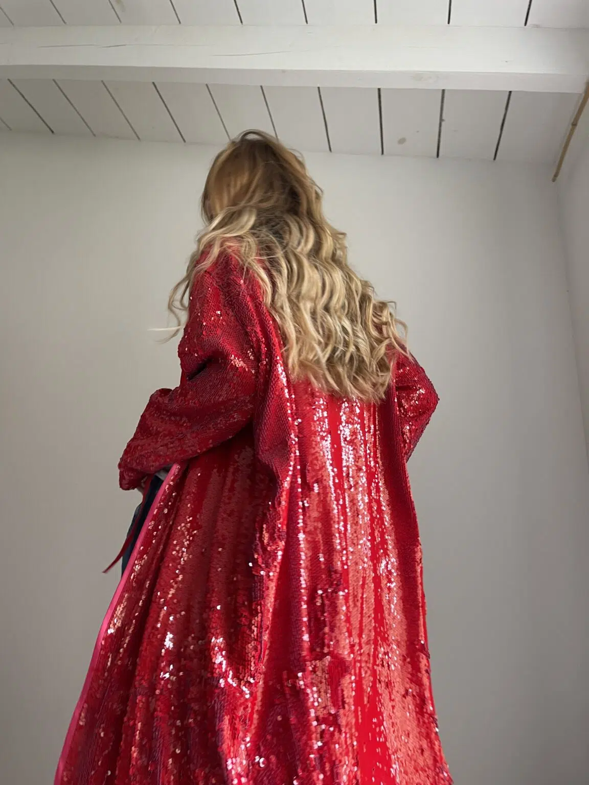 Manteau sequins rouge, entièrement doublé et souligné de biais rose pâle, ruban velours ras au col, poches latérales. Une PIÈCE UNIQUE et ORIGINALE ! Un COUP DE CŒUR !