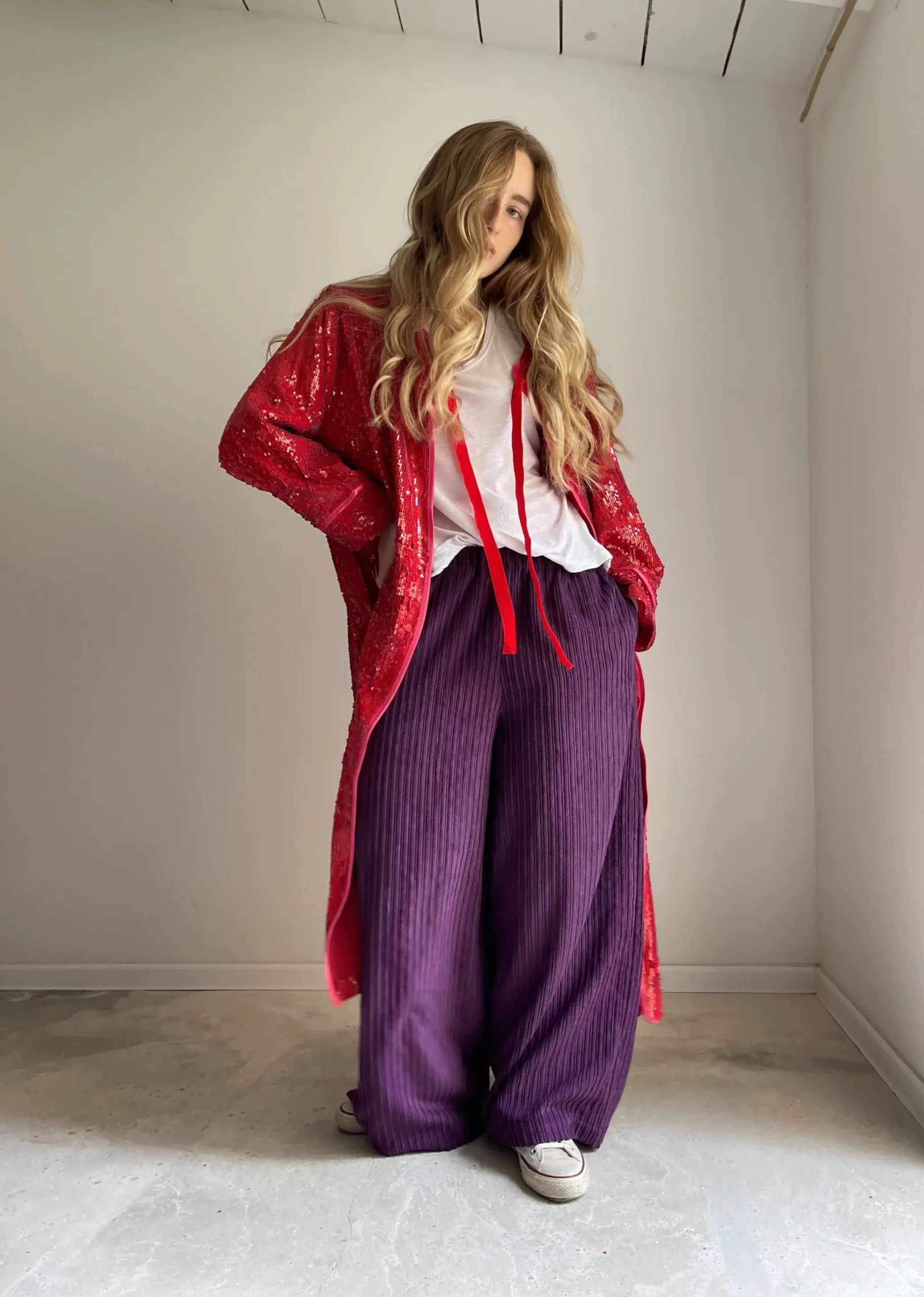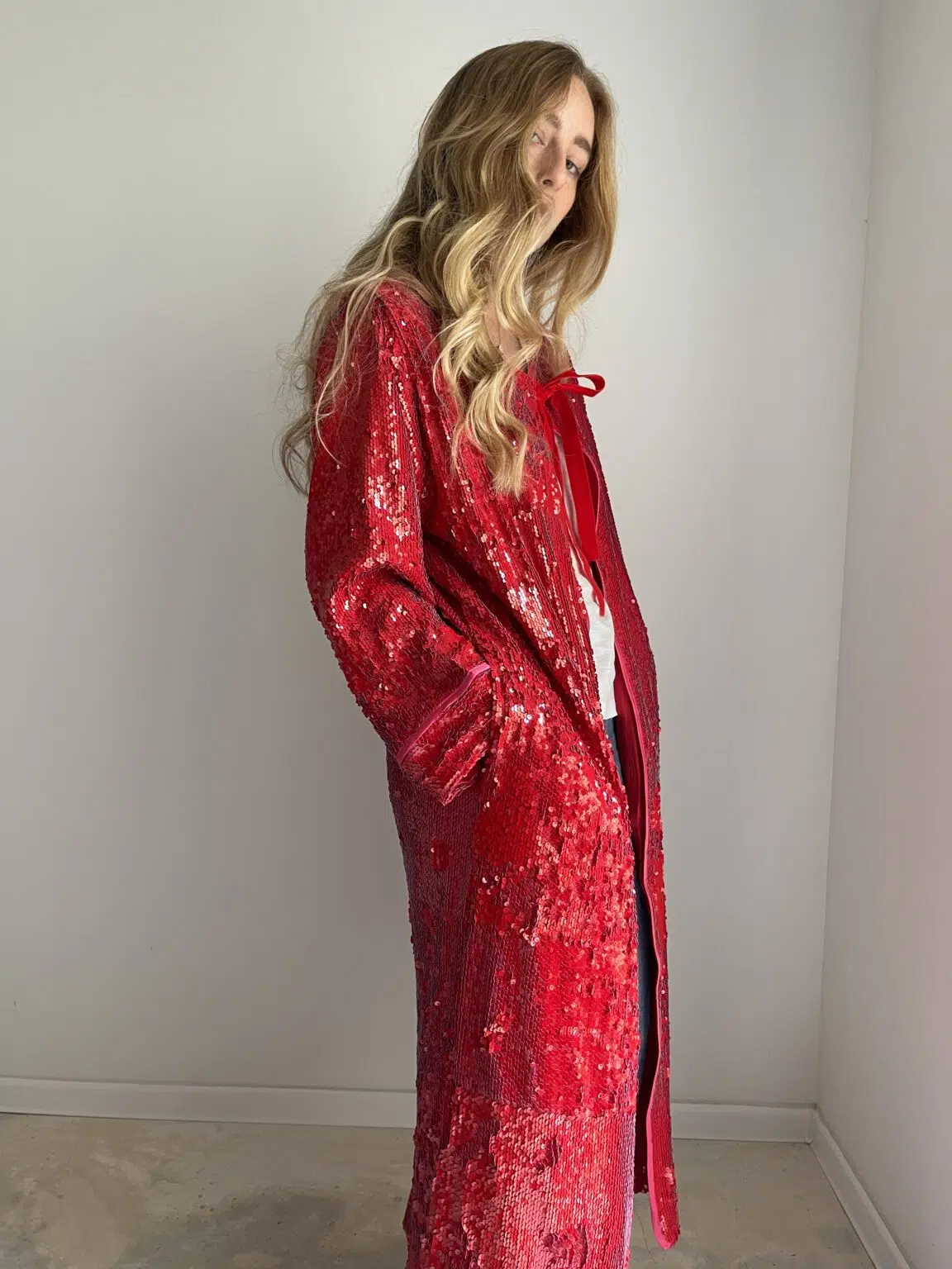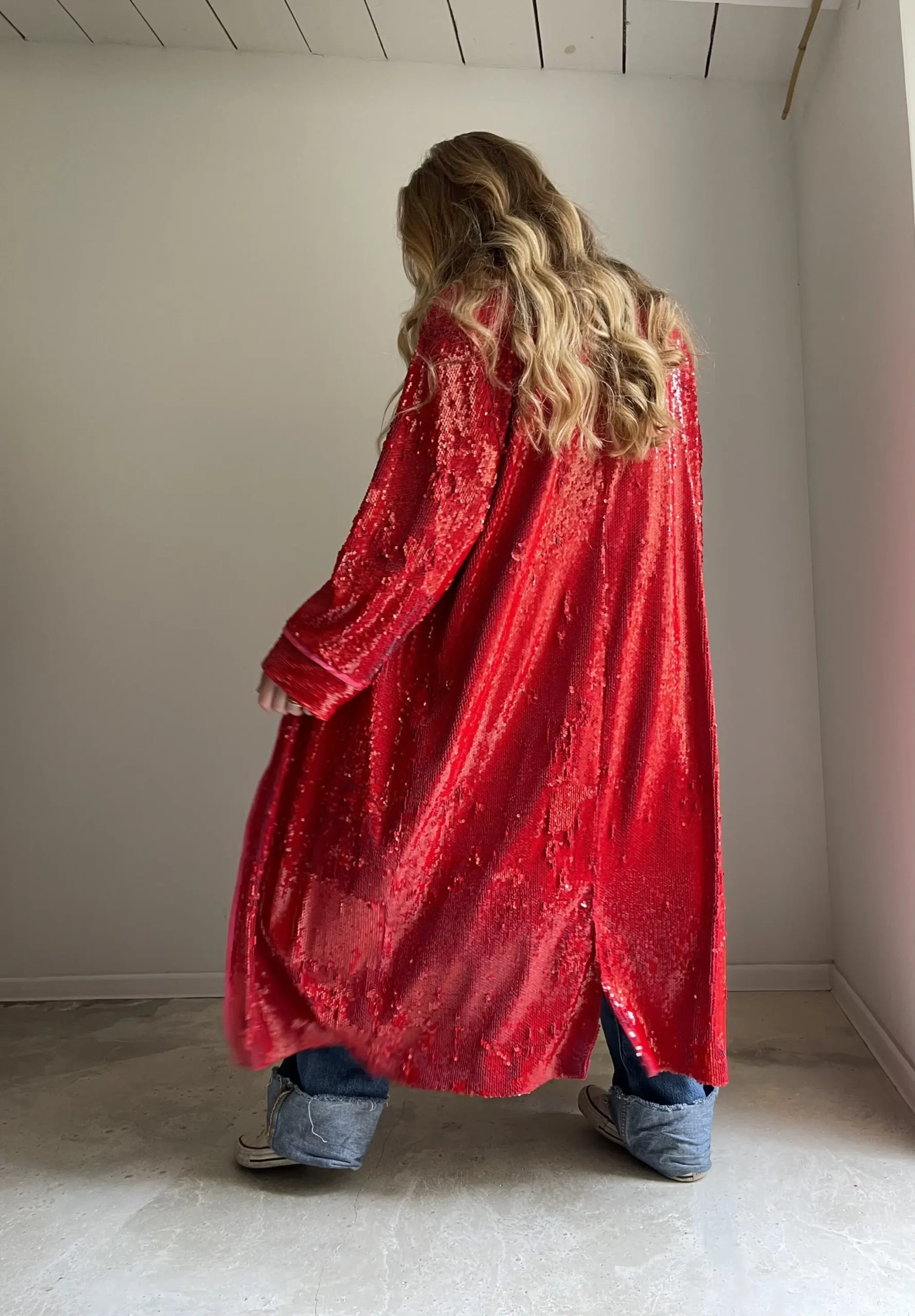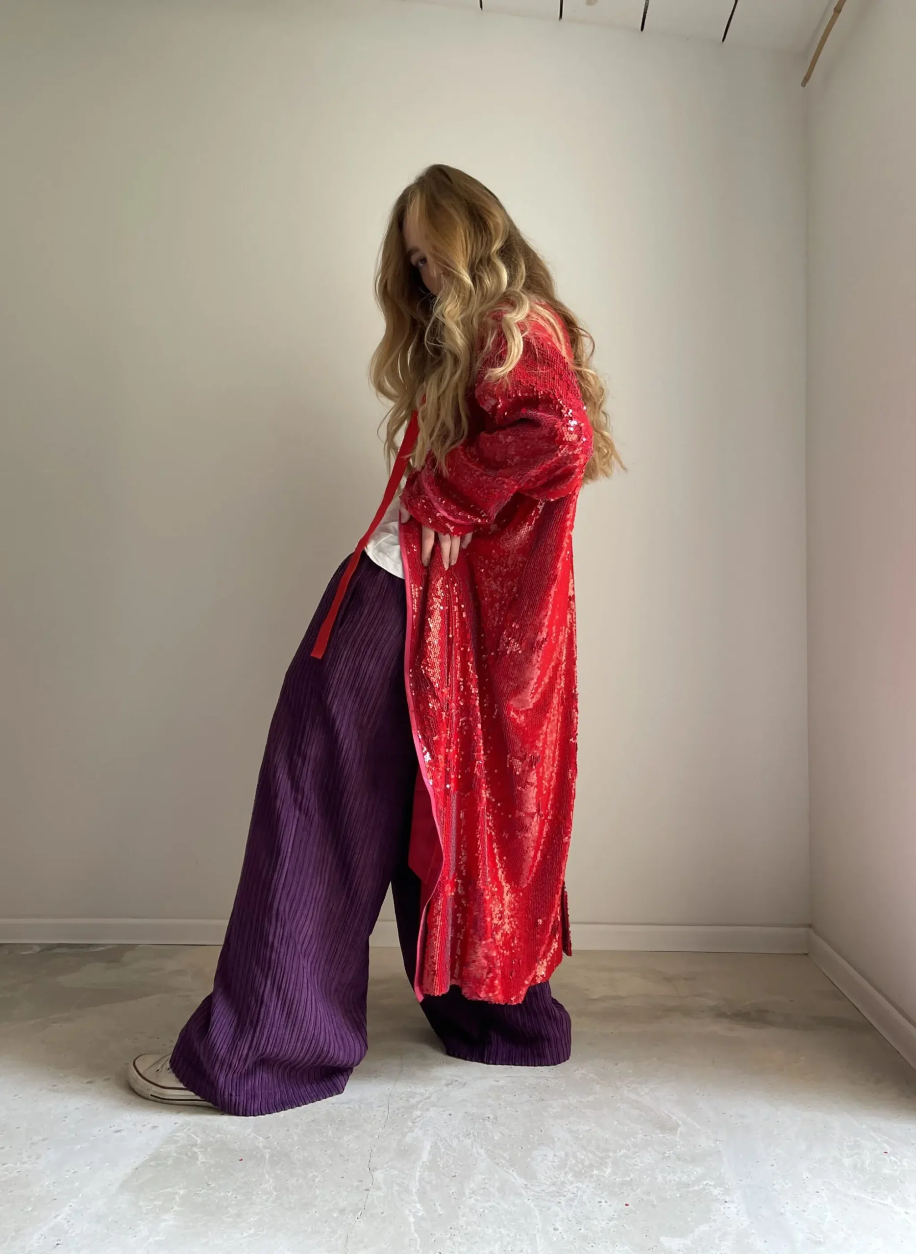 Manteau sequins rouge, entièrement doublé et souligné de biais rose pâle, ruban velours ras au col, poches latérales. Une PIÈCE UNIQUE et ORIGINALE ! Un COUP DE CŒUR !