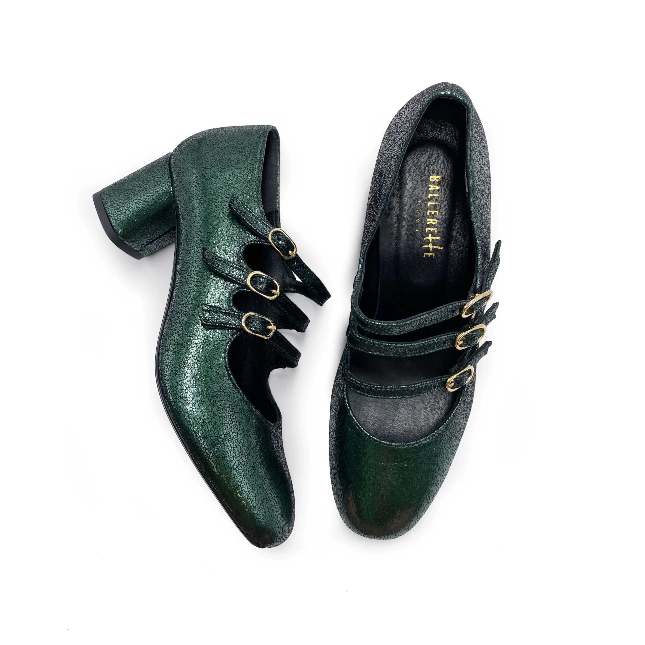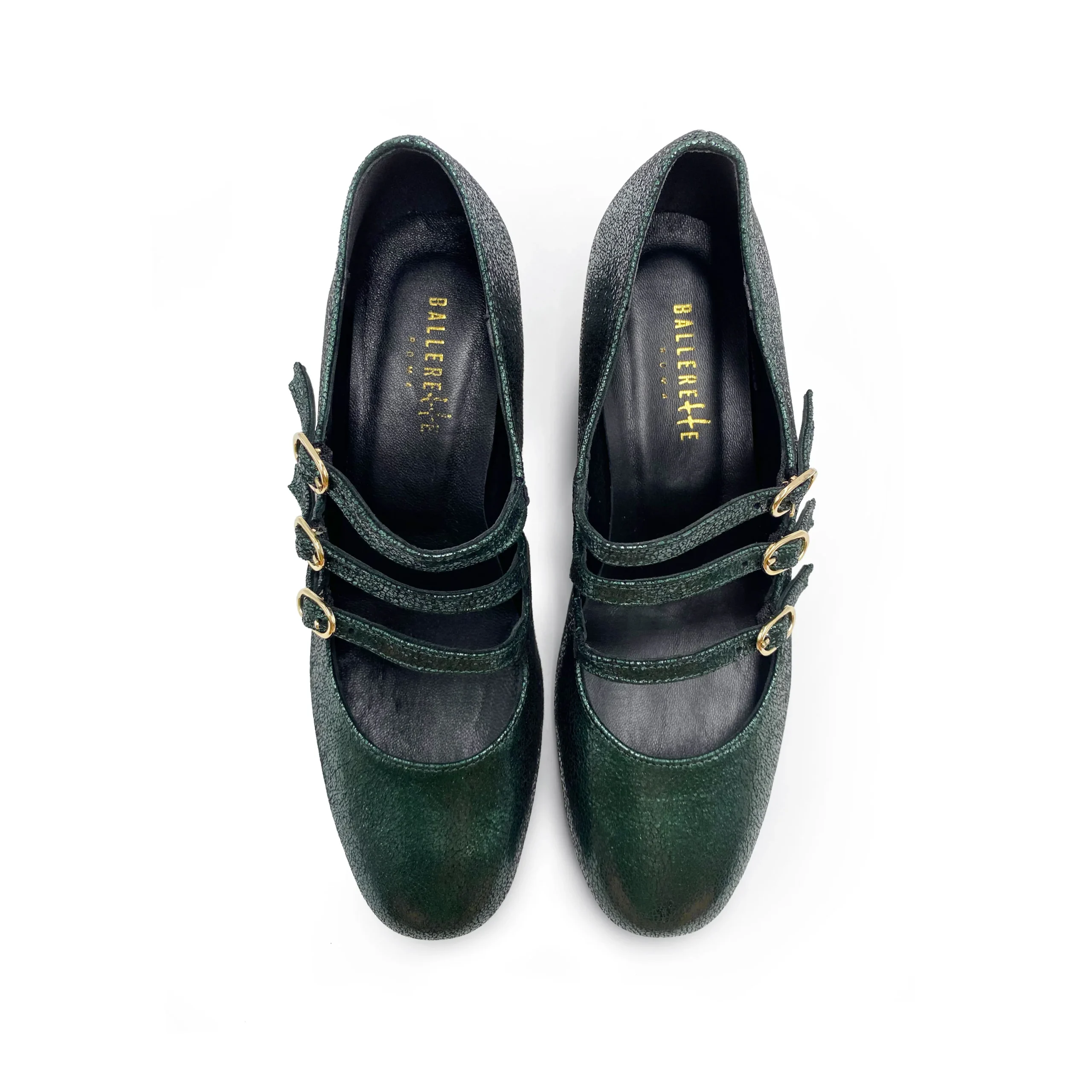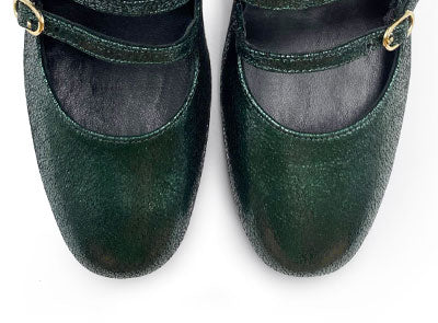 Immancabile nella collezione BallereTTe un modello di Mary Jane dal fascino retrò rivisitato in chiave moderna e accattivante. Le Campidoglio presentano una morbida linea con punta tonda e tre cinturini che adornano il dorso del piede e rendono la ballerina ben salda nella camminata. Poggiano su un comodo tacco di 5 cm dalla forma cilindrica che slancia la silhouette e dona maggiore stabilità. Con questa versione in camoscio laminato color verde immaginiamo un vestito fondo blu notte con dettagli color senape, una palette di colori in tono con le nuance perfette per questa stagione.