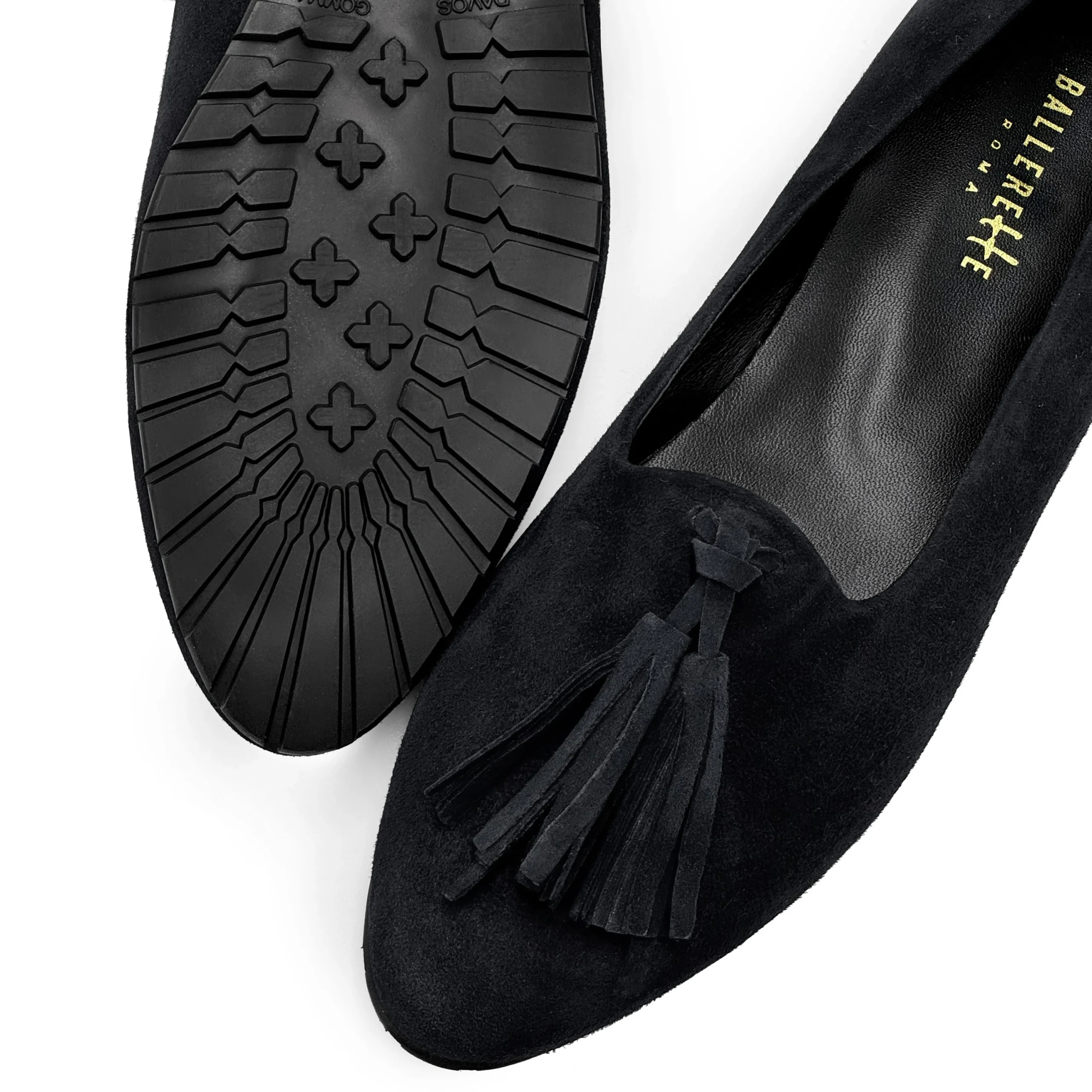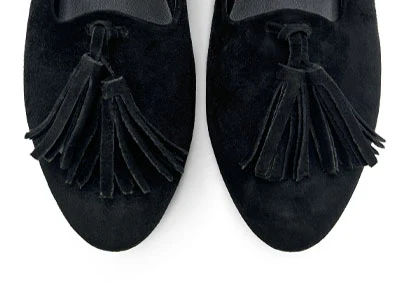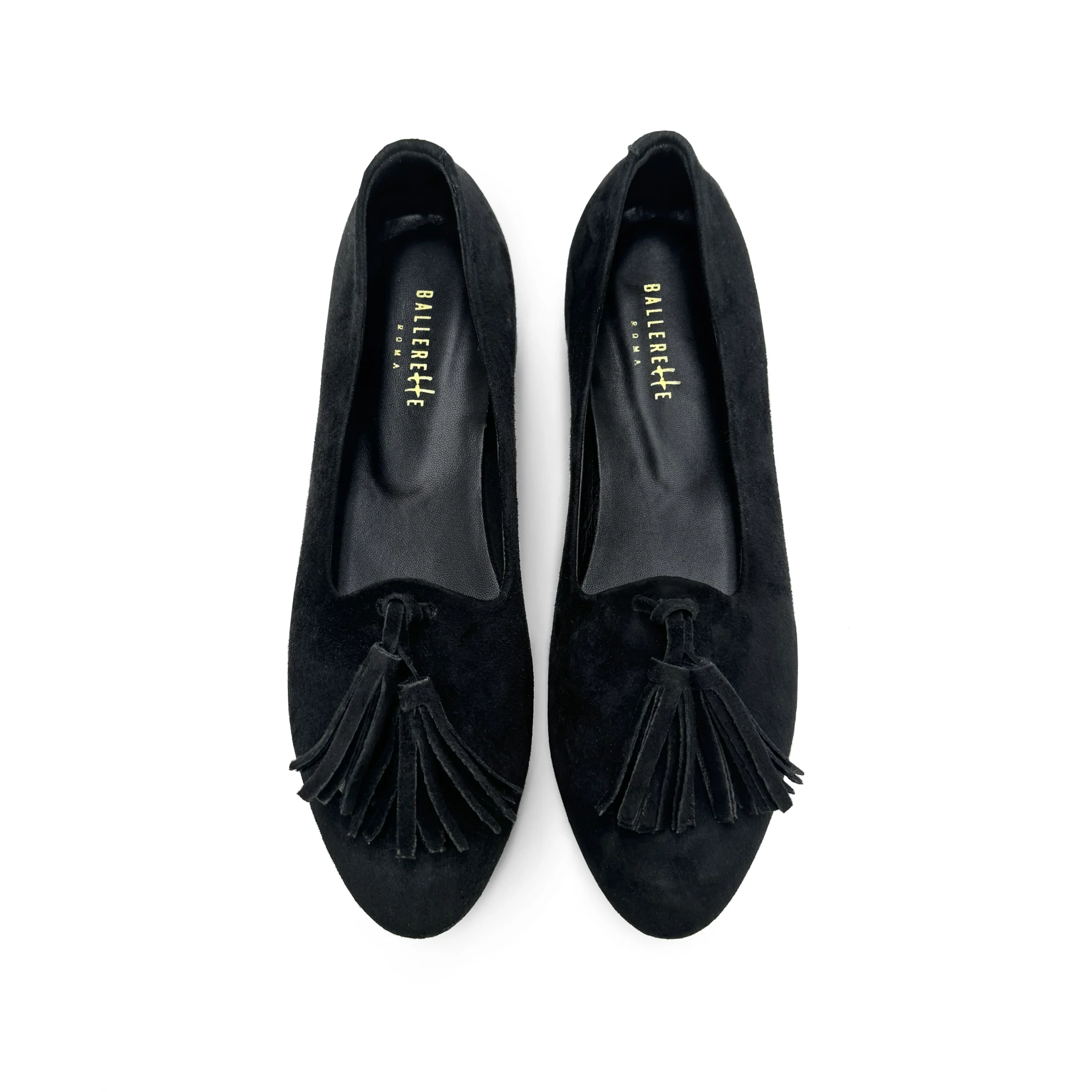 I Monserrato sono mocassini da donna in pelle scamosciata con lunghe nappine in tinta perfetti per chi desidera un paio di scarpe comode e trendy. L’interno è foderato in pelle di colore nero e la suola è realizzata in gomma leggera con trama carrarmato. La loro particolare forma armonizza tutta la silhouette e risulta comodamente avvolgente. Questi mocassini neri in camoscio da donna sono un passe-partout di stile capaci di essere indossati in tantissimi modi. Molto eleganti se abbinati ad un tubino bianco per un contrasto di colori minimalista, oppure con un vestito con gonna plissettata in lamé oro per un look più serale.