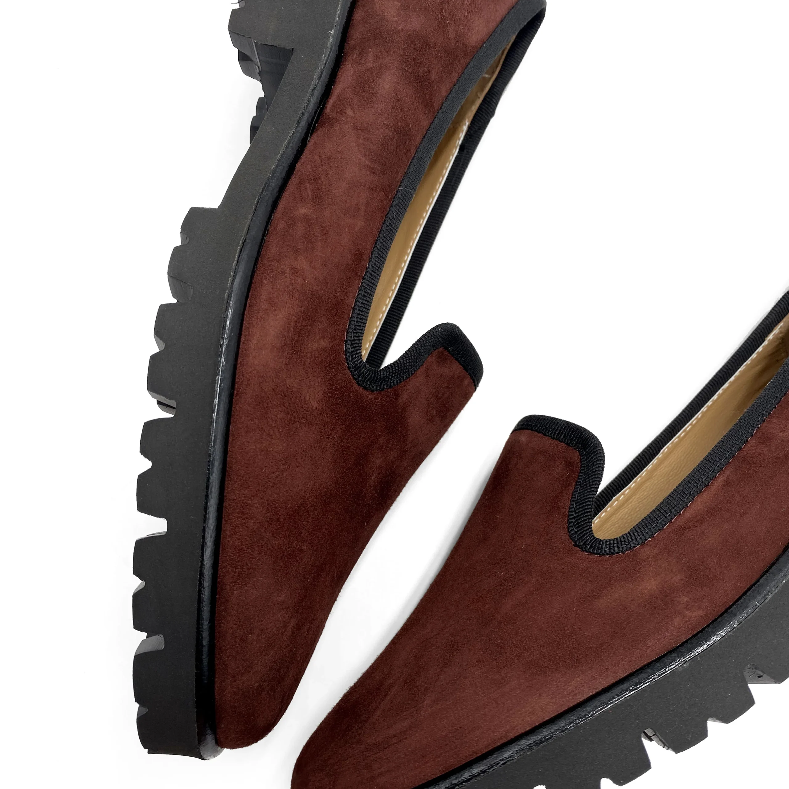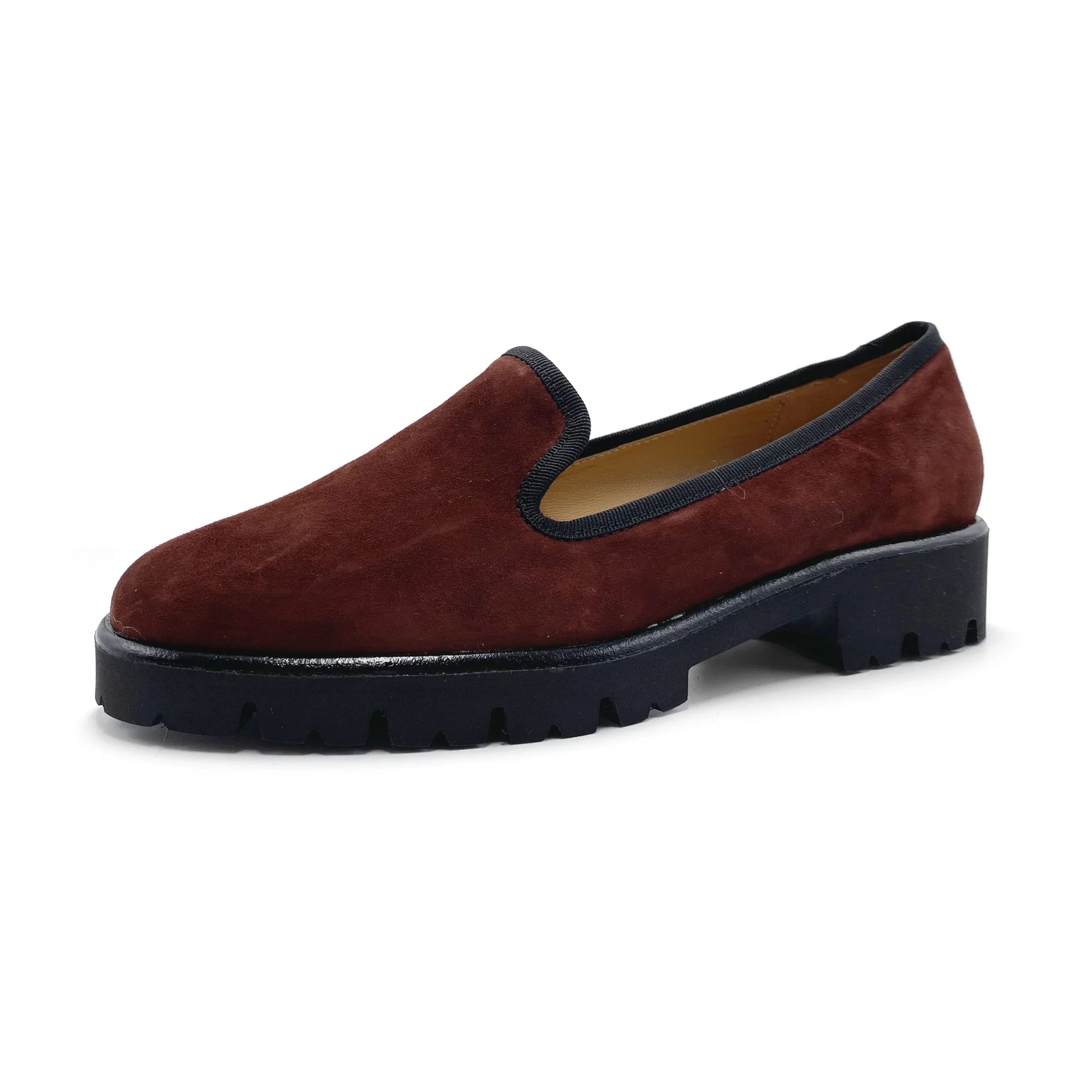 Nemorense è il mocassino platform con para carrarmato in gomma, ideale per i mesi invernali. Ha un design affusolato, con punta tonda e abbraccia delicatamente il piiede grazie alla mascherina leggermente alta. L’interno in pelle e il morbido soletto imbottito donano una calzata confertevole e piacevole nella camminata. Questa variante di colore bordeaux in pelle scamosciata ha il gros grain nero a contrasto che circonda tutto il bordo della scarpa. La disinvoltura che i mocassini conferiscono ai look formali è la chiave con cui indossarli accompagnando gli abiti invernali. Un pantalone a gamba dritta in velluto a costine di colore blu e un dolcevita sui toni del grigio ti faranno sentire al caldo e sempre con un look really cool.