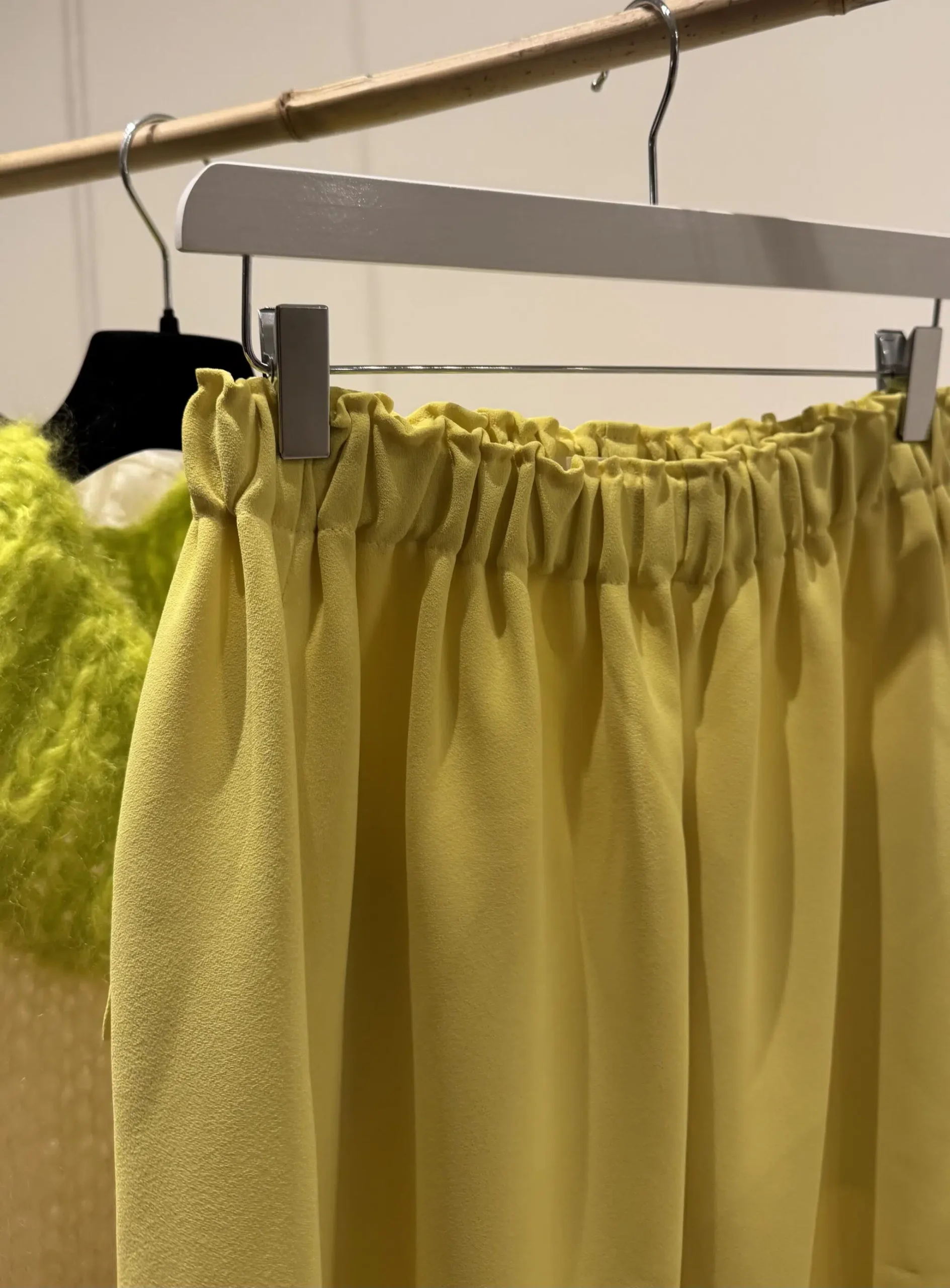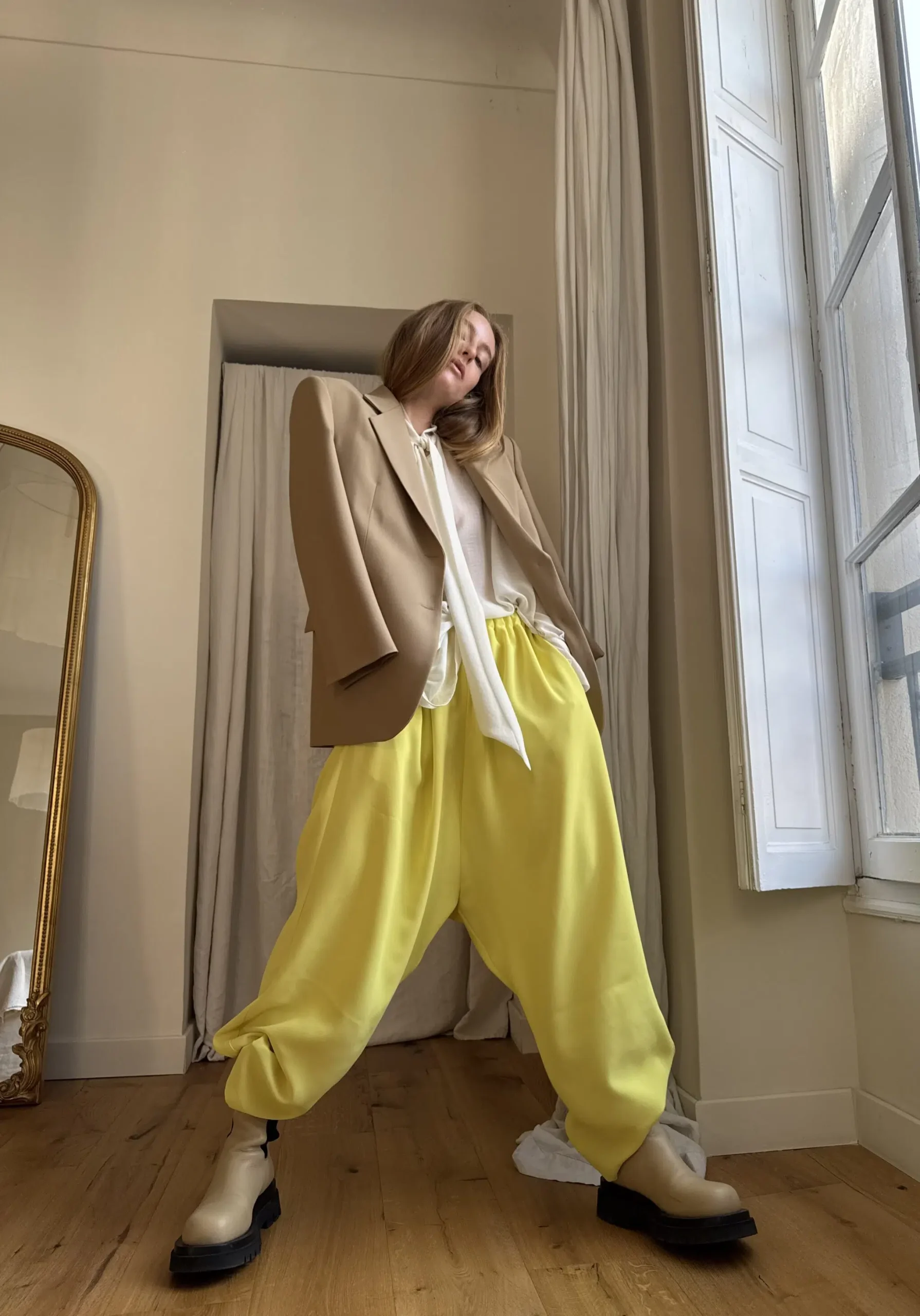 Pantalon « GASTON » en crêpe jaune fluo. Taille sur élastique, poches latérales. Poches plaquées à rabat au dos. Une coupe unisexe, oversize.