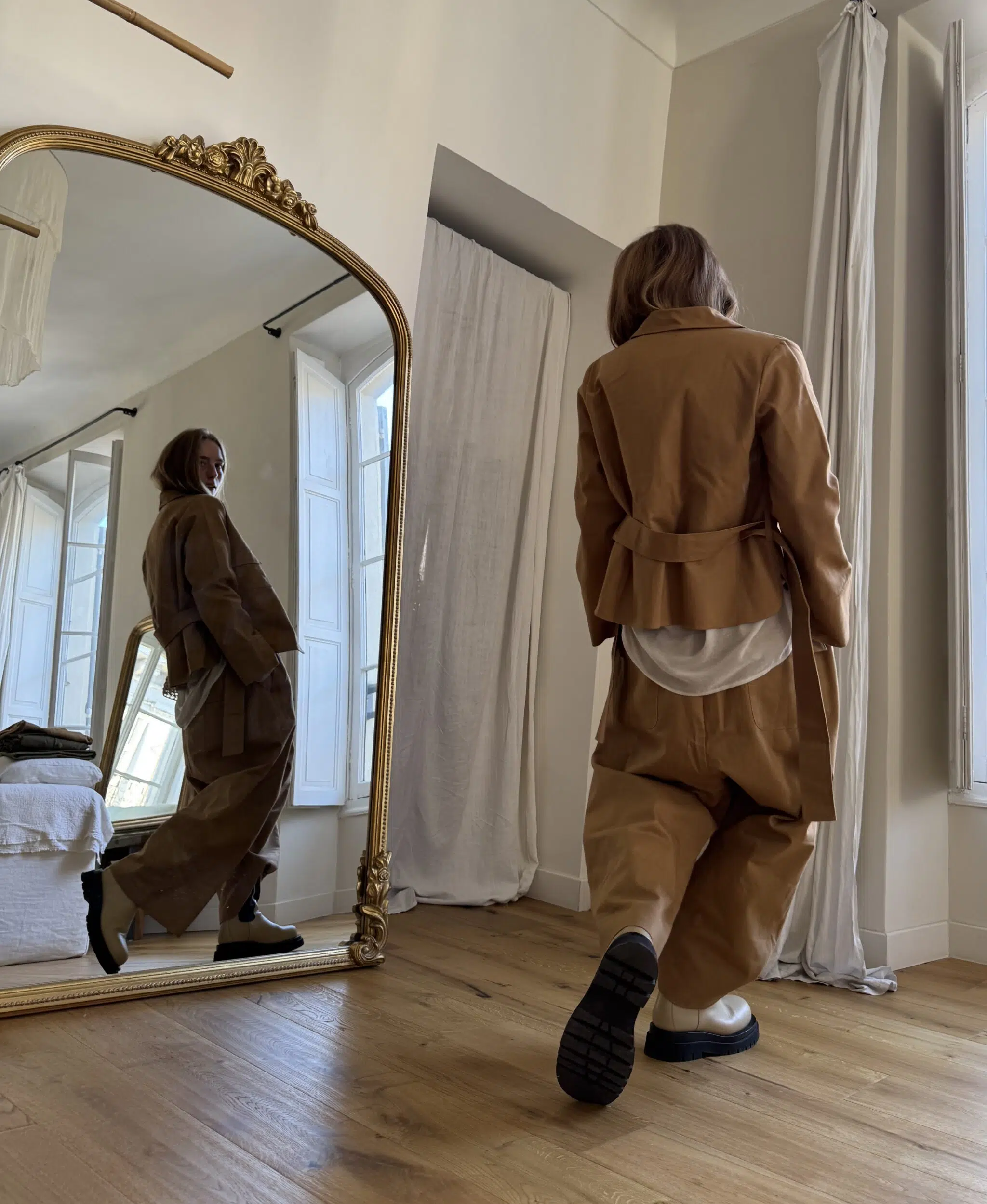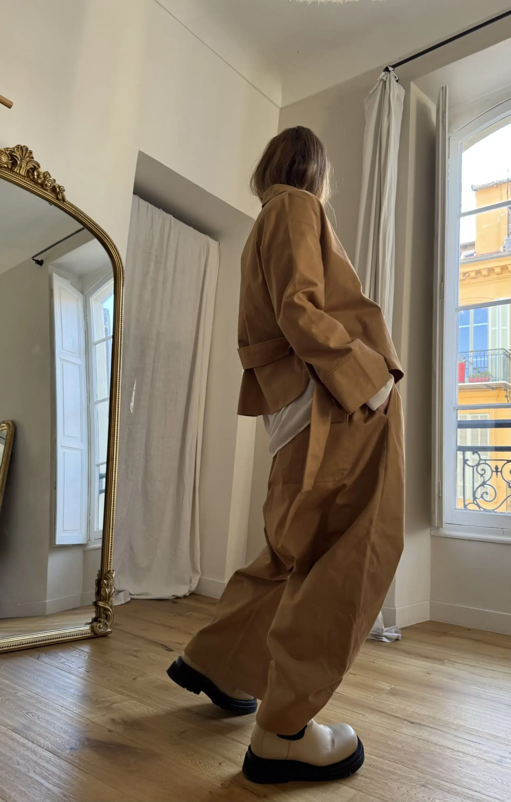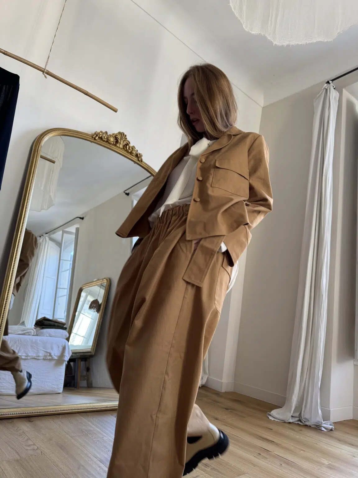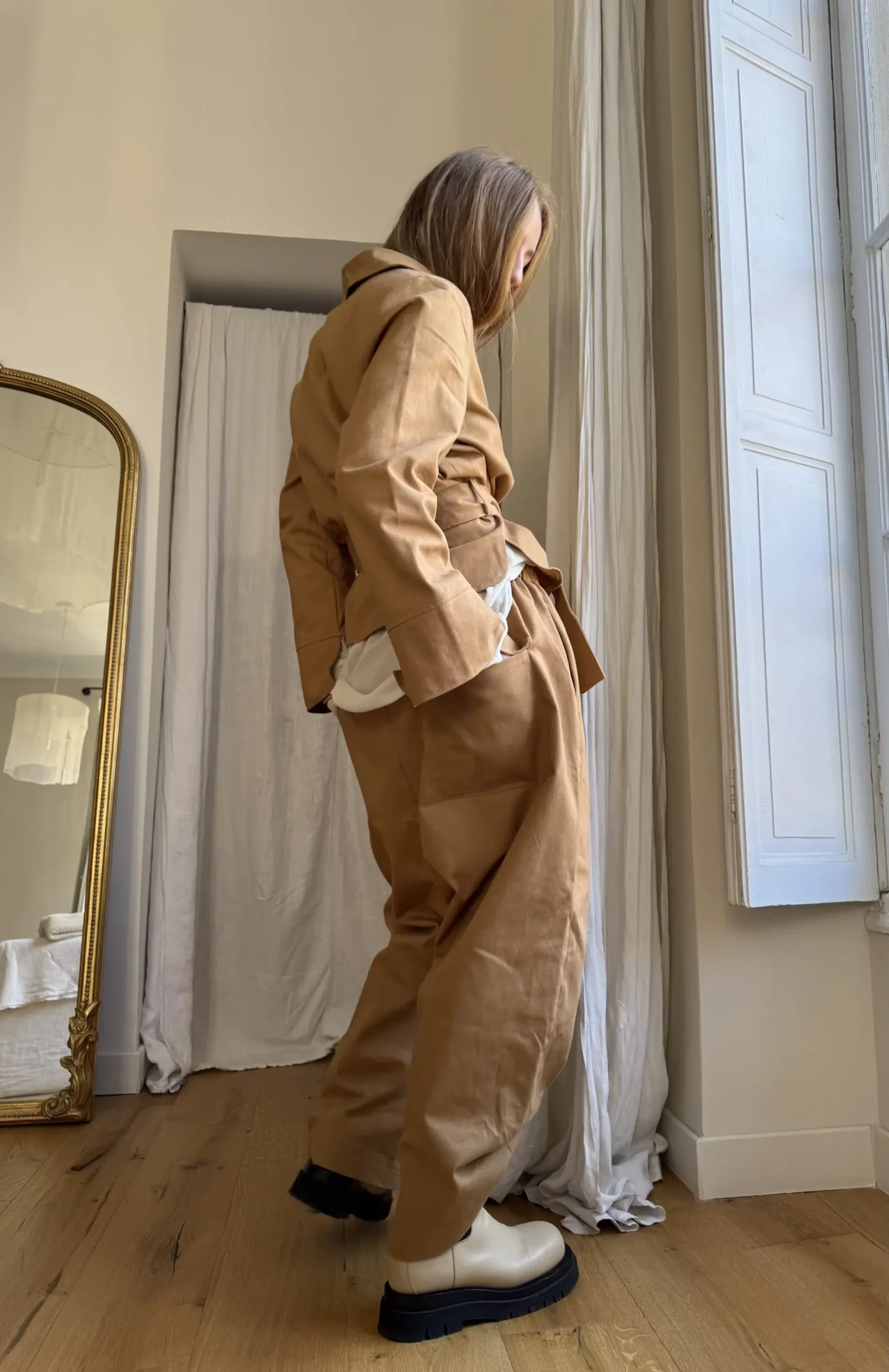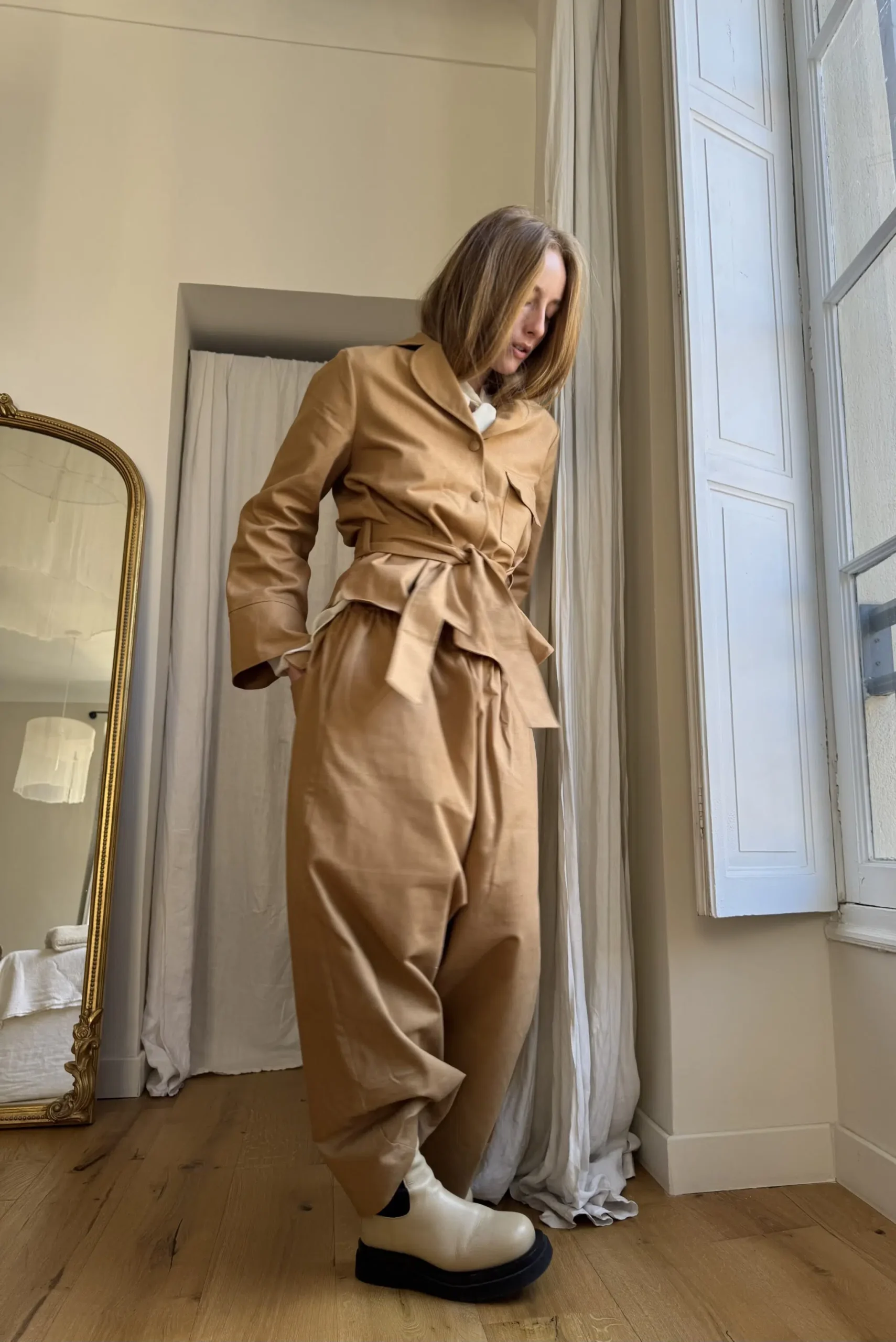 Pantalon « GASTON » en gabardine de coton camel. Taille sur élastique, poches latérales. Poches plaquées à rabat au dos. Une coupe unisexe, oversize.