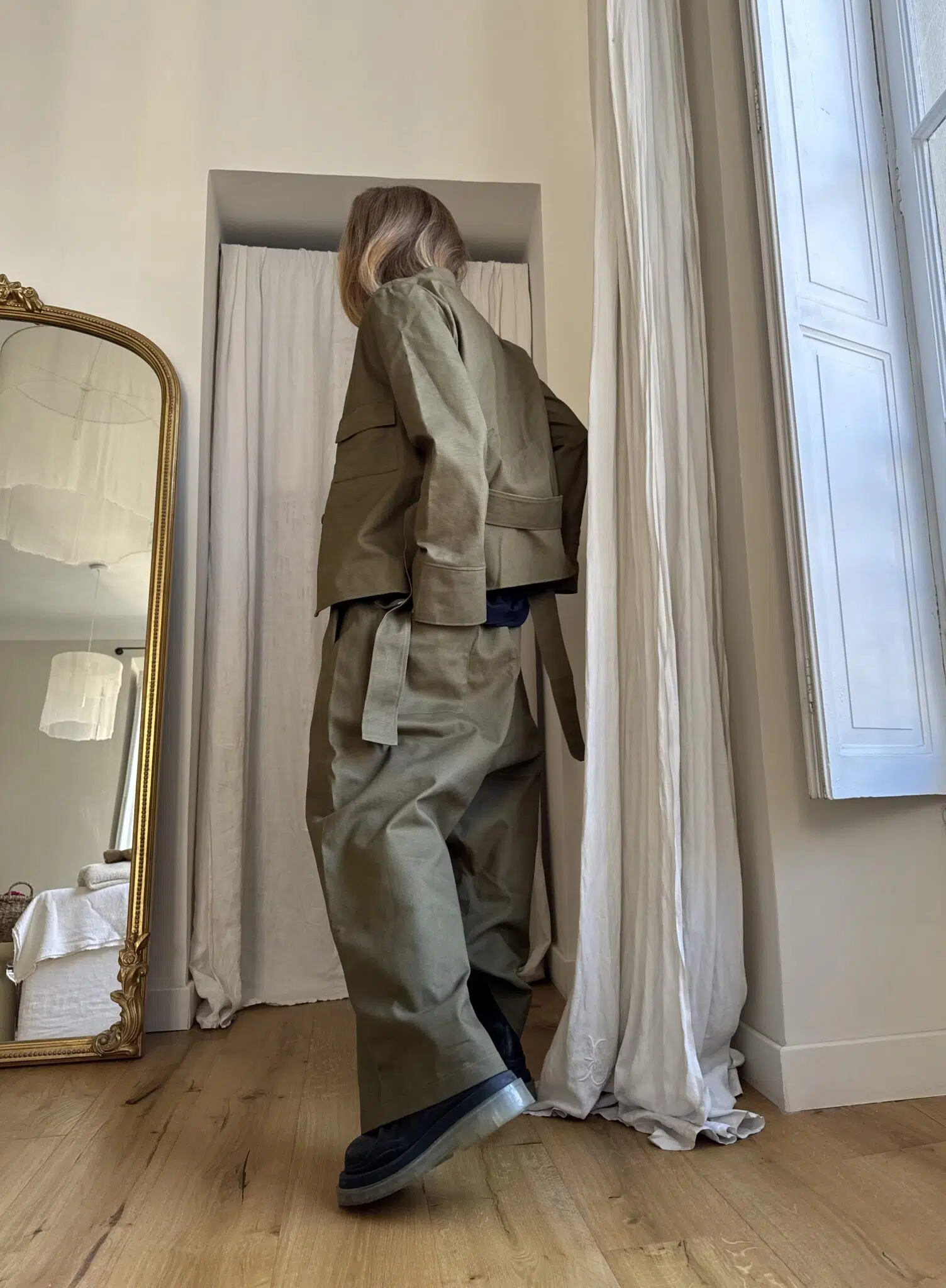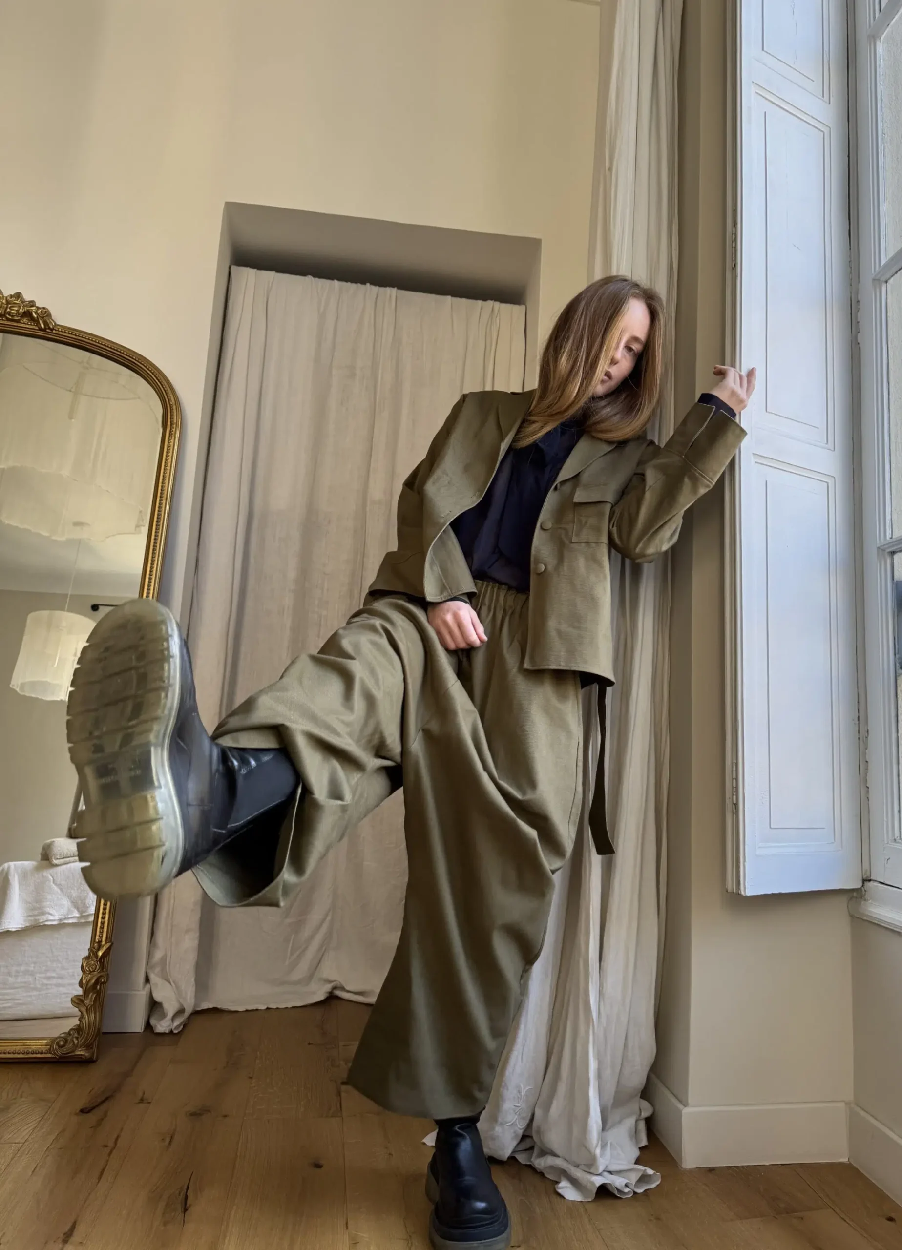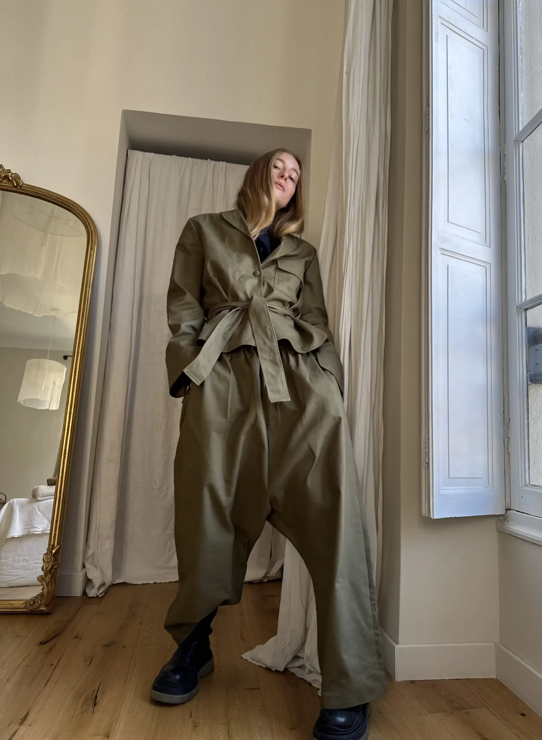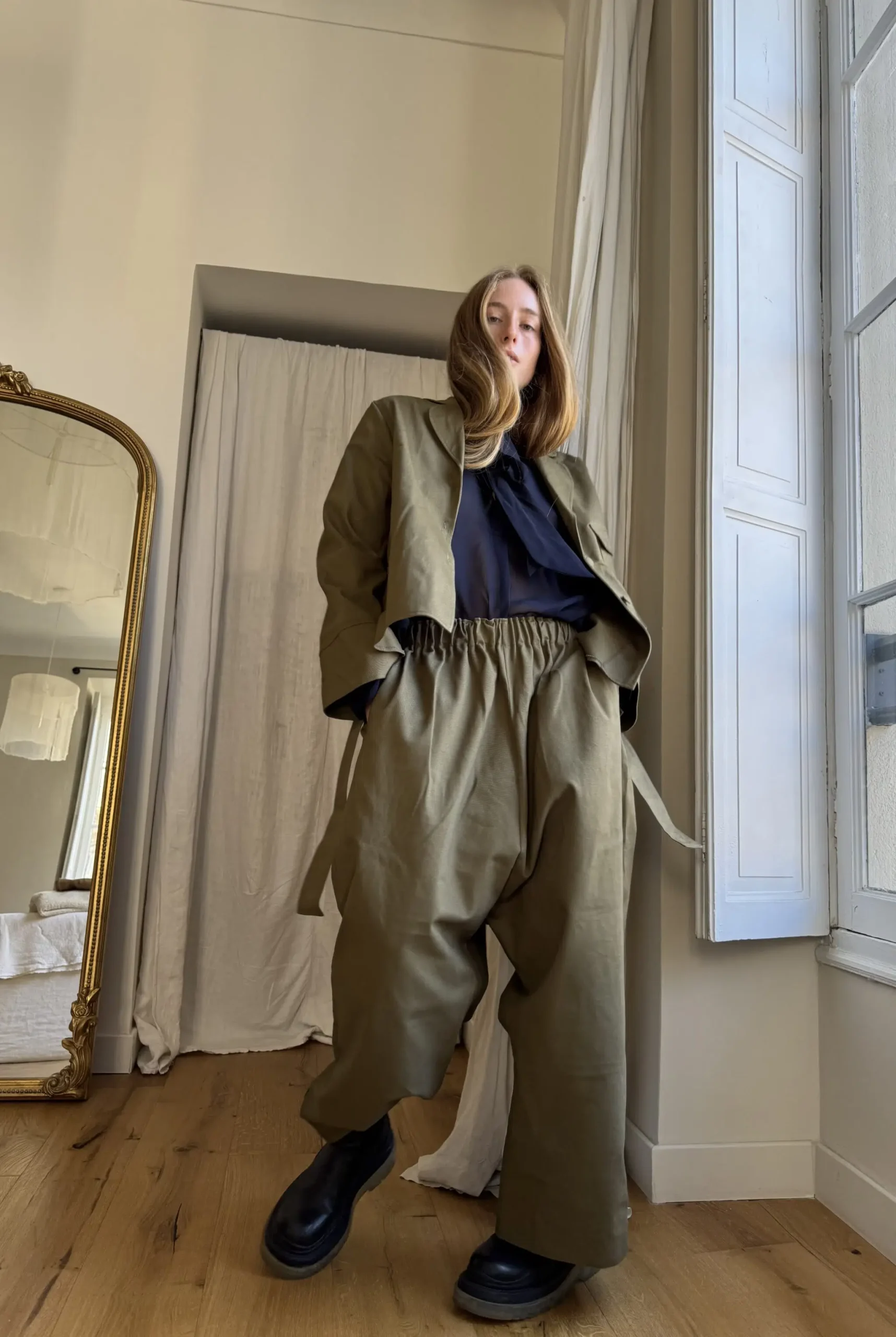 Pantalon « GASTON » en gabardine de coton kaki. Taille sur élastique, poches latérales. Poches plaquées à rabat au dos. Une coupe unisexe, oversize.