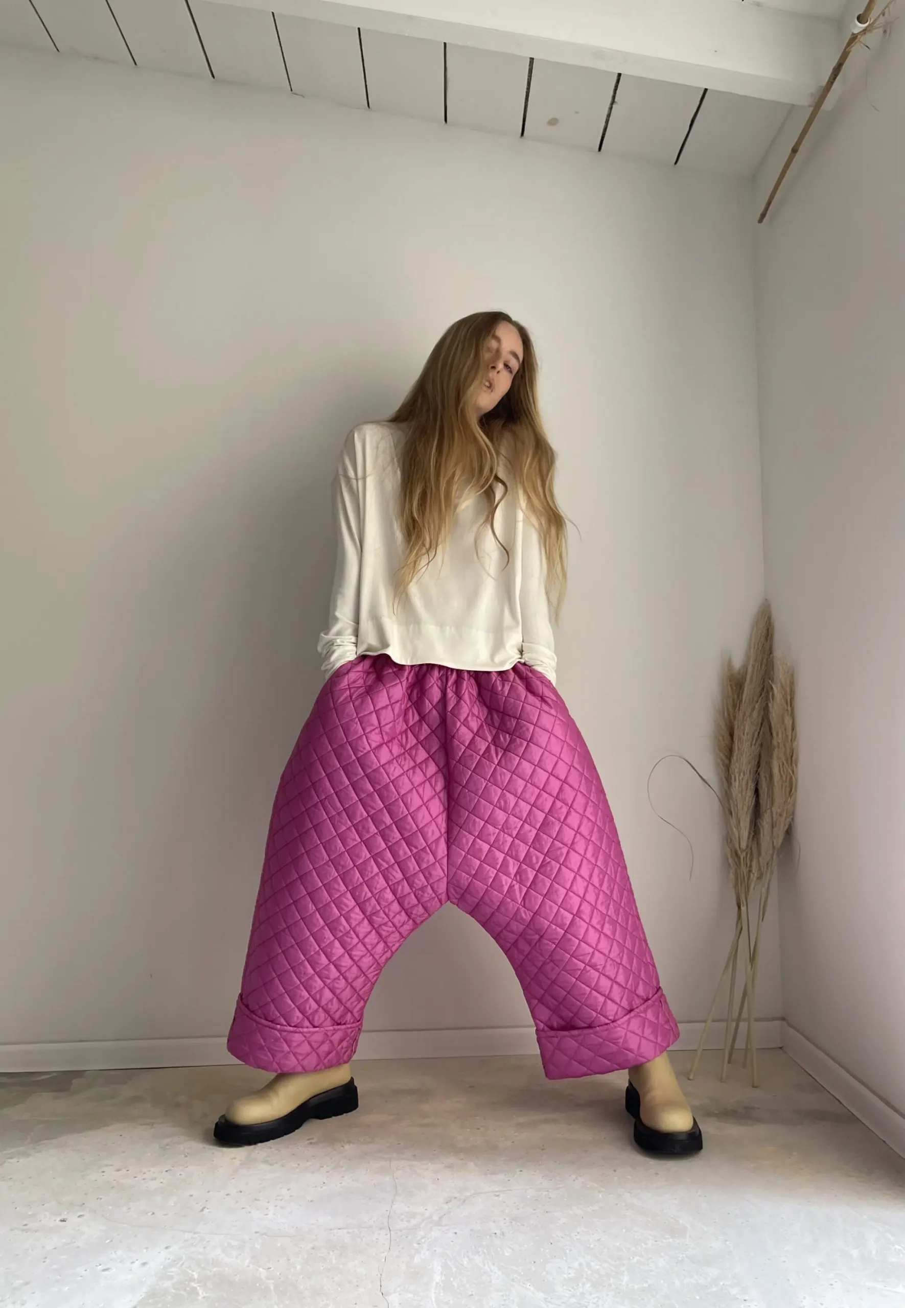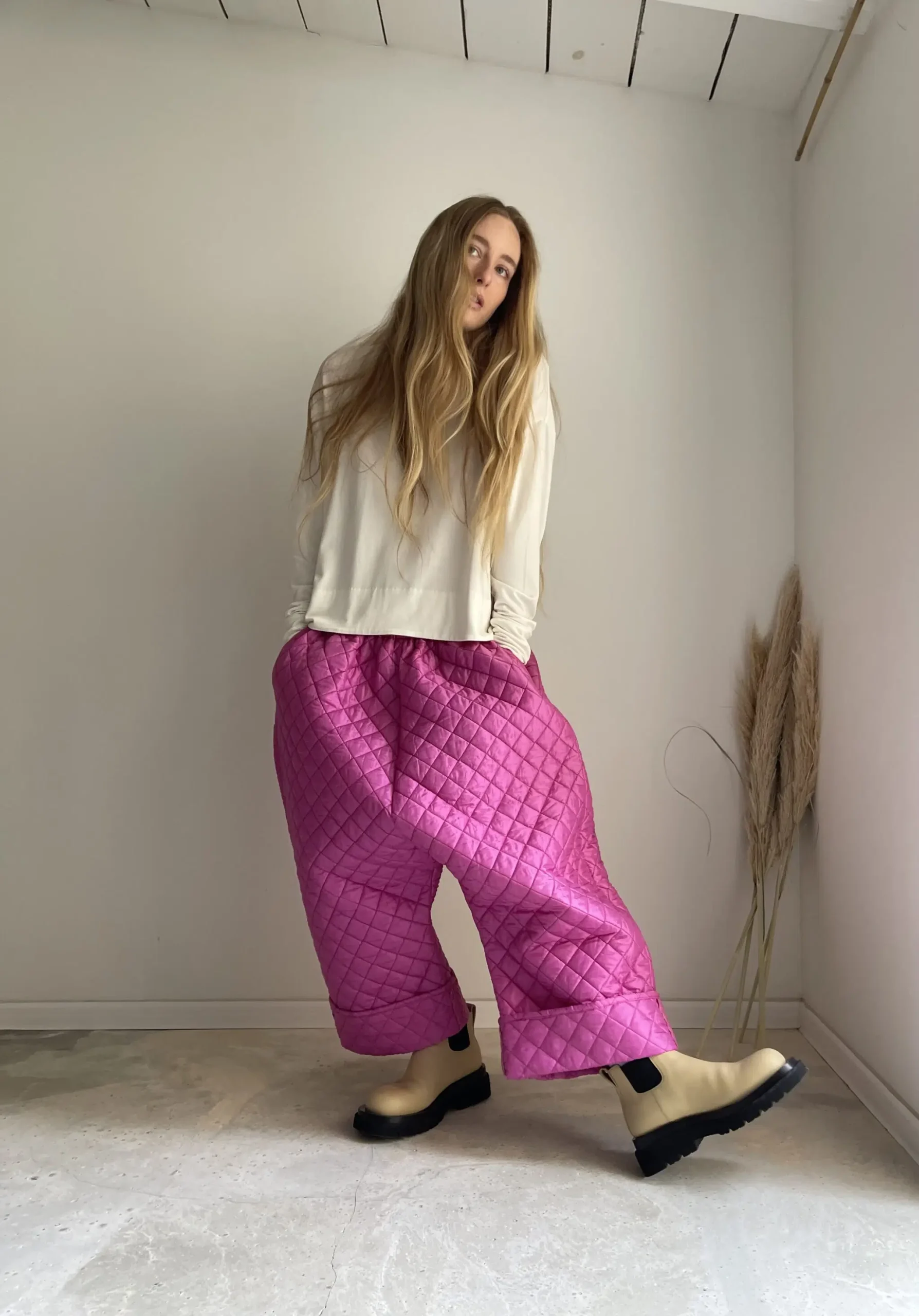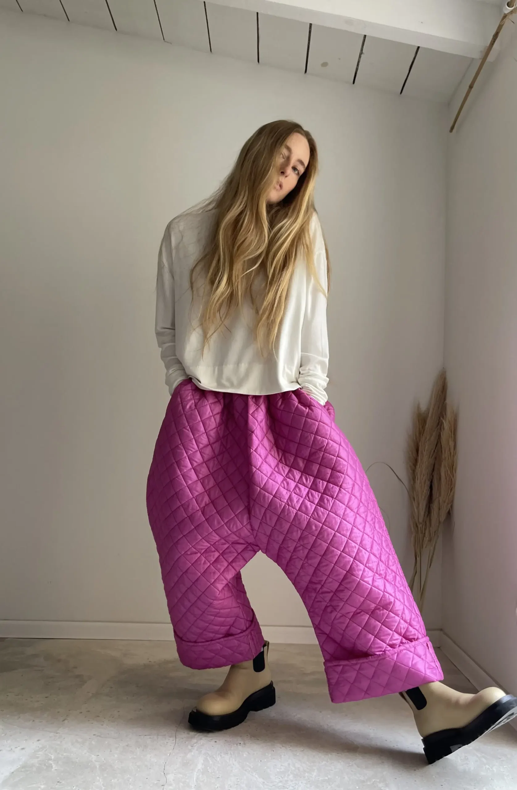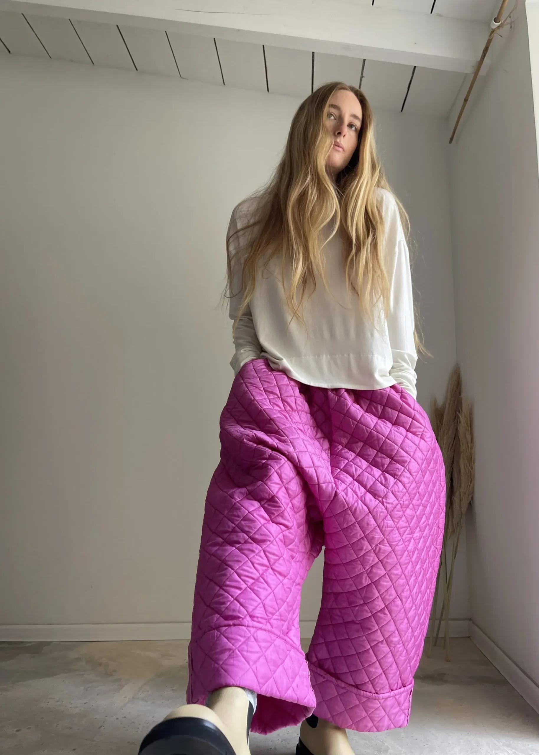Pantalon « GASTON » dans un superbe tissu matelassé rose fuchsia, taille sur élastique froncé, poches latérales. Une coupe loose et oversize, japonisante, un fond de pantalon bas pour une pièce stylée et unique.
