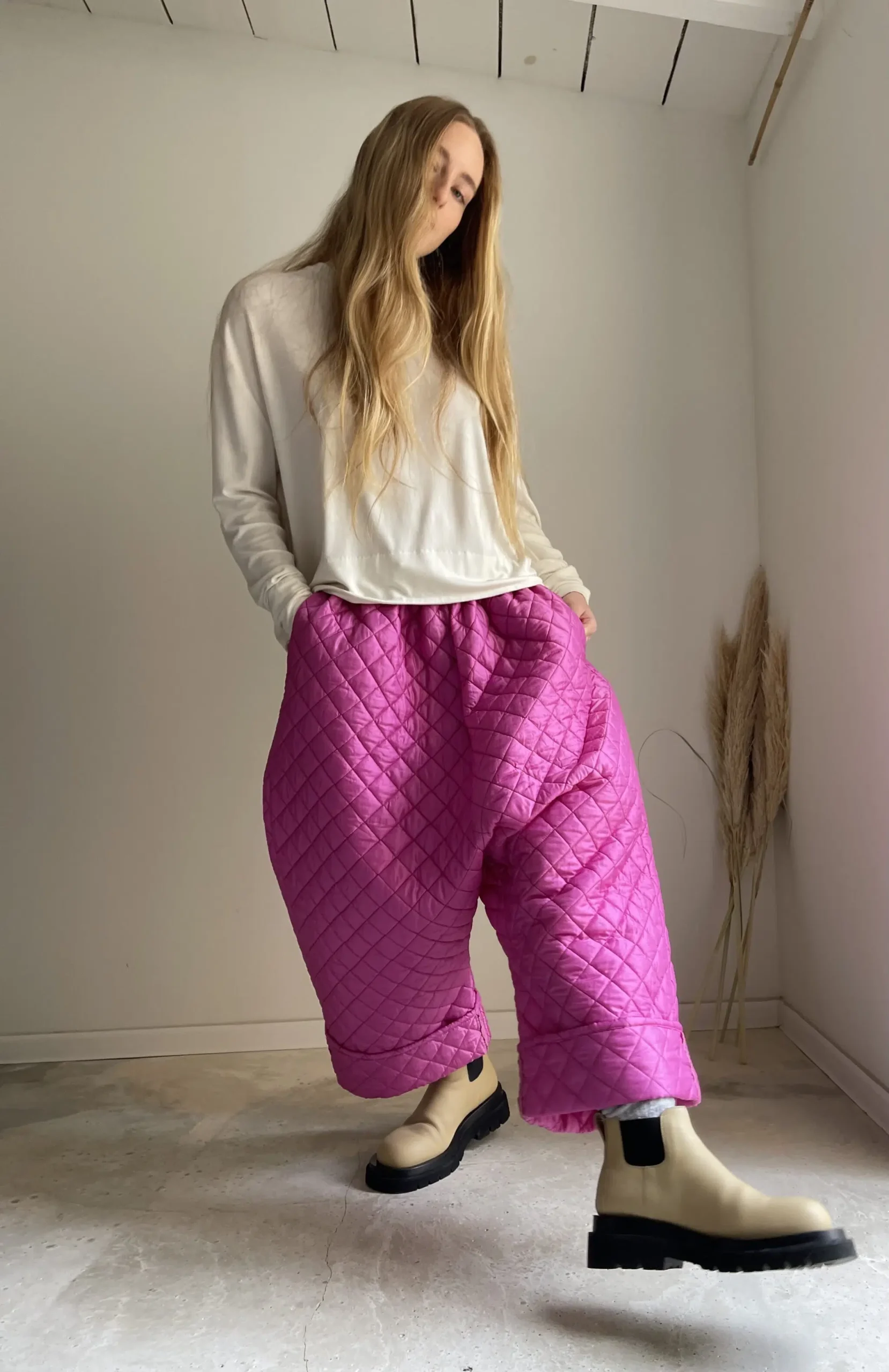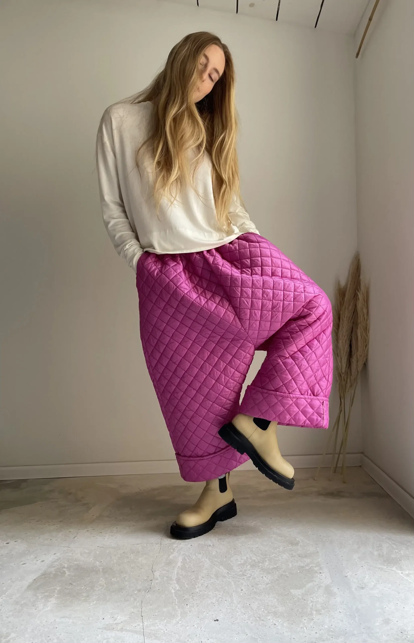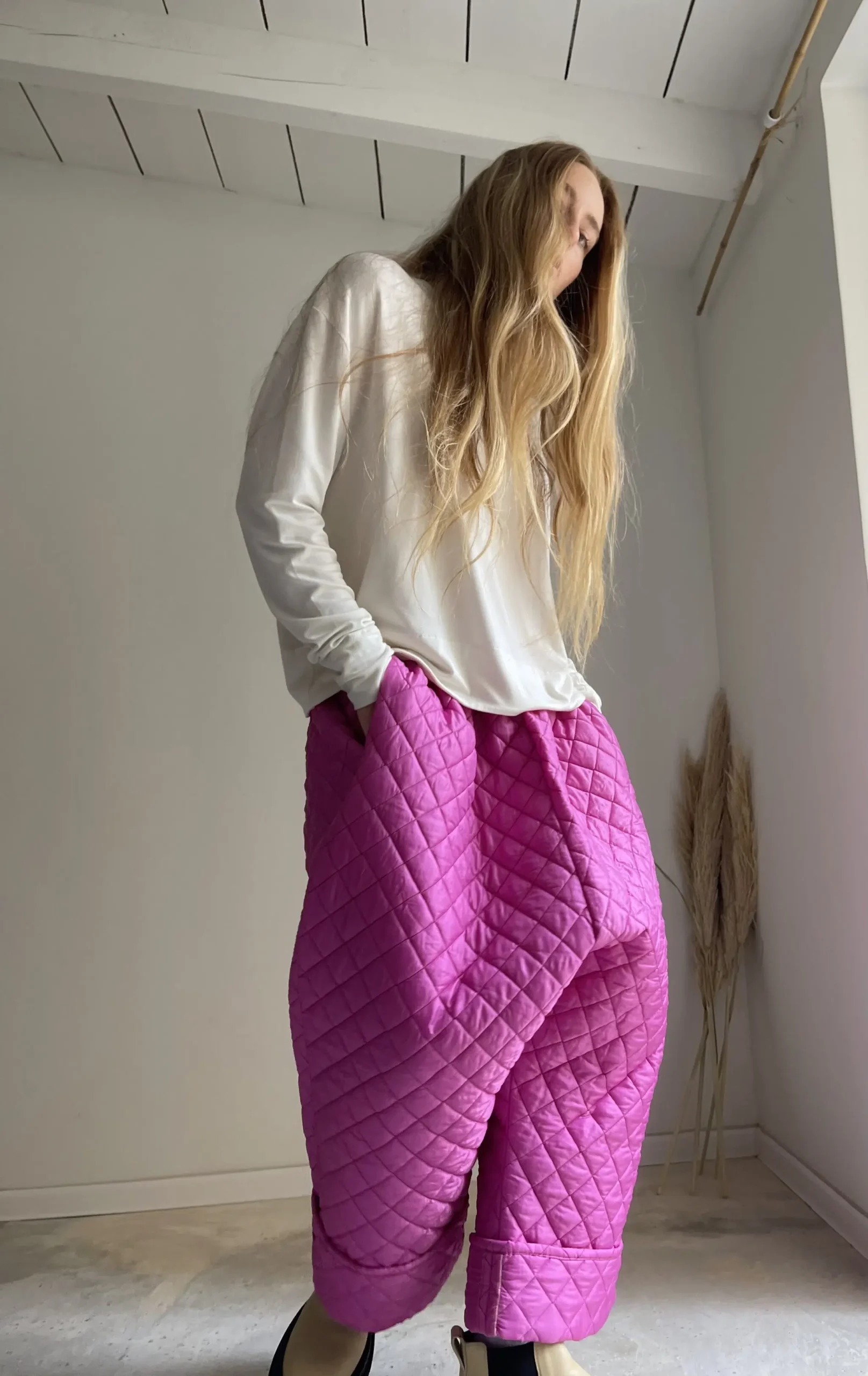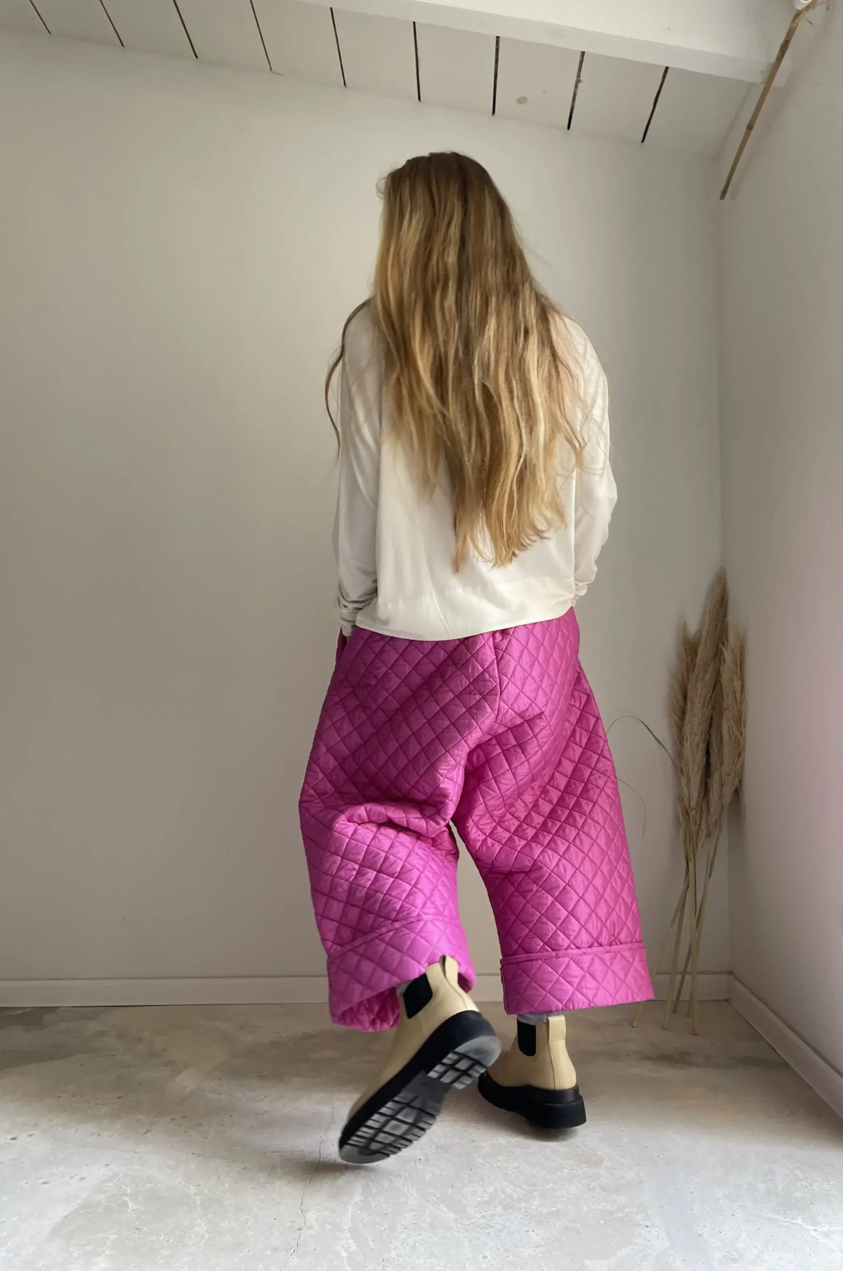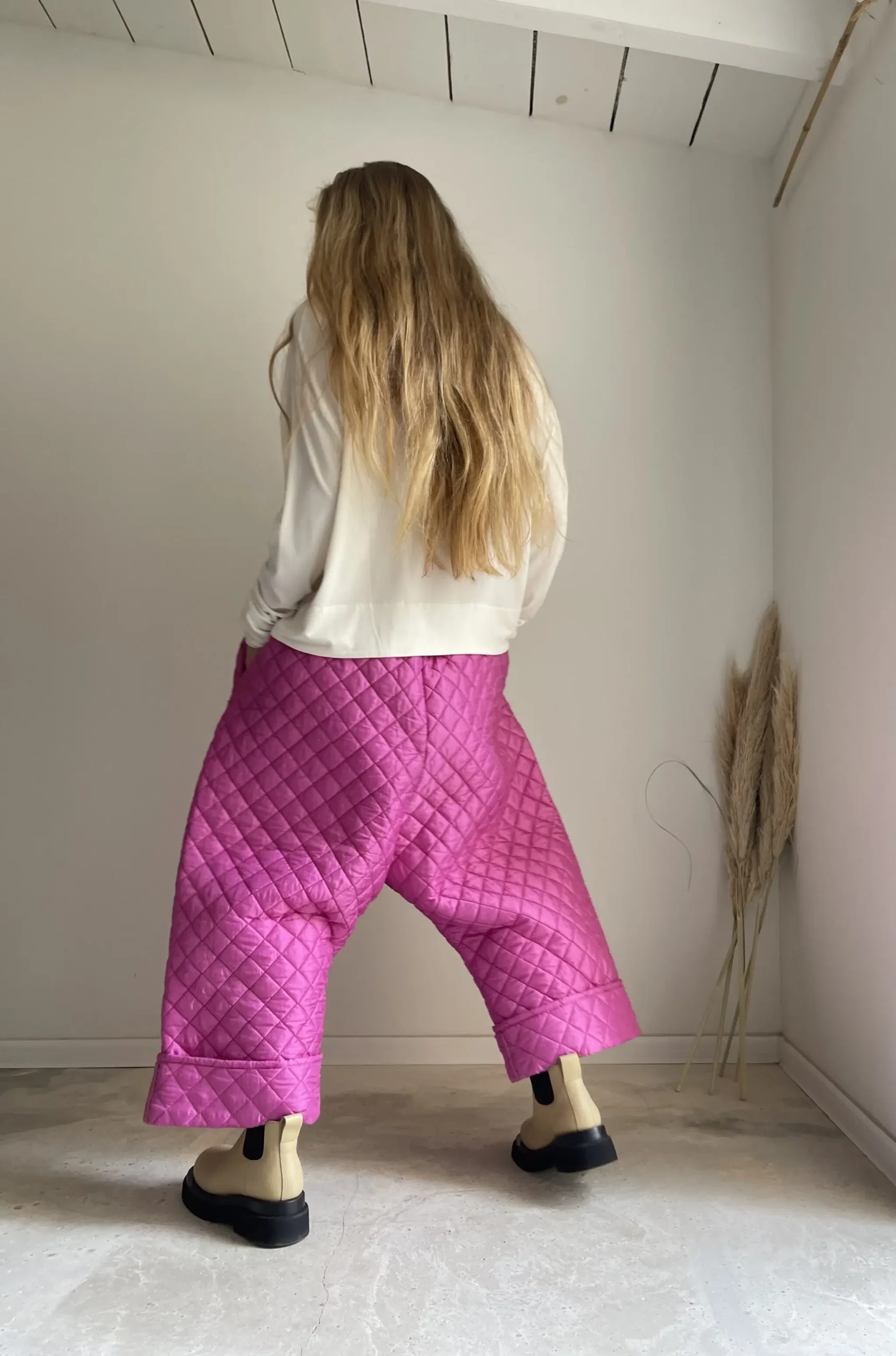 Pantalon « GASTON » dans un superbe tissu matelassé rose fuchsia, taille sur élastique froncé, poches latérales. Une coupe loose et oversize, japonisante, un fond de pantalon bas pour une pièce stylée et unique.