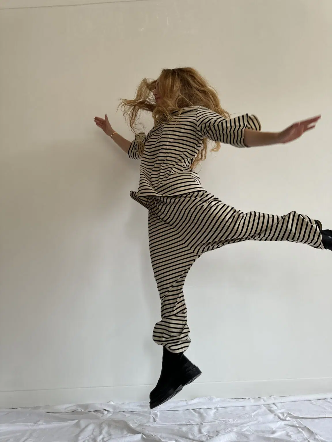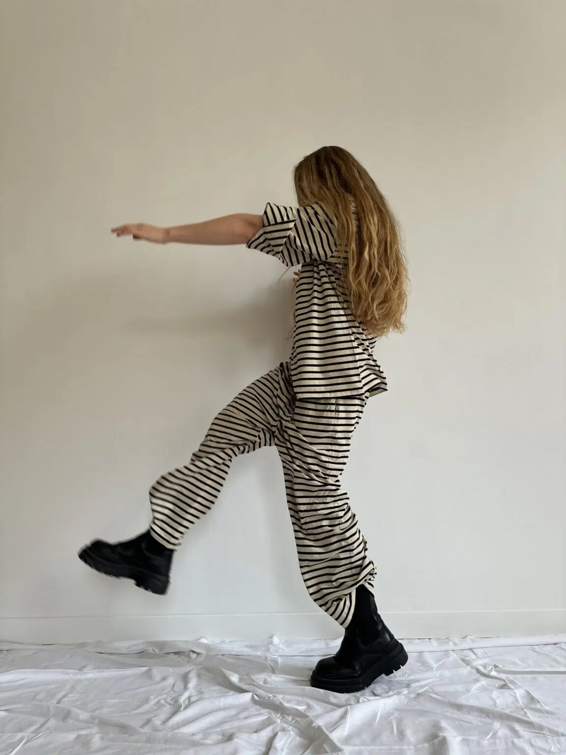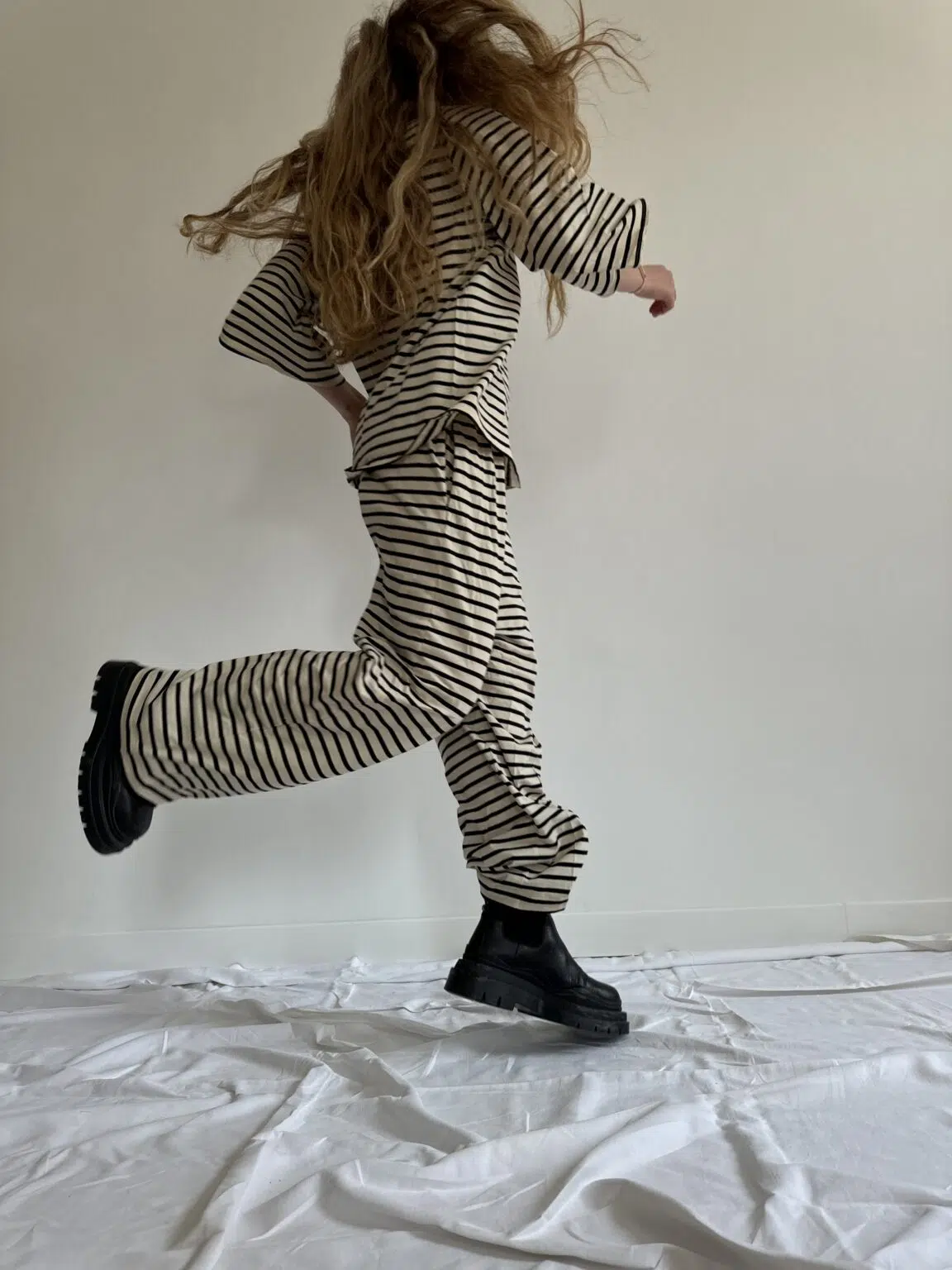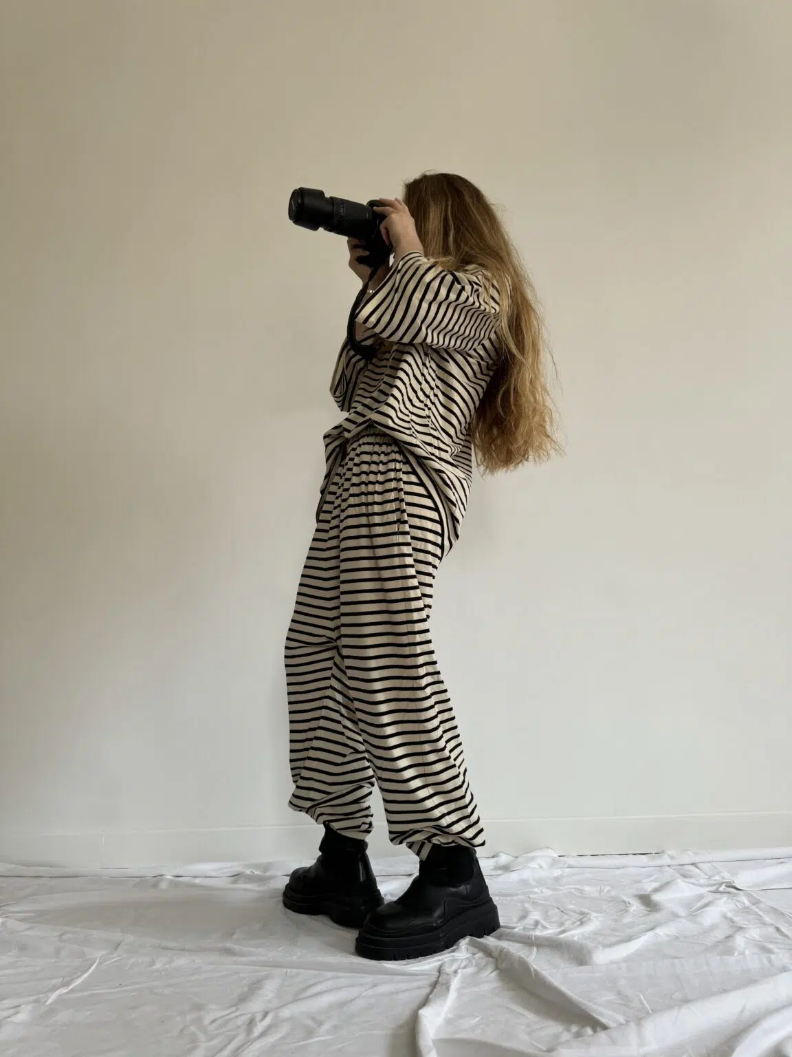Pantalon « JO » dans un sublime jersey coton & laine marinière. Rayures noires sur fond écru. Taille sur élastique, poches latérales. Une coupe loose et oversize, pour un pantalon stylé et unique. Petite édition.