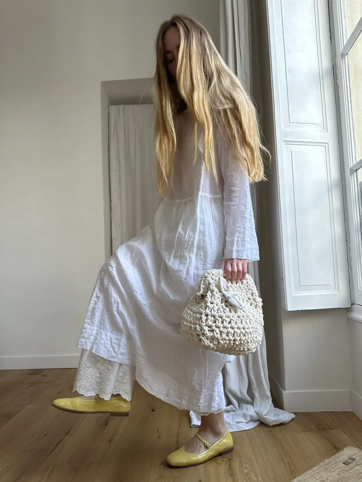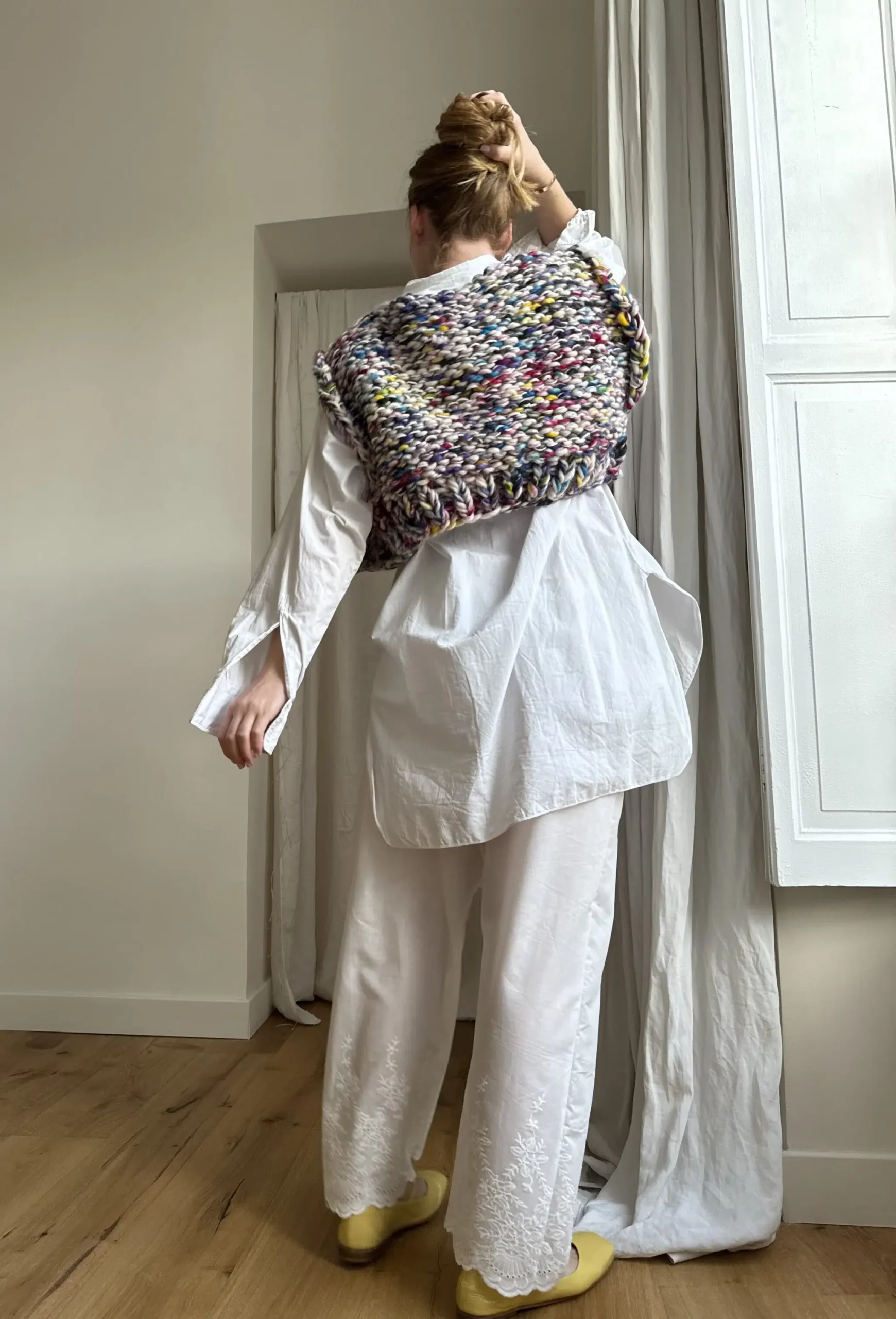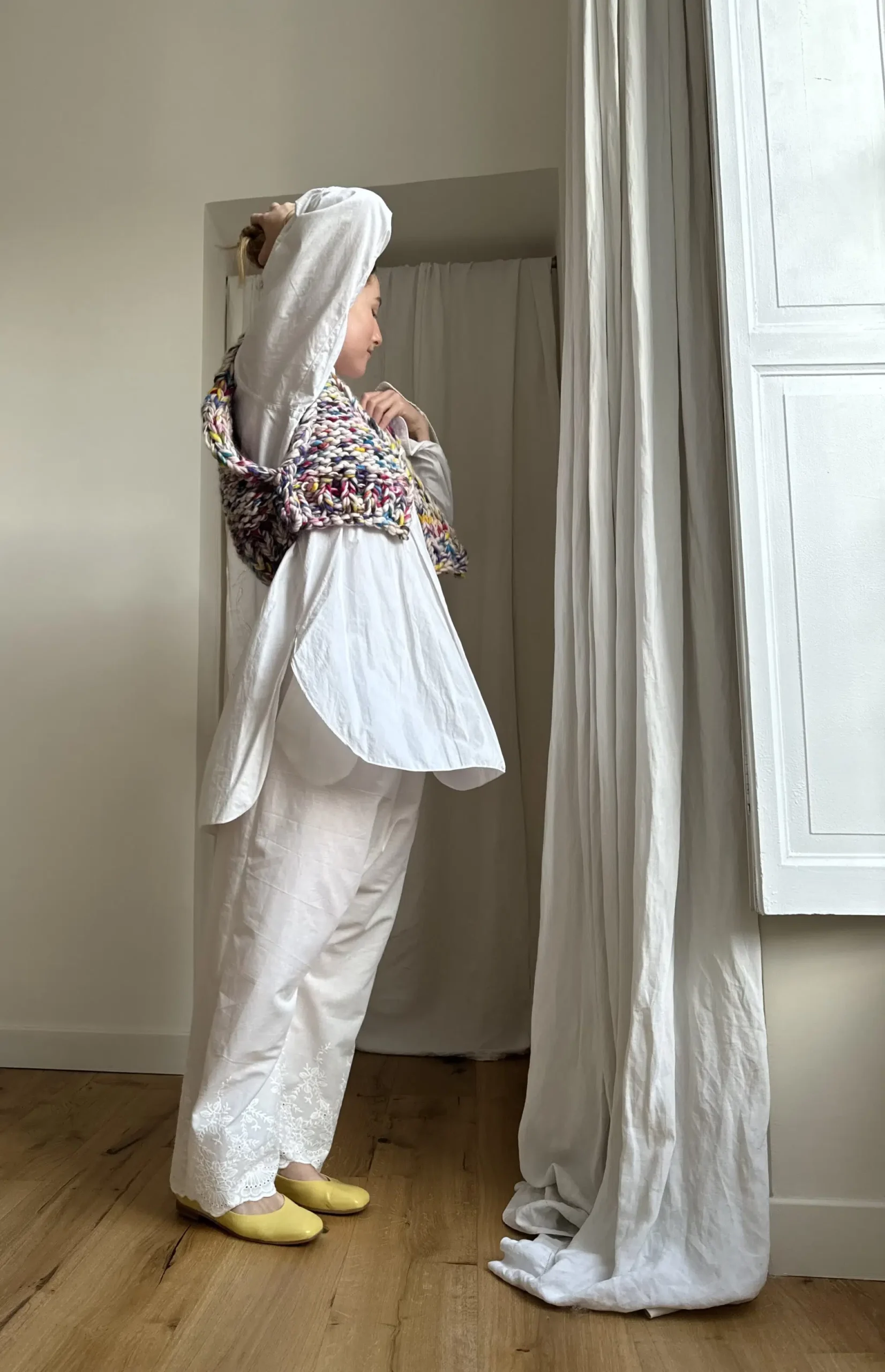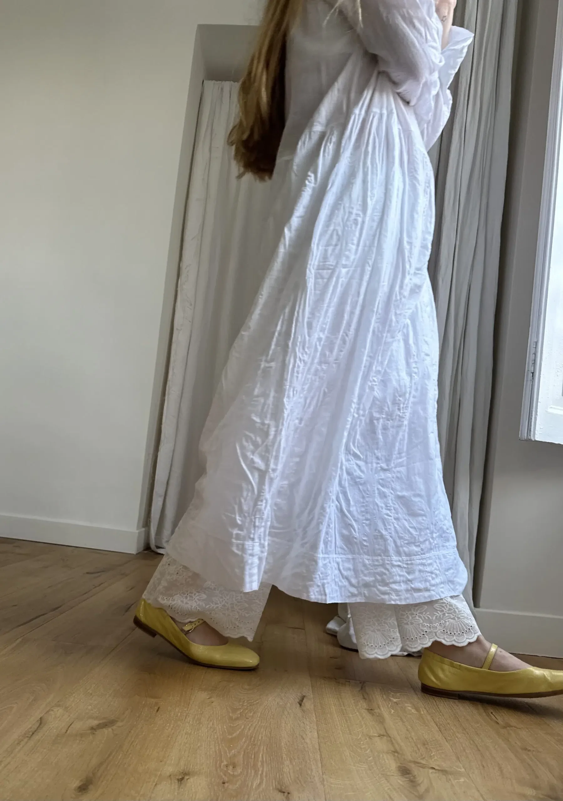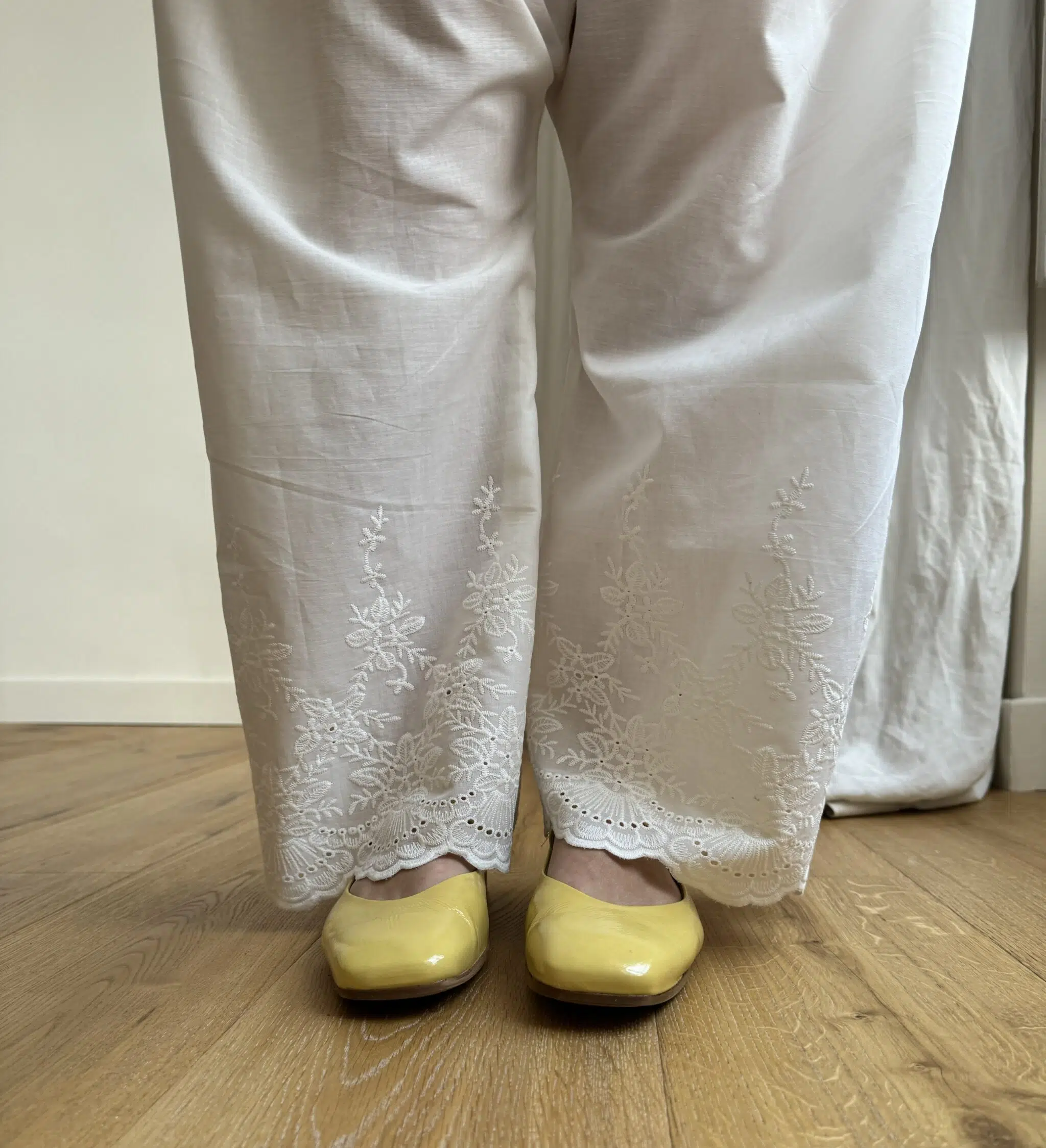 Pantalon « JO » en voile de coton brodé à festons. Pantalon transparent, idéal à porter sous une robe, blouse ou jupe, en superposition, pour dévoiler les broderies en bas de pantalon. Taille sur élastique.