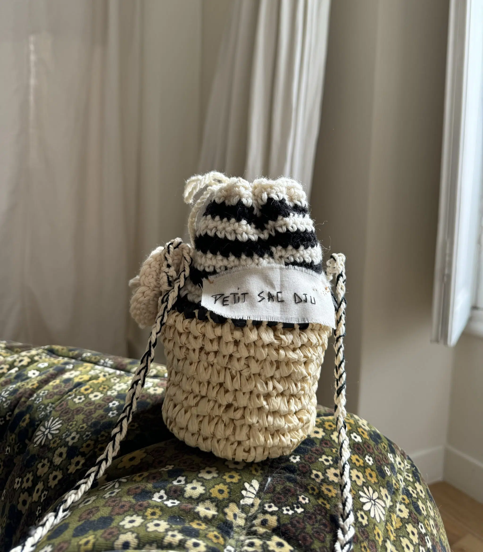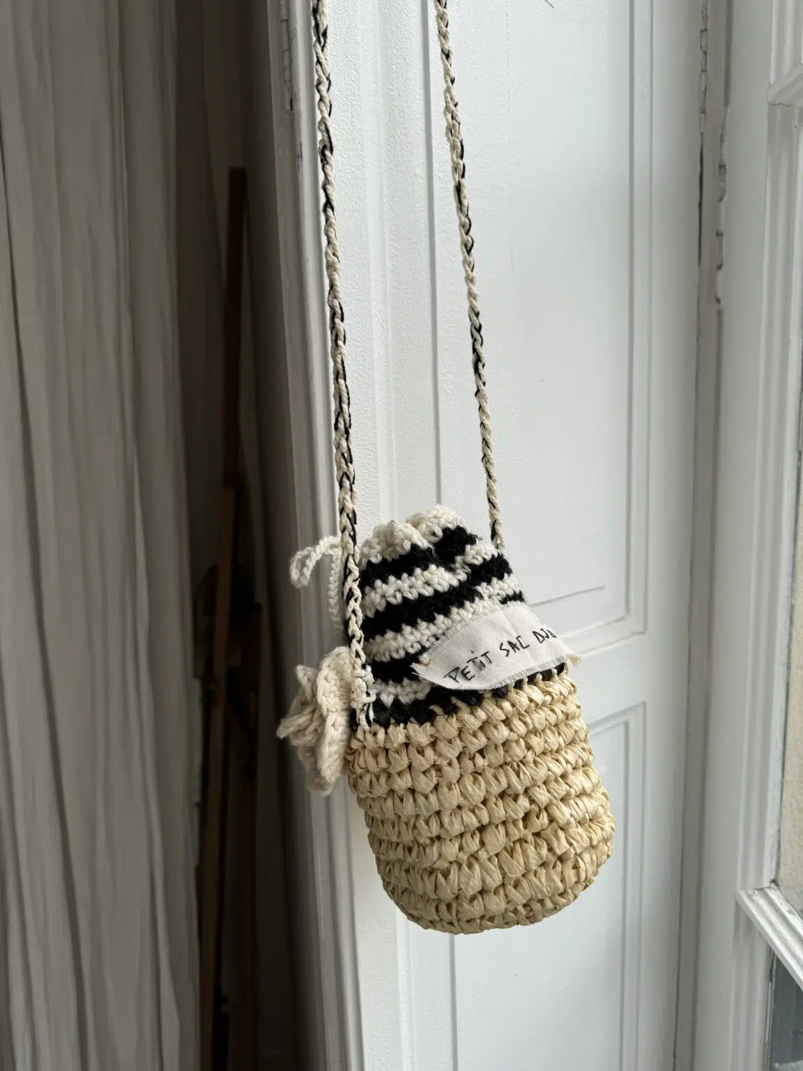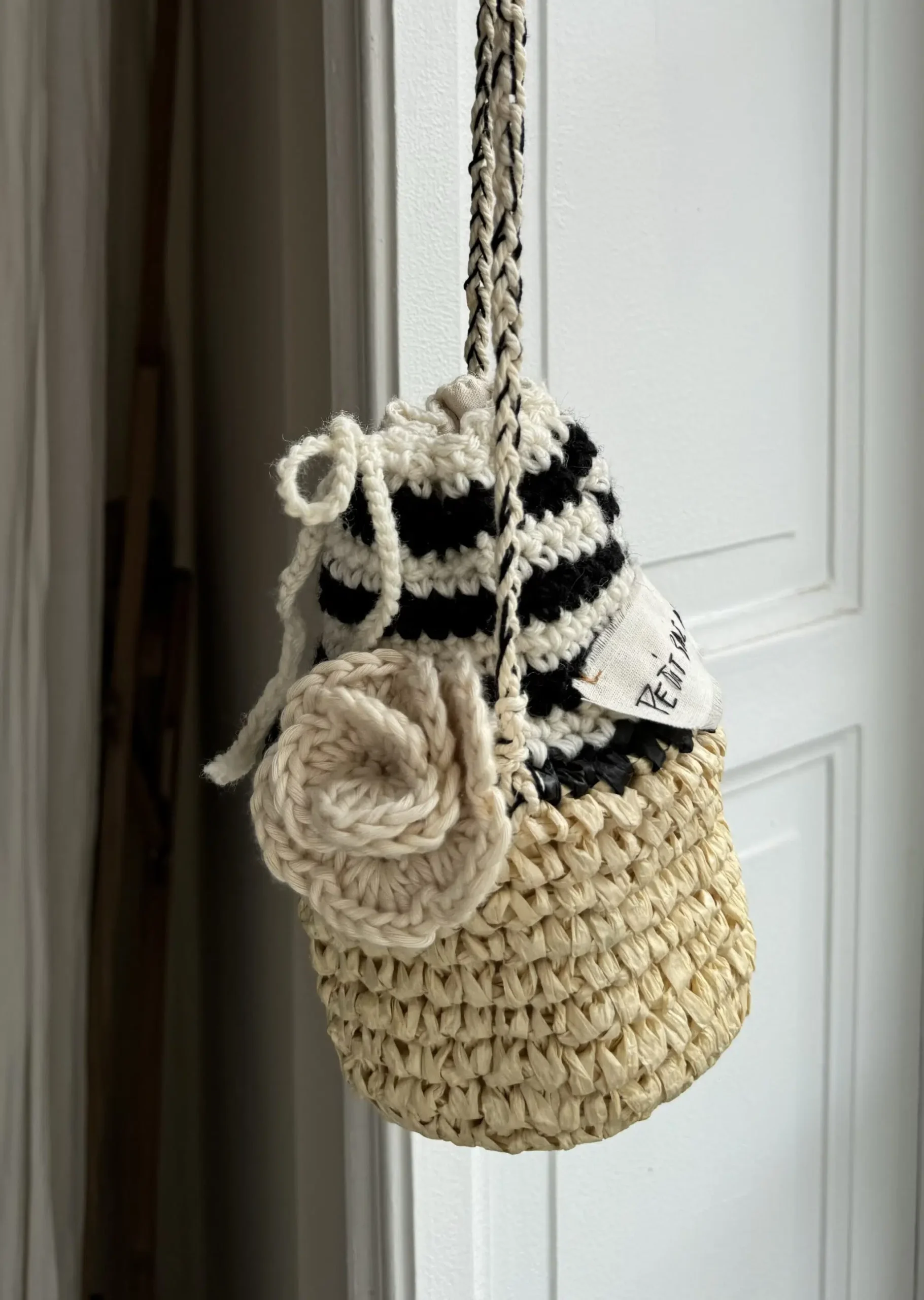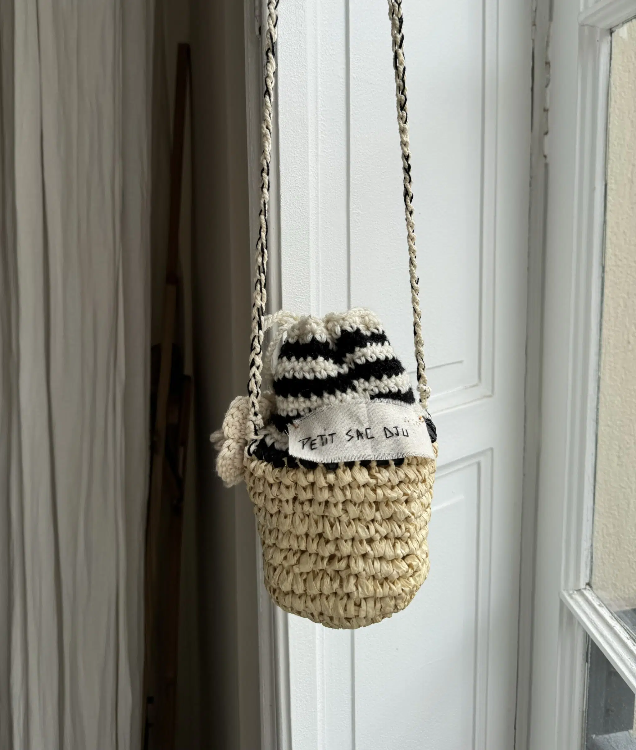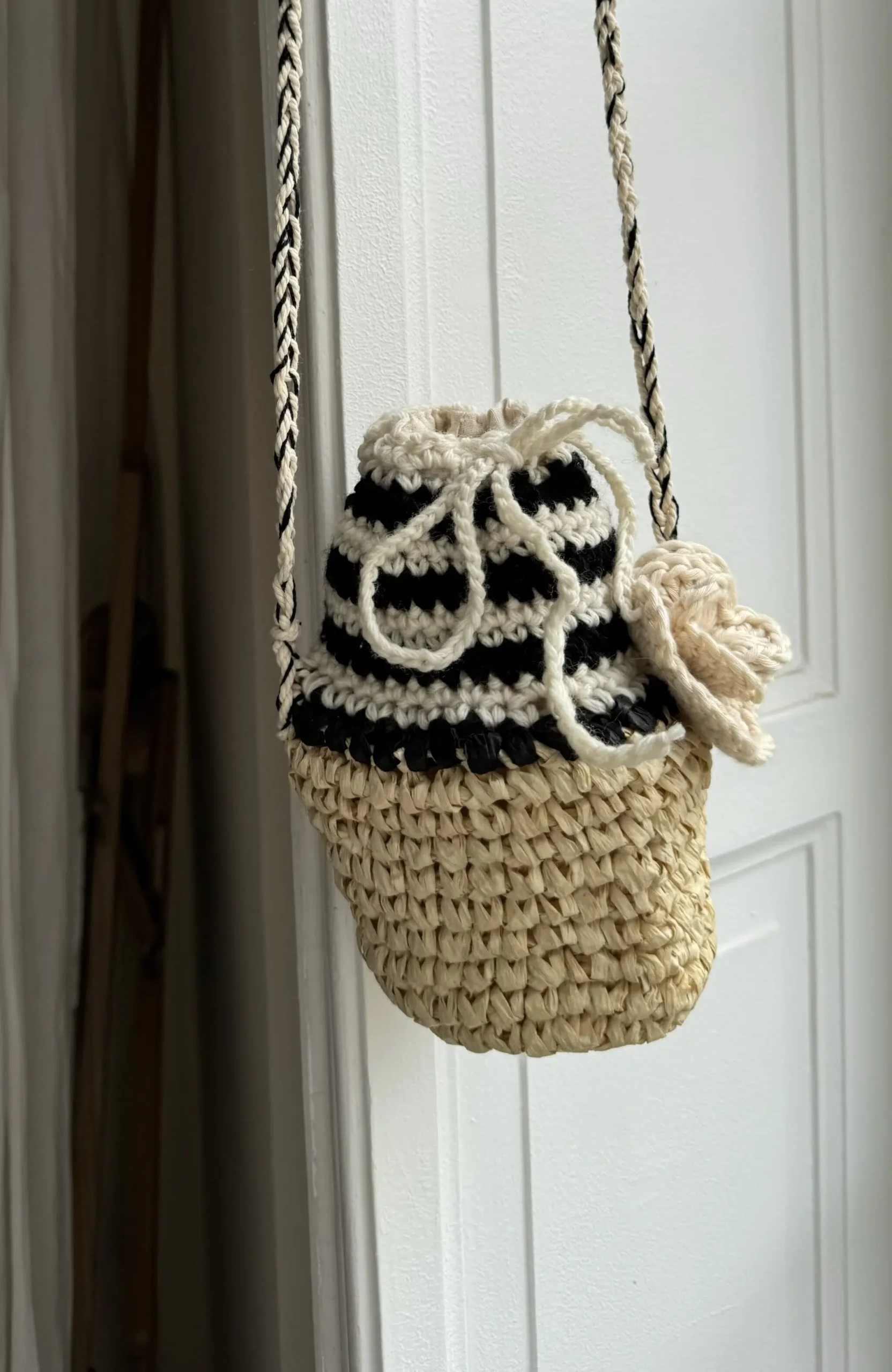 Petit sac « Dju » crocheté main, bi matières, coton & raphia. Bandoulière en coton crochetée main. Fleur au crochet, lien de serrage, fond de sac en coton. Une pièce unique poétique.