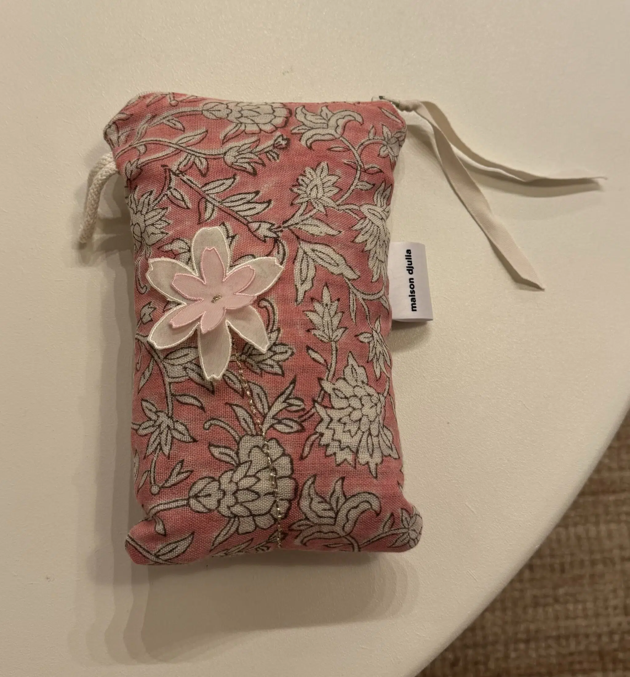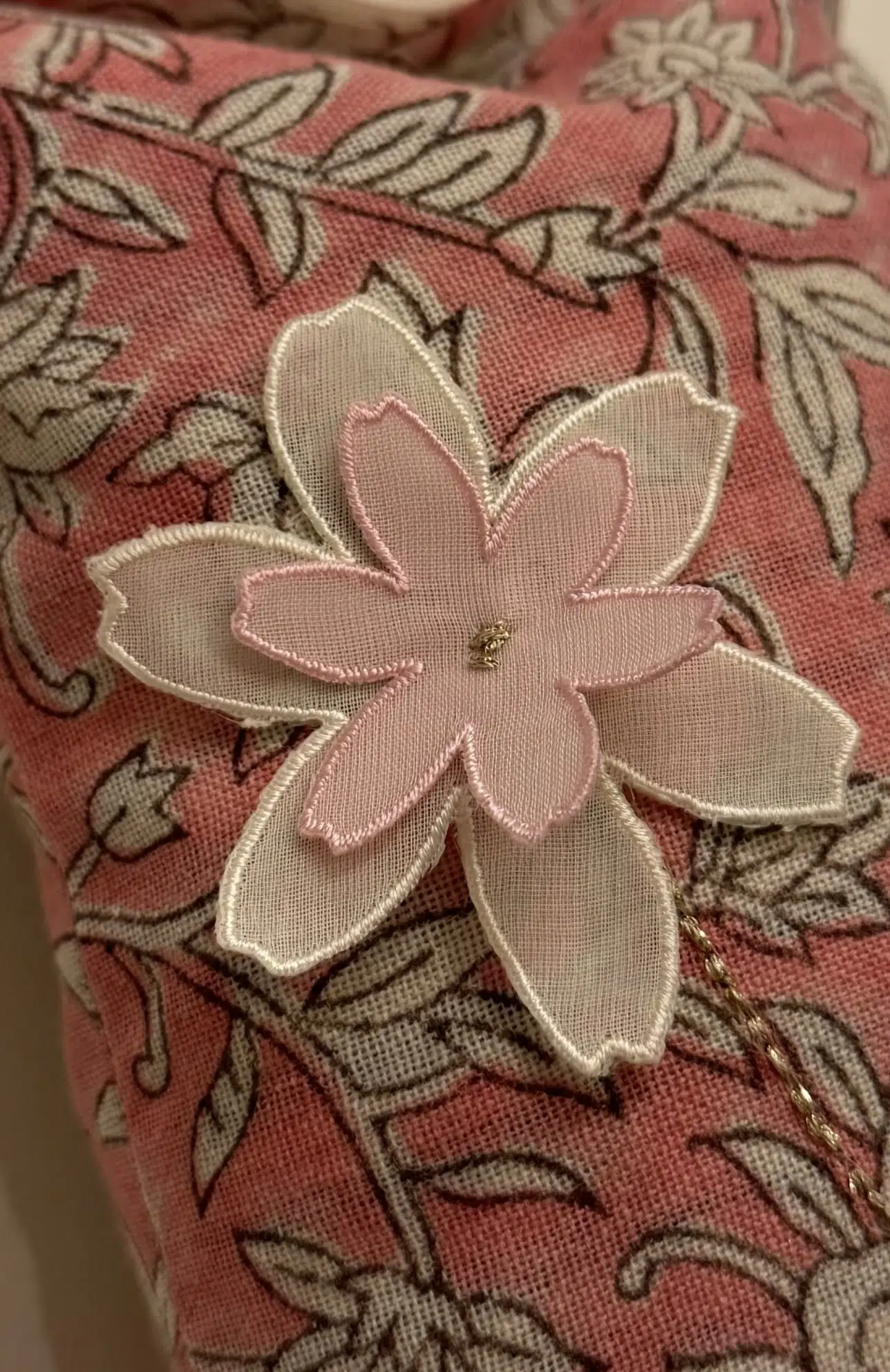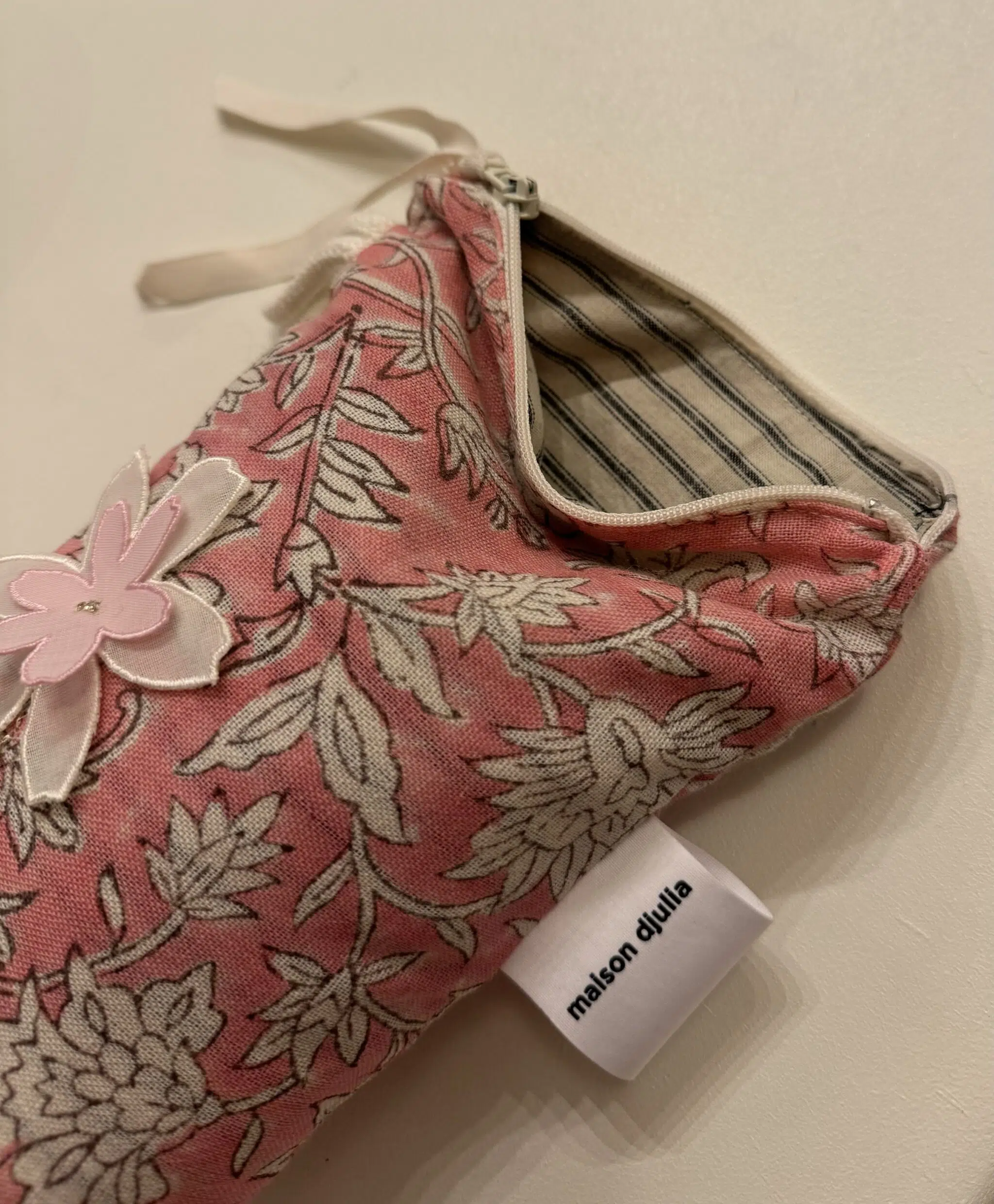 Pochette fleurie. Doublure en lin grège à rayures grises. Fleur en organza en 3D. Broderies main fil lurex. PIÈCE UNIQUE