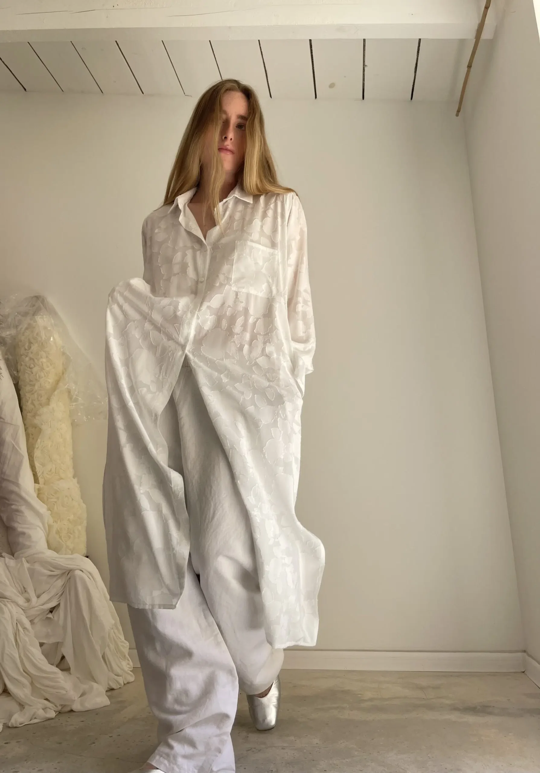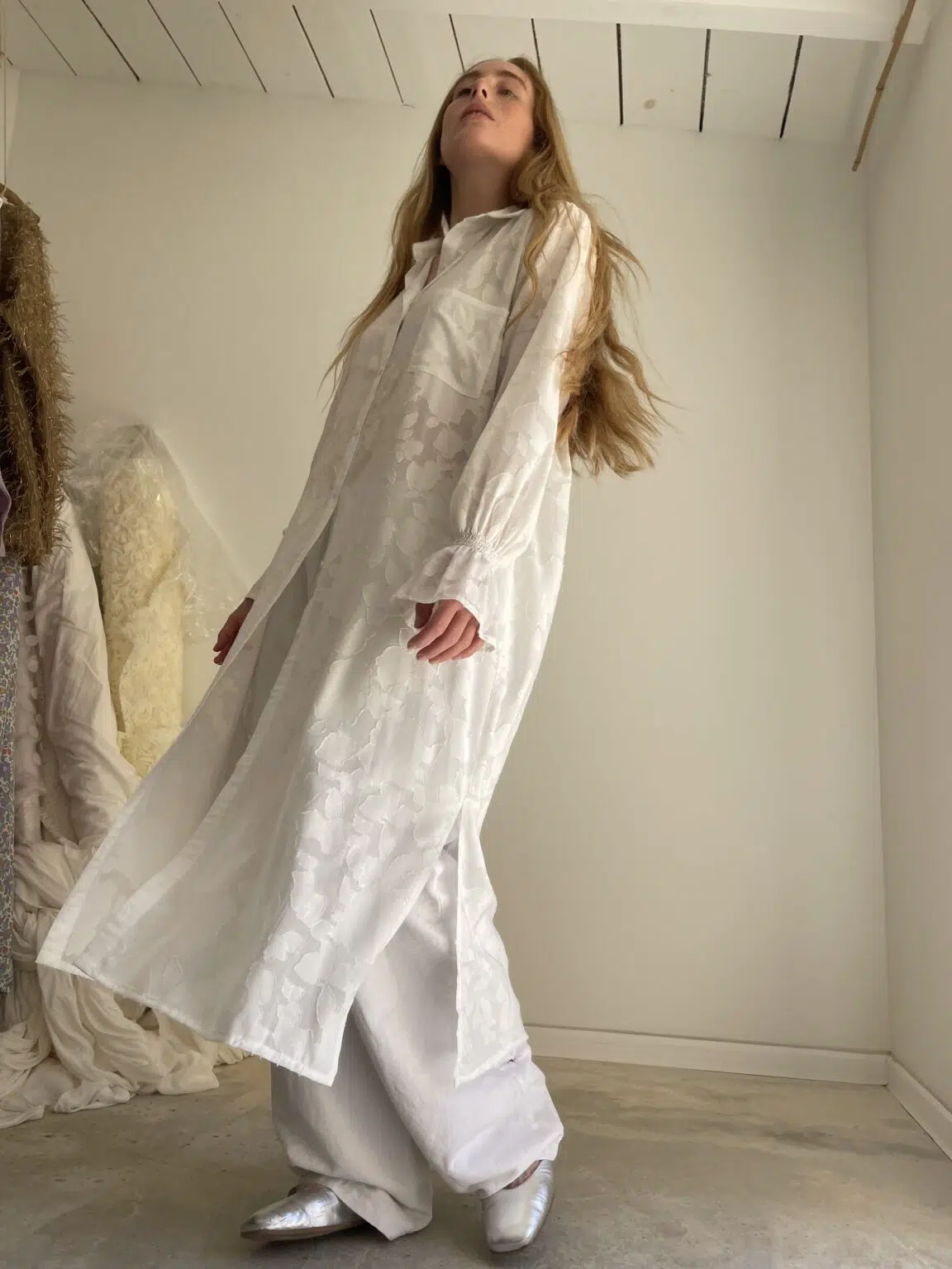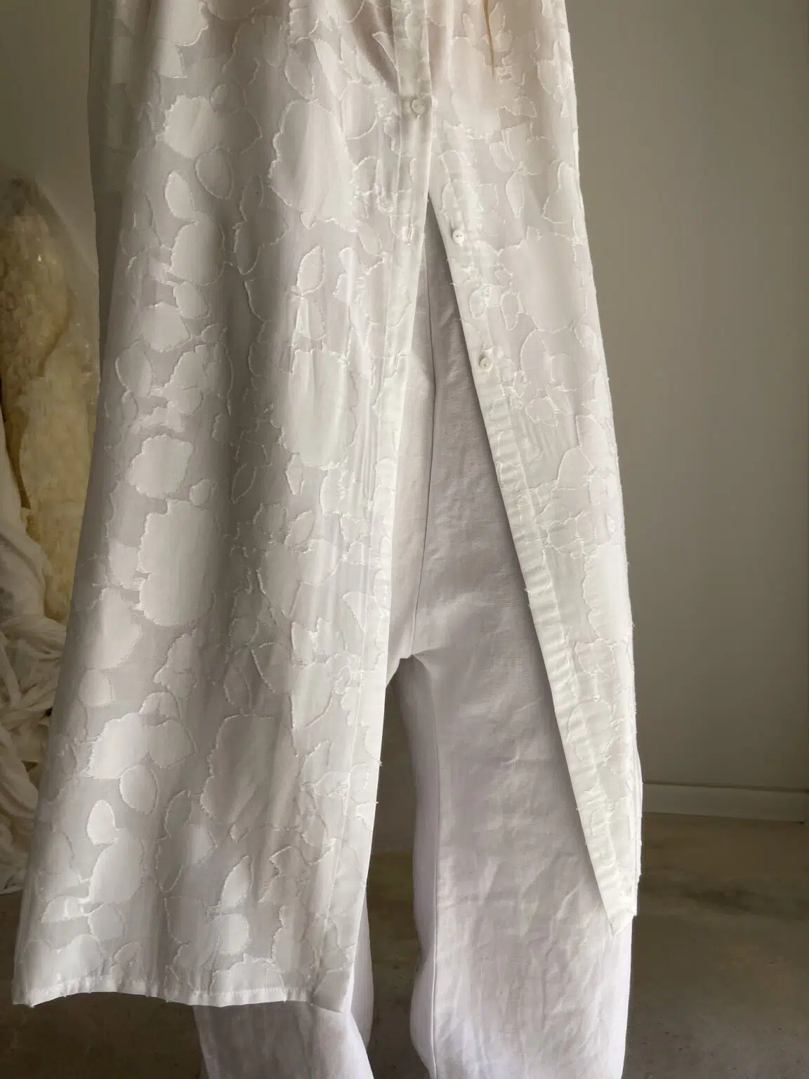 Robe-Chemise « LUCIE » dans un magnifique voile de viscose dévorée fleurie. Robe fluide et légère, poignets à smocks et à volants, fronces au dos, fentes sur les côtés, poches latérales. À porter en robe ou en superposition avec un pantalon et un marcel. Petite édition.