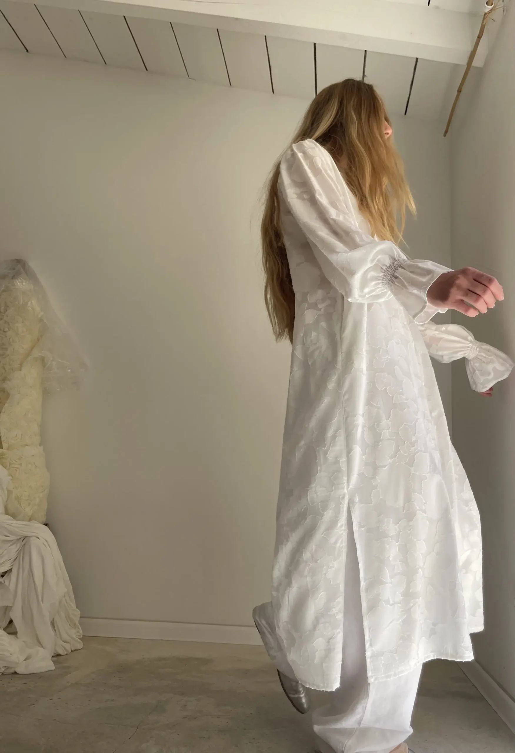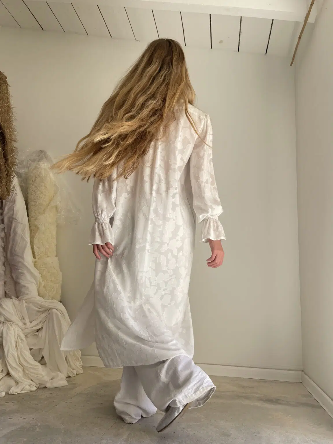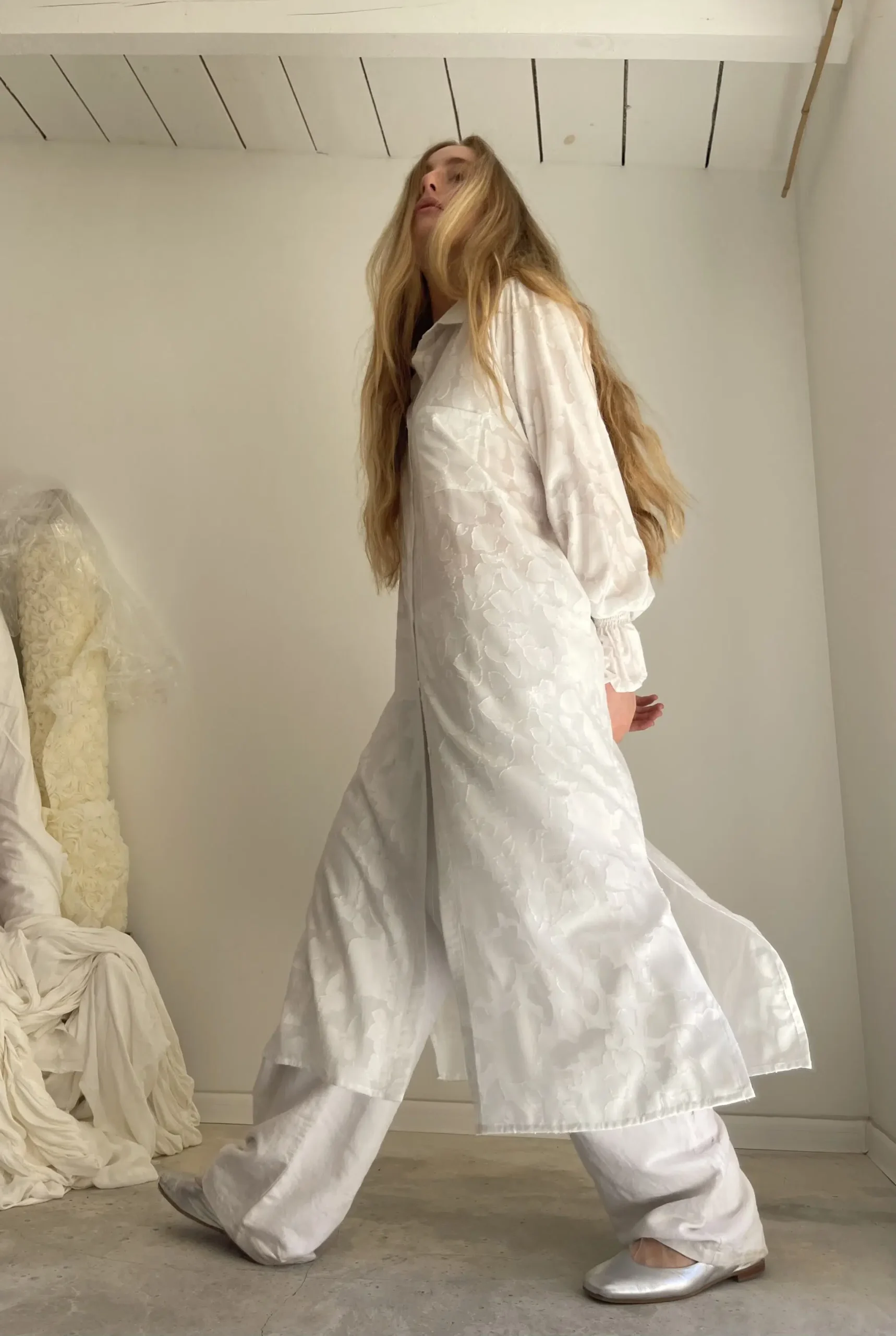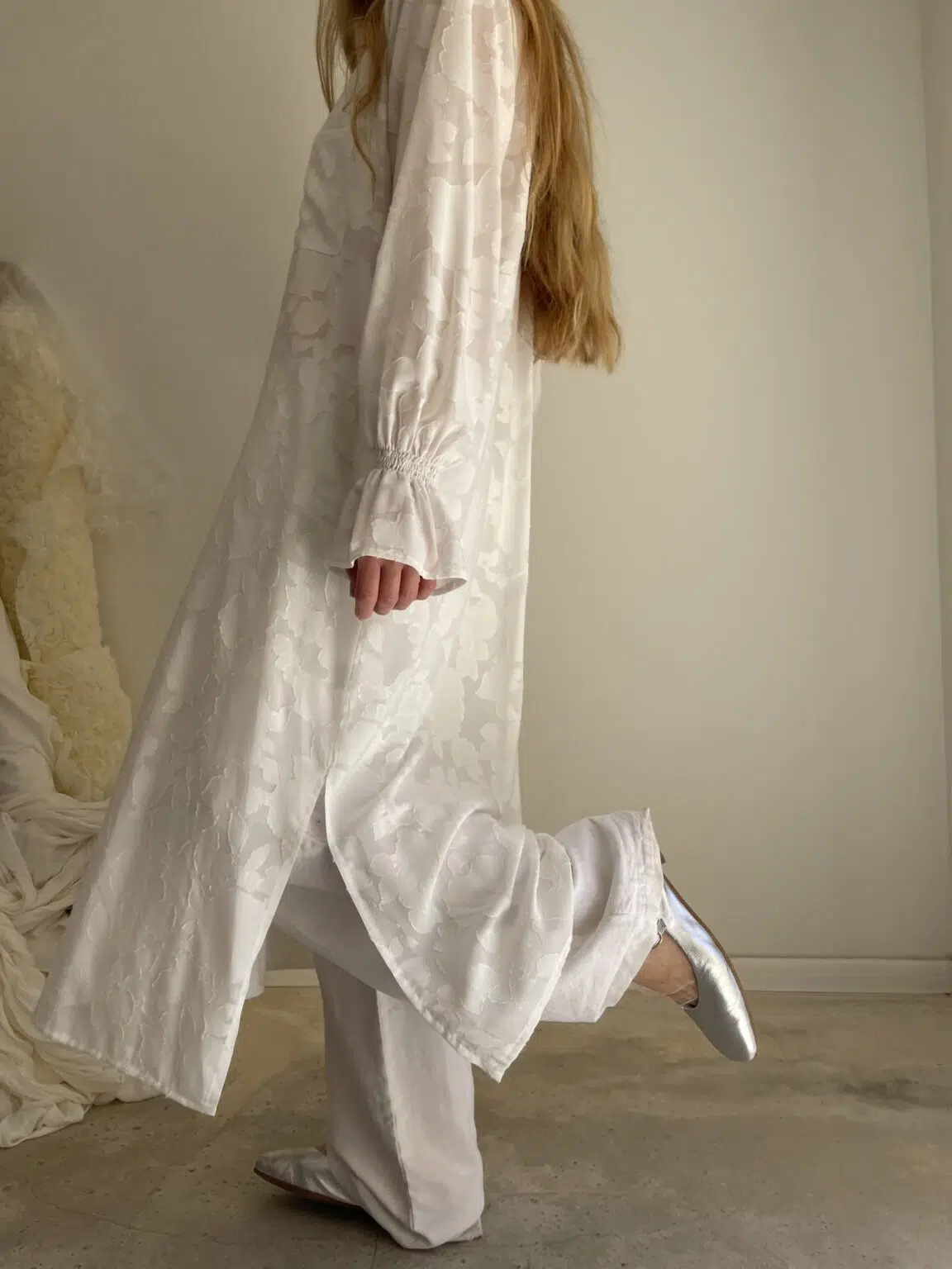 Robe-Chemise « LUCIE » dans un magnifique voile de viscose dévorée fleurie. Robe fluide et légère, poignets à smocks et à volants, fronces au dos, fentes sur les côtés, poches latérales. À porter en robe ou en superposition avec un pantalon et un marcel. Petite édition.