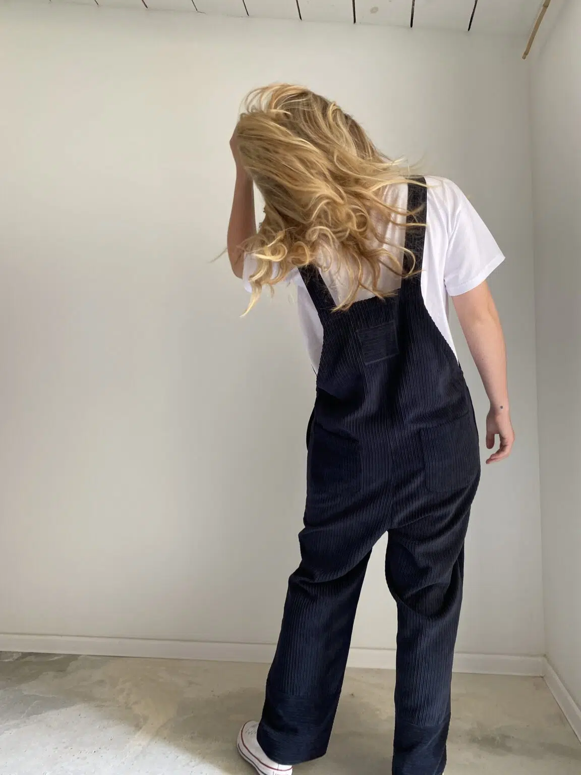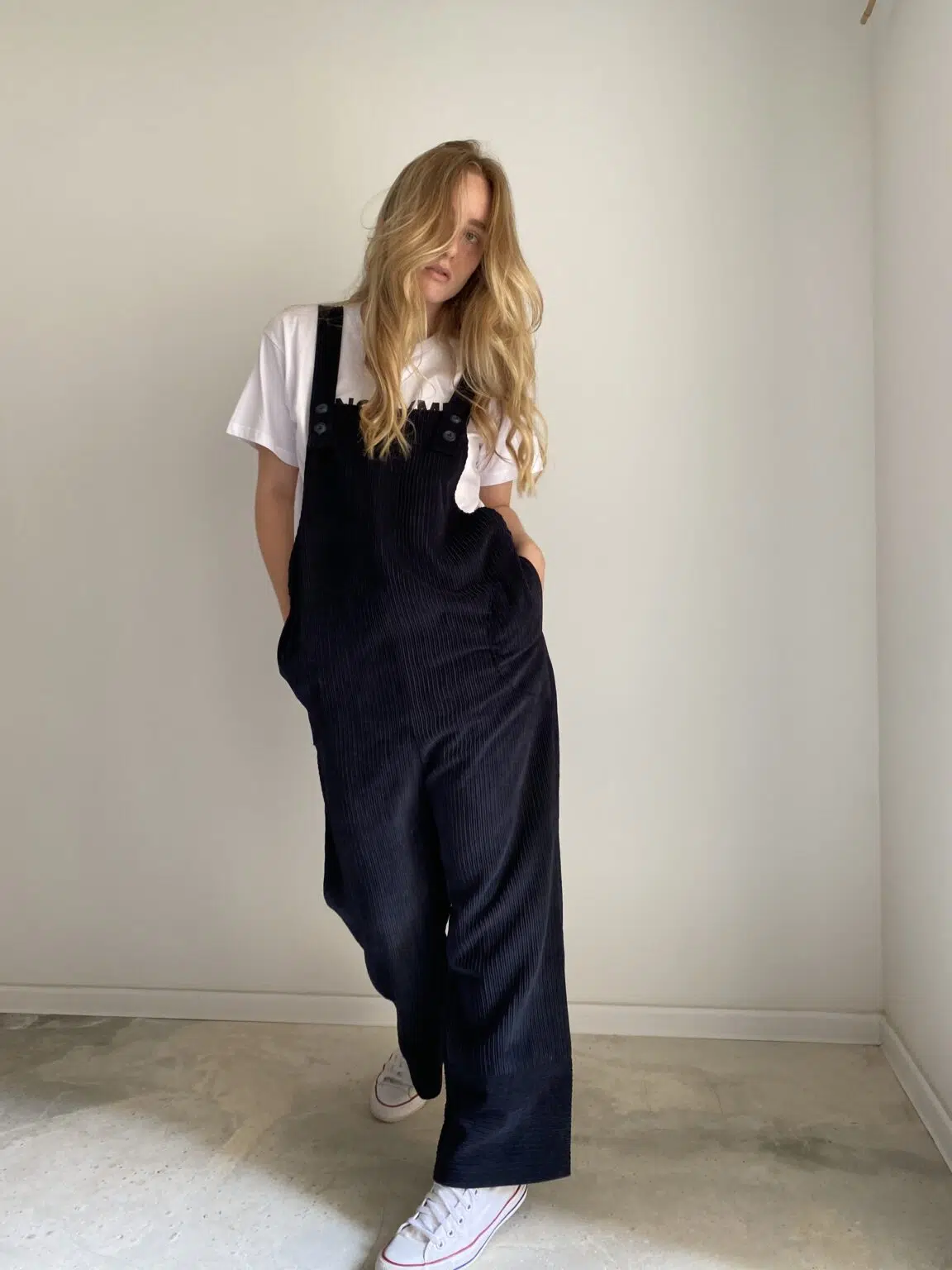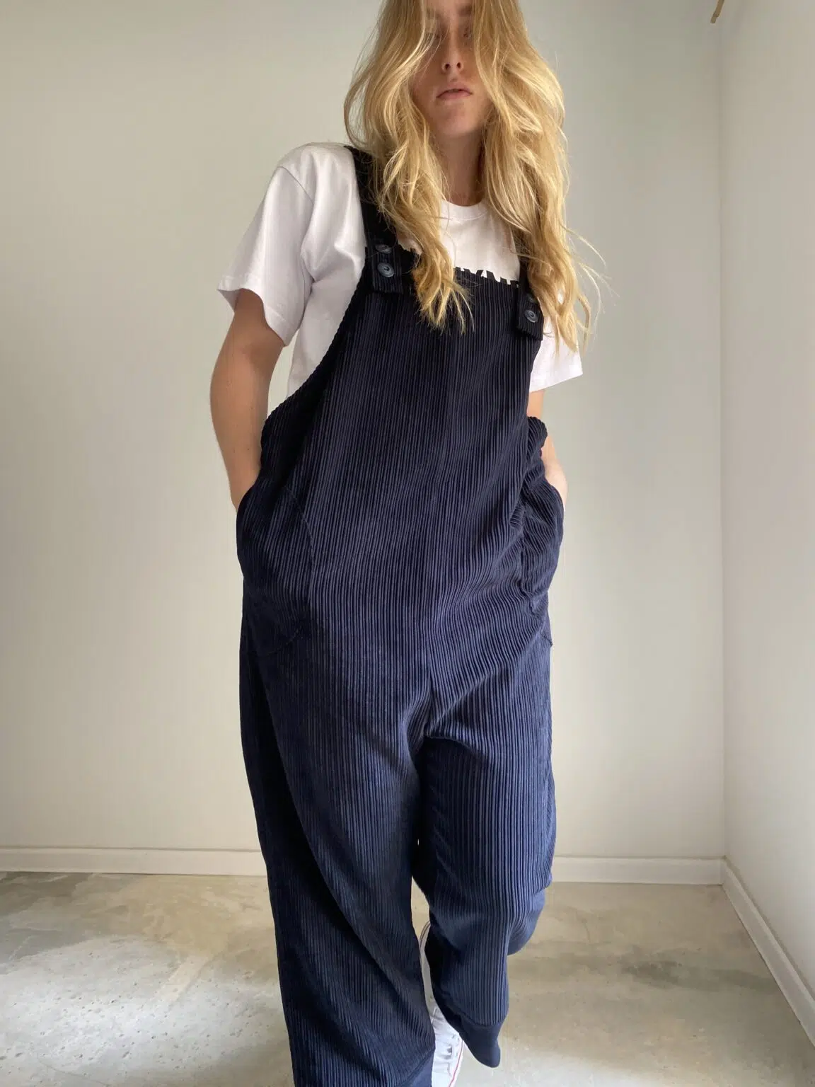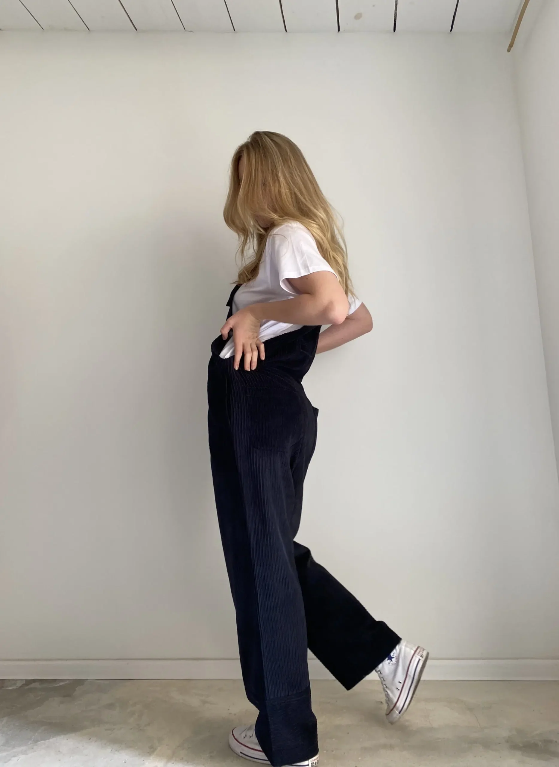 Salopette « LOUISON » en velours bleu marine grosses côtes, bretelles réglables avec boutons, poches avant et arrière.