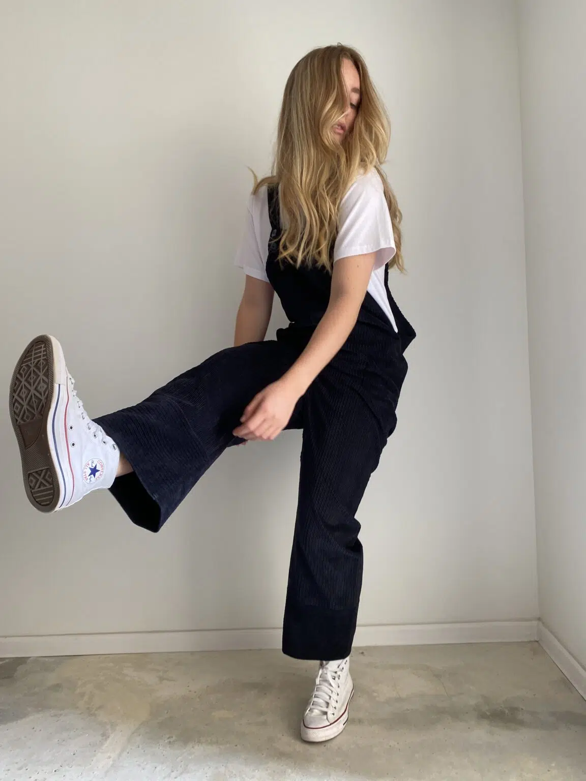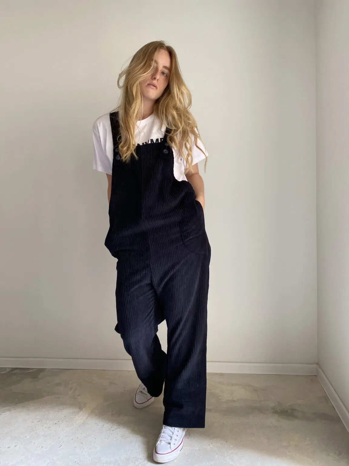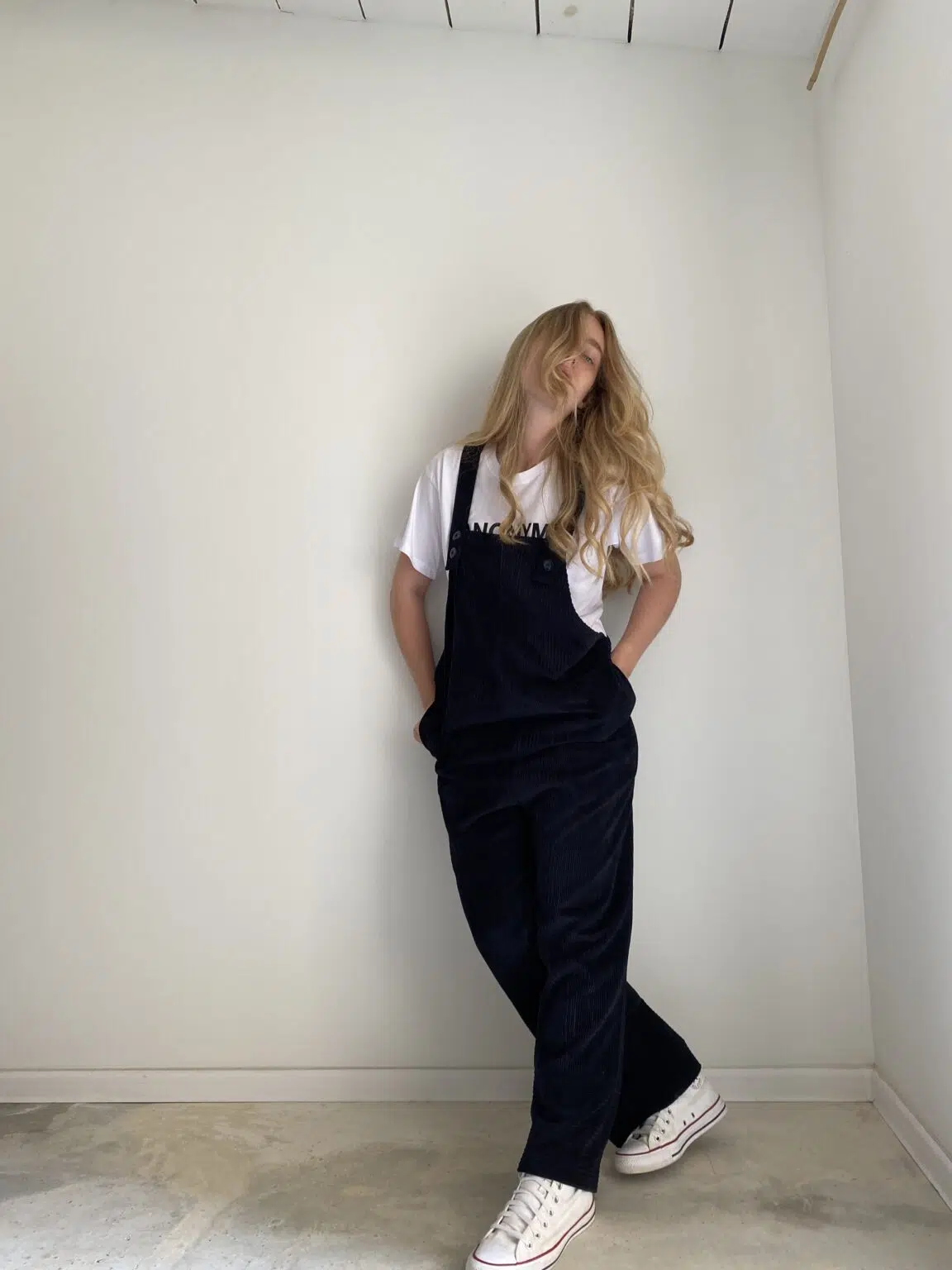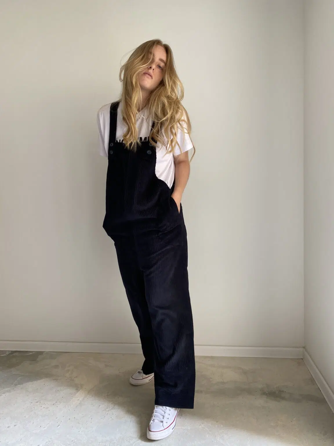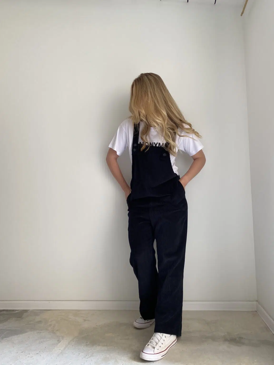 Salopette « LOUISON » en velours bleu marine grosses côtes, bretelles réglables avec boutons, poches avant et arrière.