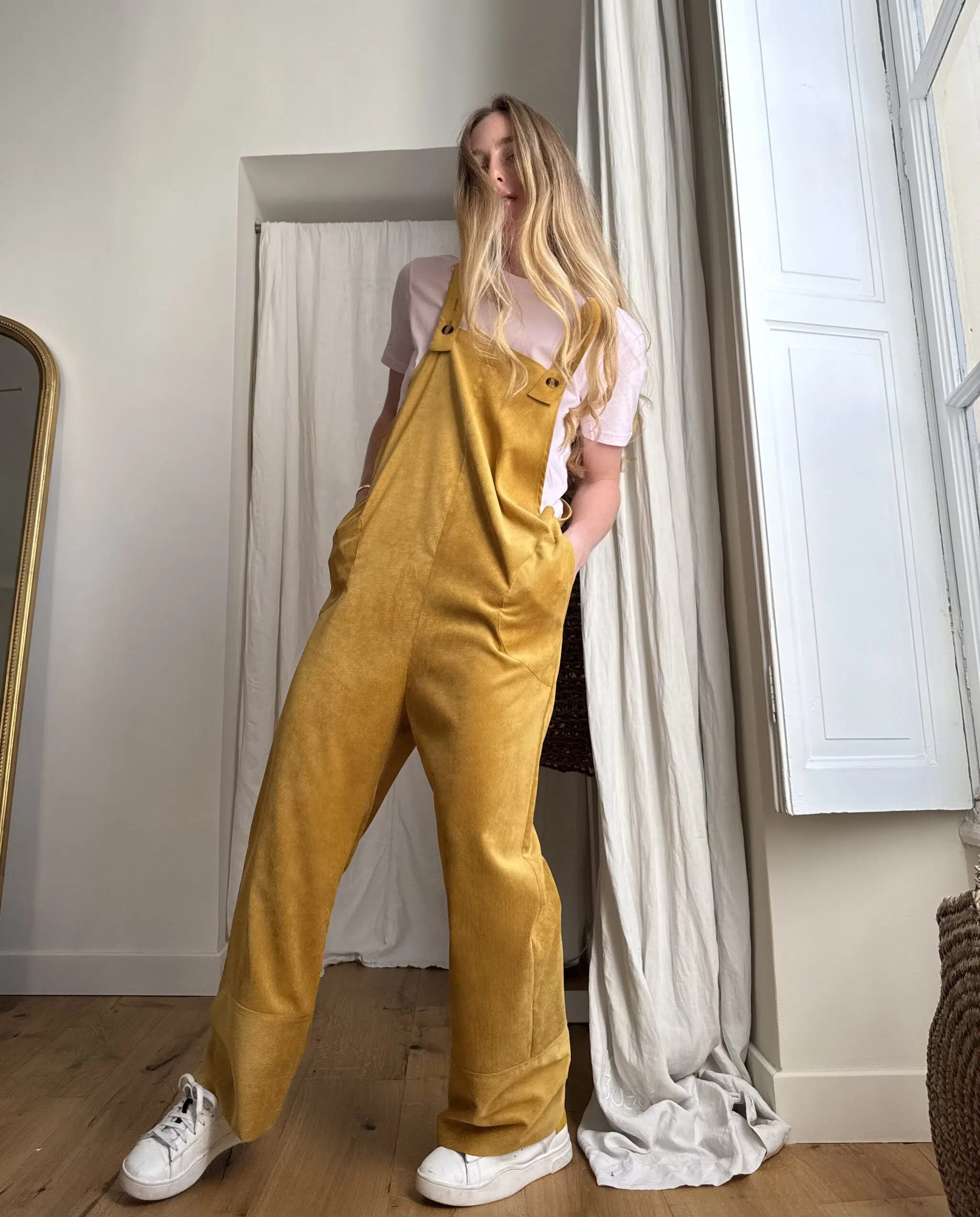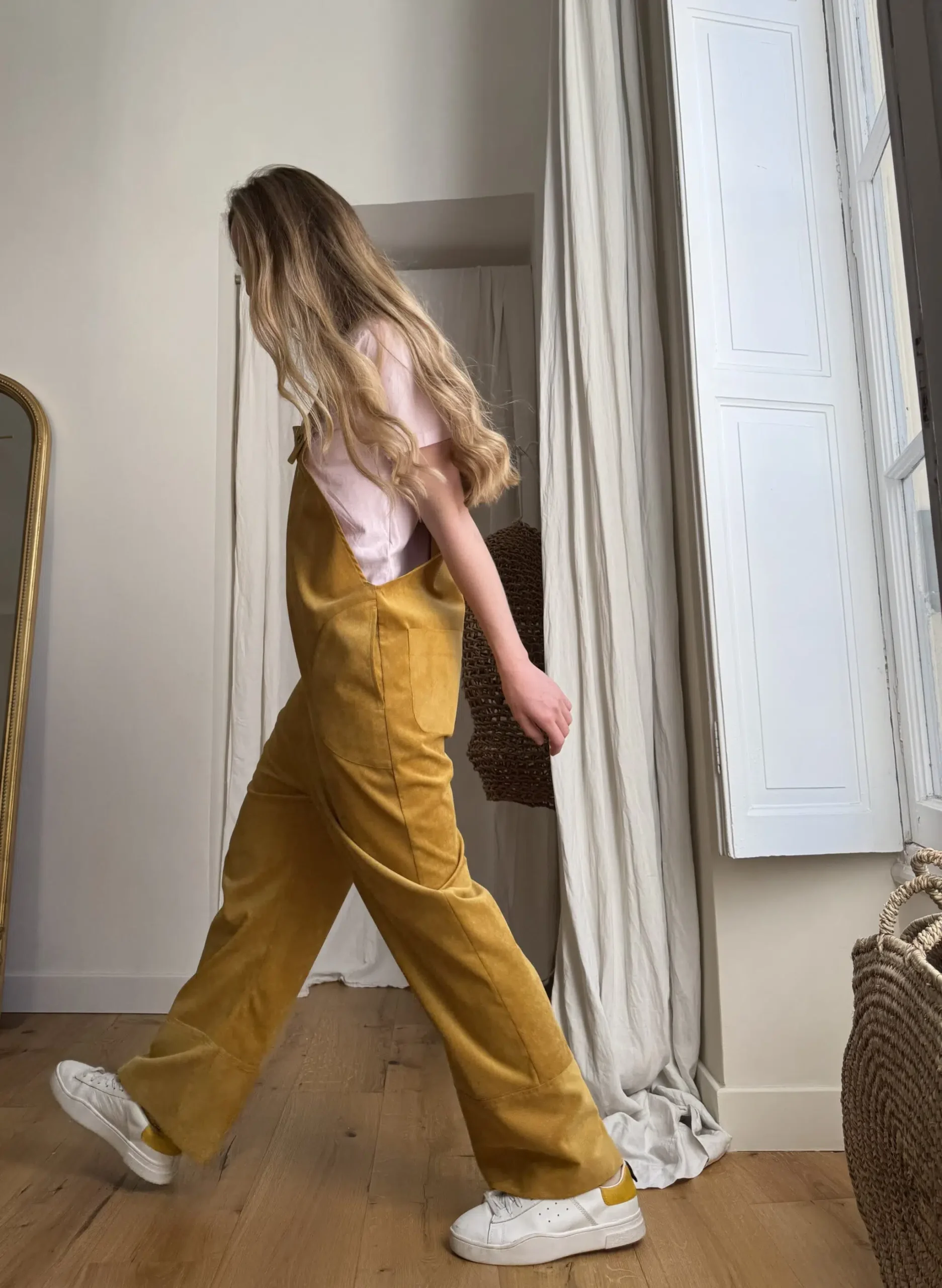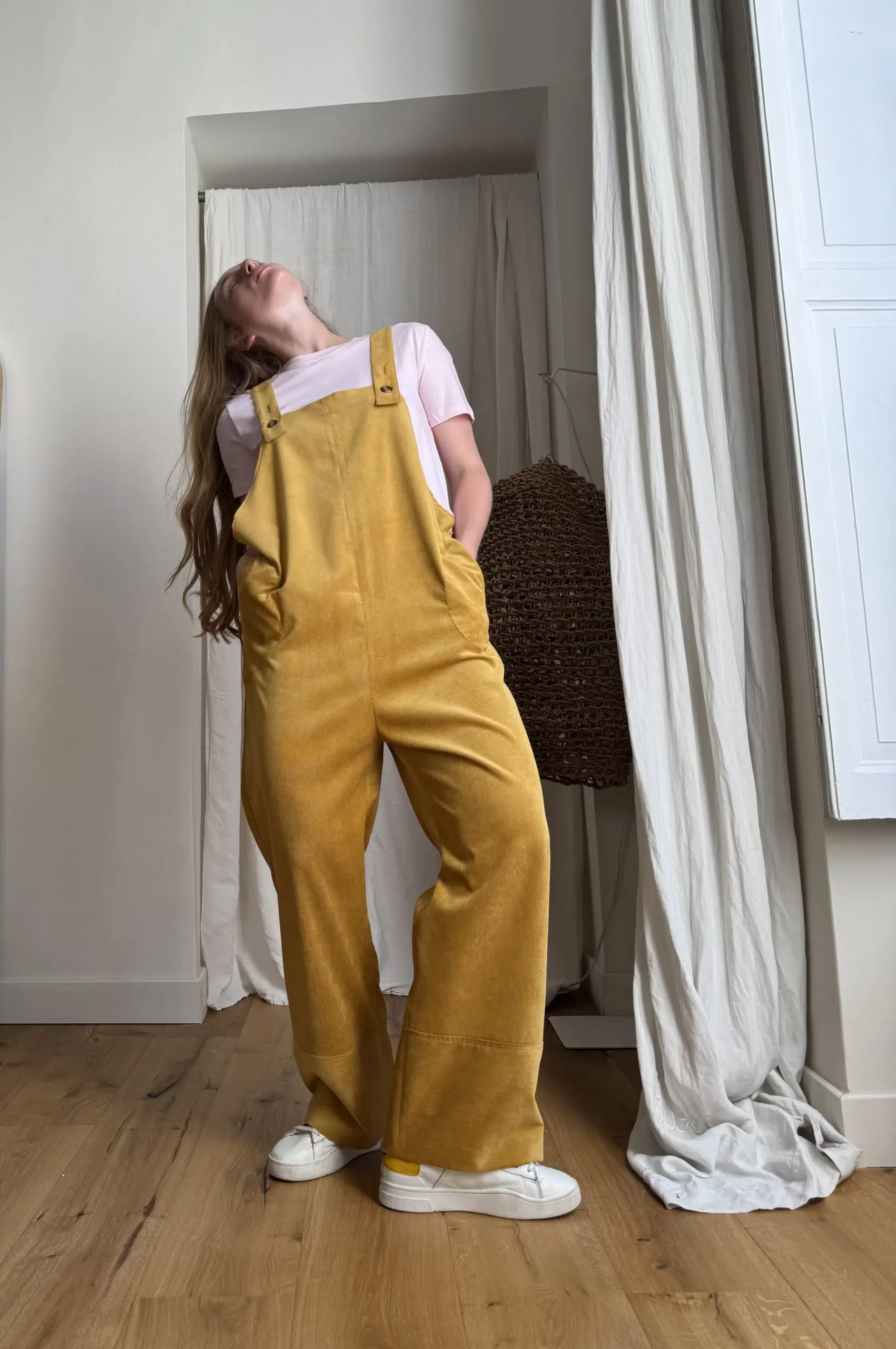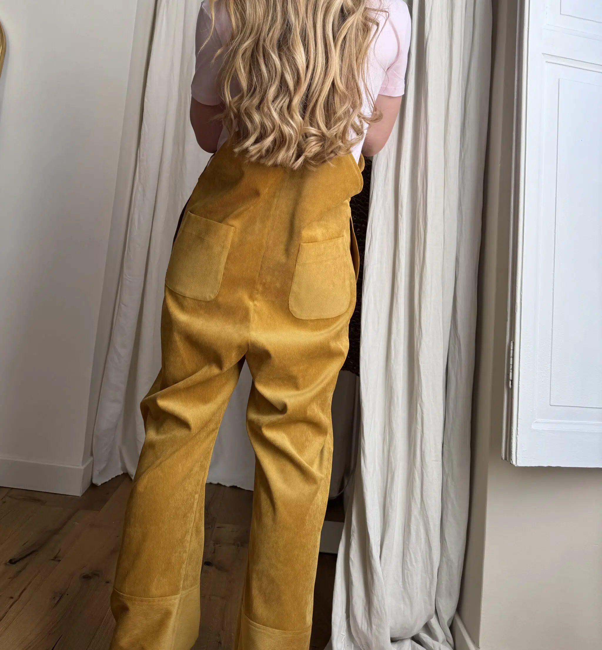 Salopette « LOUISON » dans un sublime velours milleraies ocre, poches latérales & poches arrières, bretelles réglables. Une coupe japonisante et minimaliste. PIÈCE UNIQUE