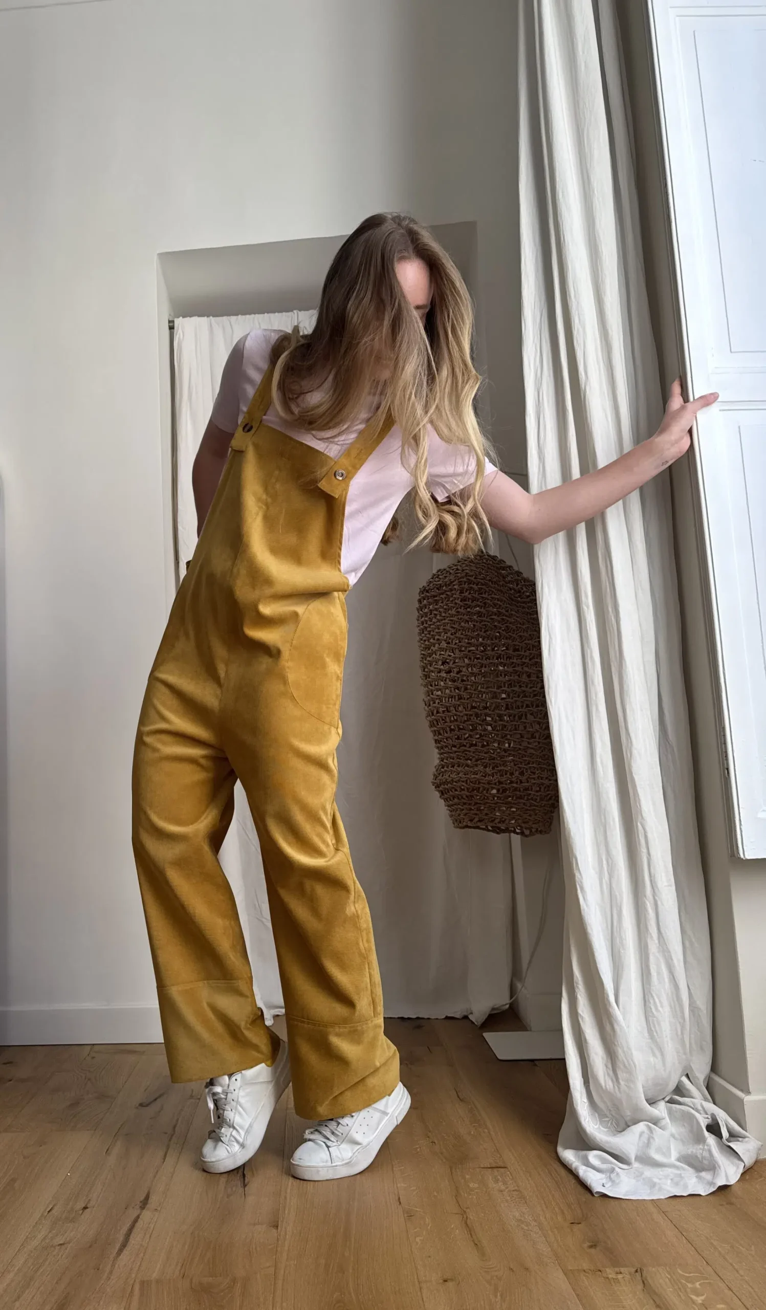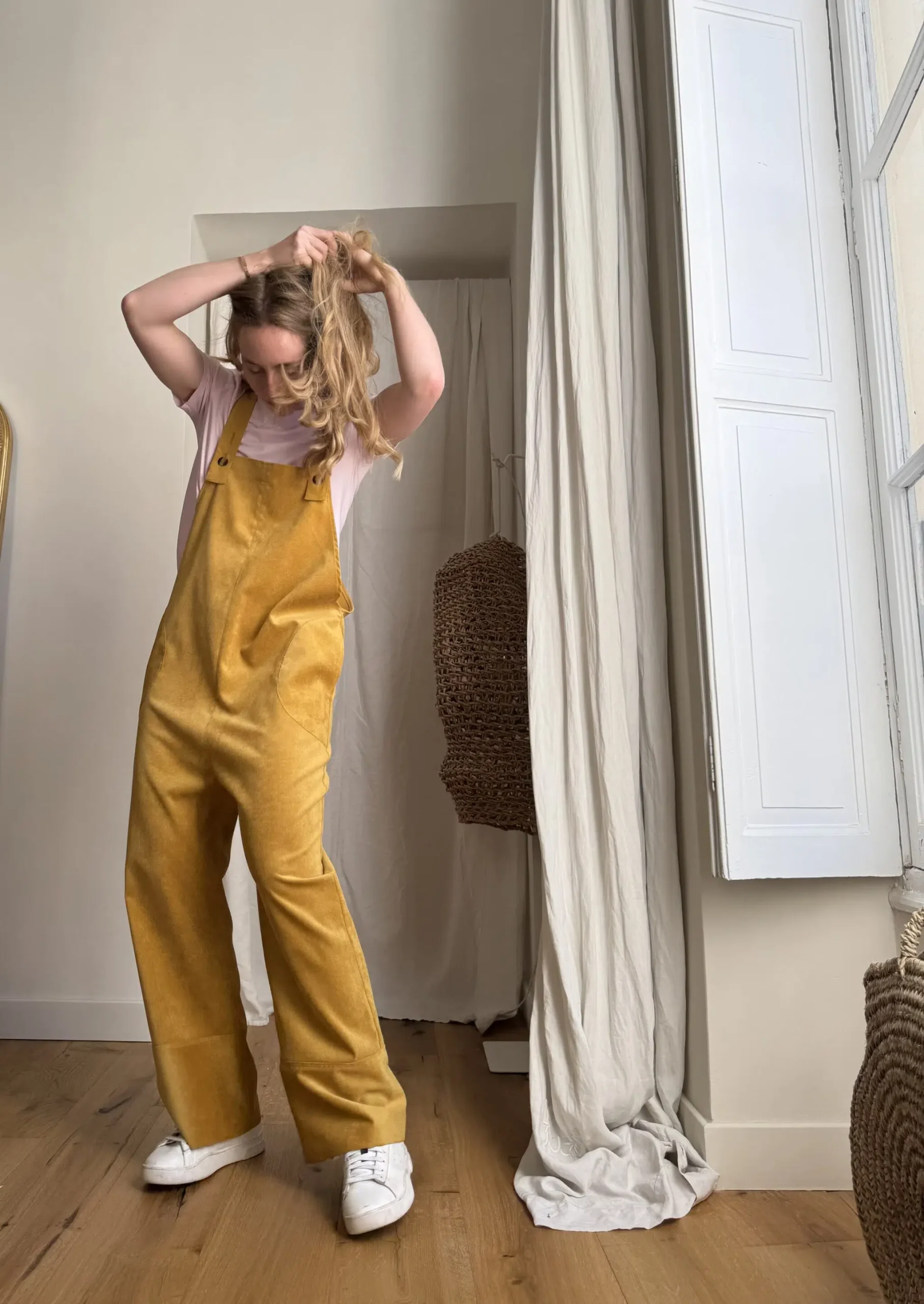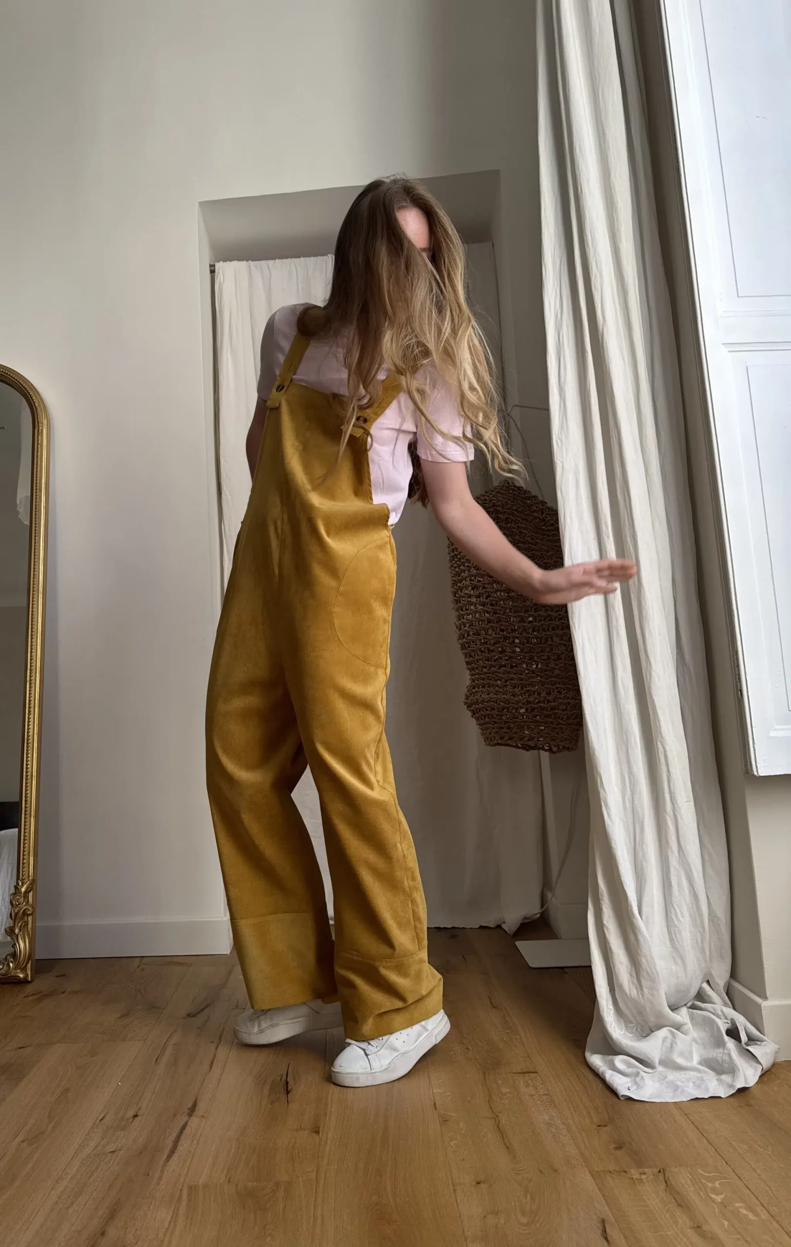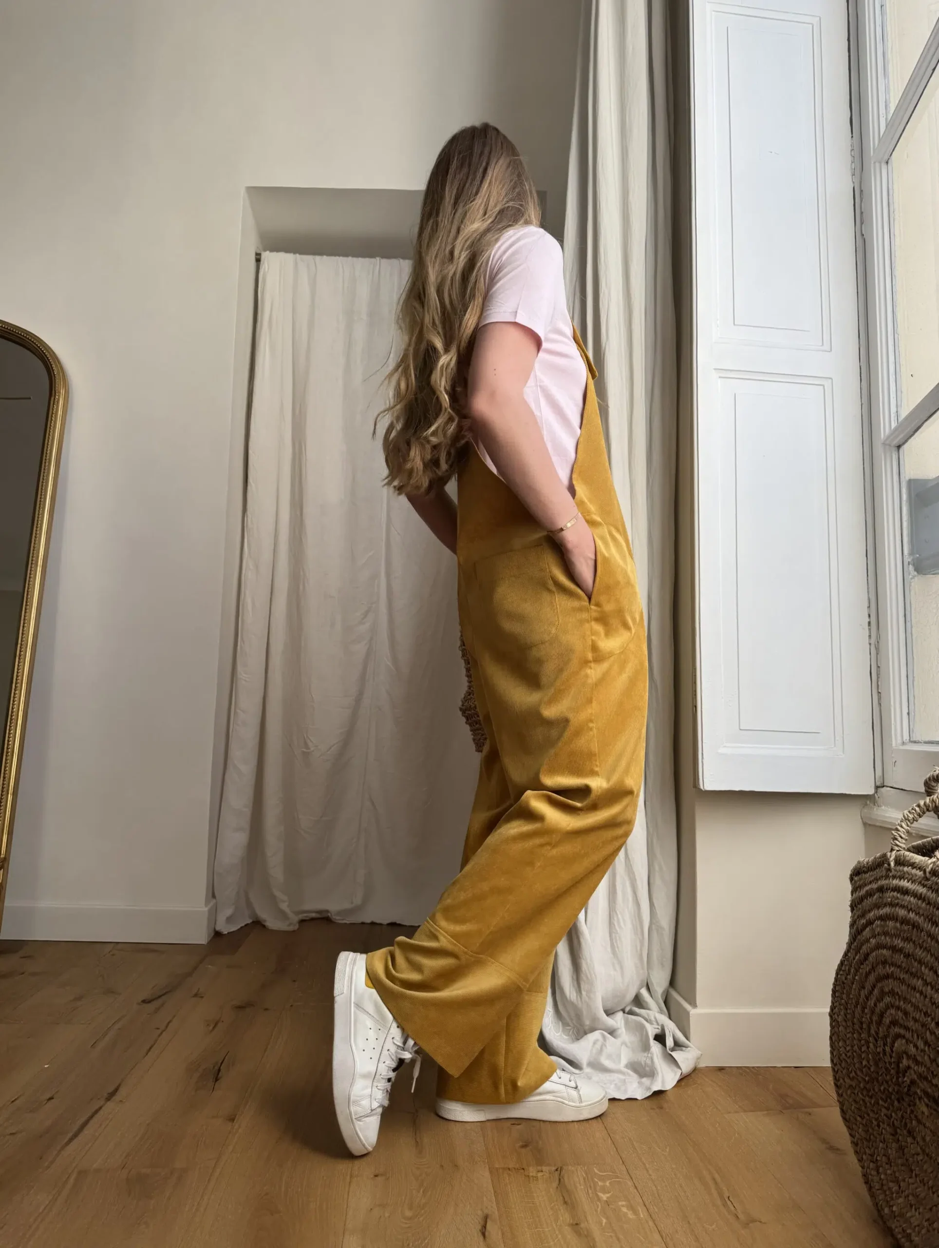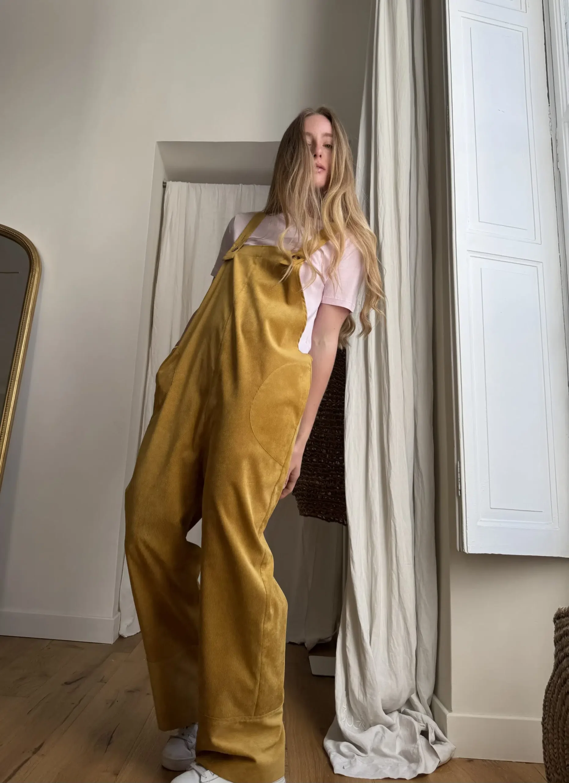 Salopette « LOUISON » dans un sublime velours milleraies ocre, poches latérales & poches arrières, bretelles réglables. Une coupe japonisante et minimaliste. PIÈCE UNIQUE