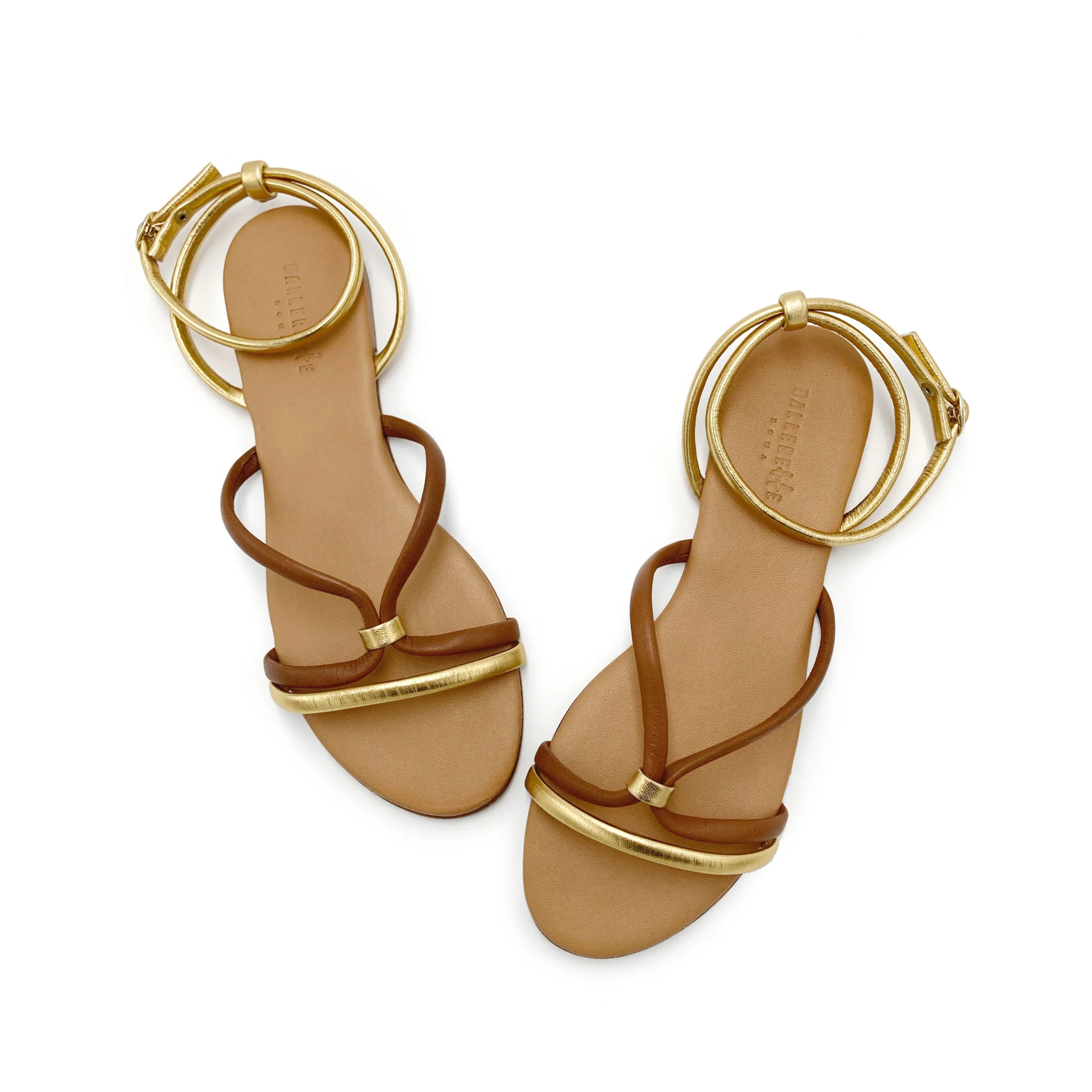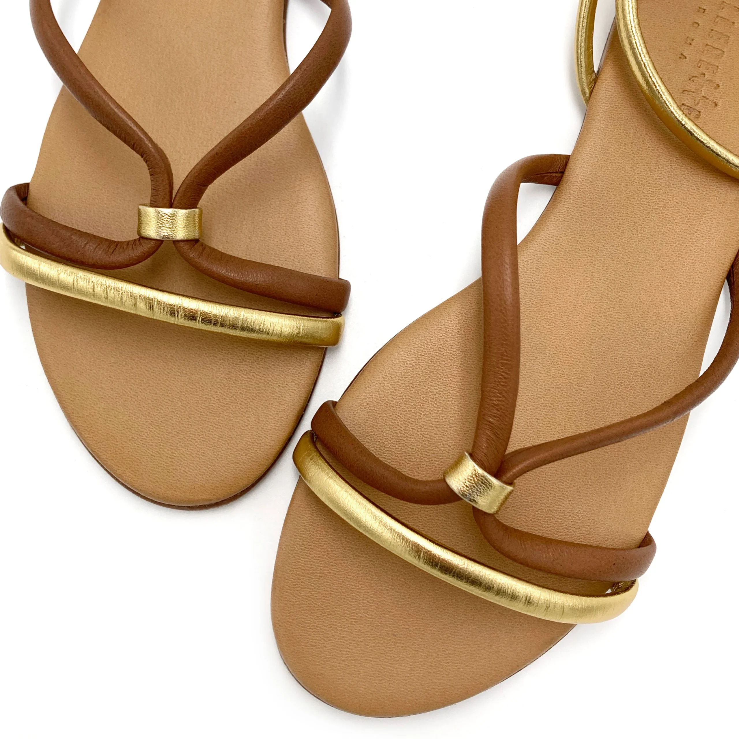 I sandali Ripetta sono realizzati interamente in pelle con laccetti intrecciati che accompagnano elegantemente il piede e cinturino alla caviglia. Il sottopiede è in pelle imbottita per dare un appoggio più morbido e confortevole. La suola è in cuoio. L’accostamento cromatico di questo modello prevede pelle di colore cuoio e pelle laminata oro in modo da creare affascinanti punti di luce. I sandali intrecciati risultano sempre estremamente femminili e possono essere indossati in diverse occasioni, sia di giorno con abiti bianchi o colorati, sia di sera sotto un fluttuante abito riamato.