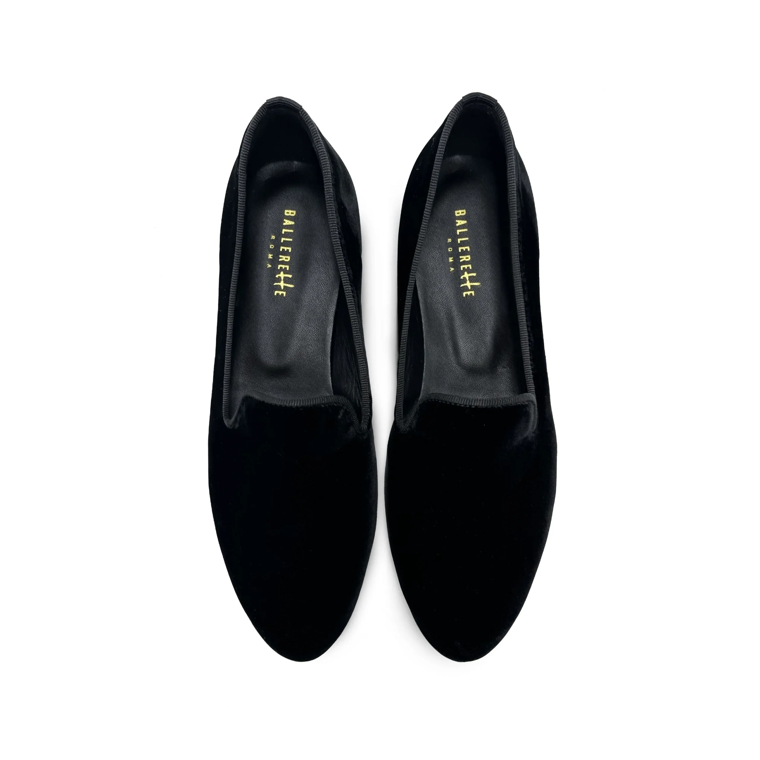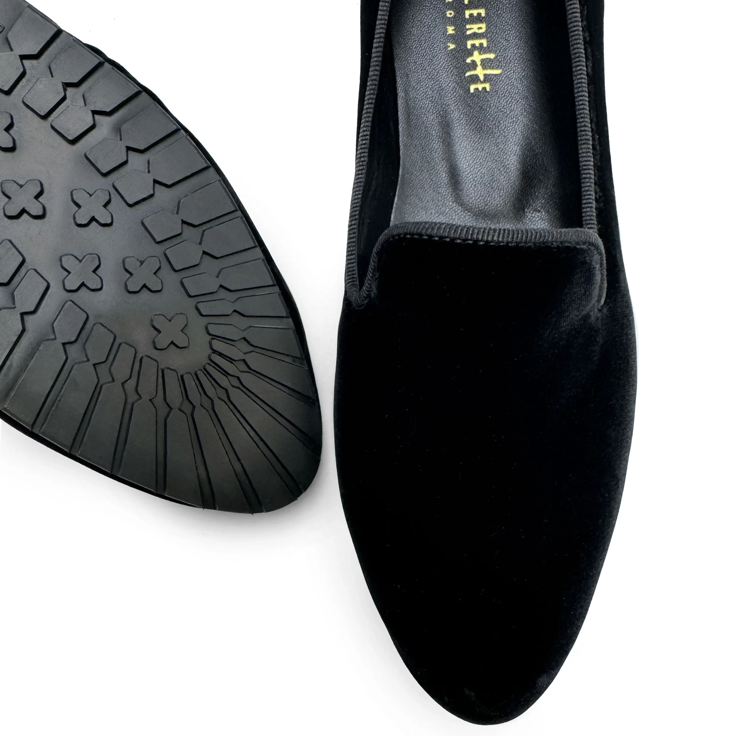 Le Aureliane sono raffinate slippers in velluto nero, resi pratici da indossare tutta la giornata, nei mesi invernali, grazie alla suola in gomma e carrarmatino anti scivolo. Caratterizzati da una linea affusulata, slanciano la figura, mentre la mascherina alta garantisce un comodo abbraccio sul piede. La fodera è in pelle nera. Passepartout per ogni occasione, a noi piace indossarle sotto un completo giacca pantalone celeste o con maglioncino a coste arancione e mini a balze in lana grigia.