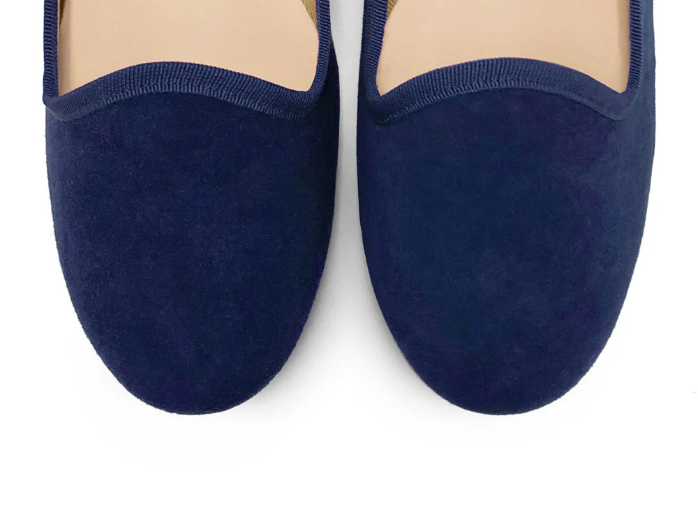 l modello di scarpe slippers della collezione Saba è un classico nella variante in camoscio blu. Il bordo in gros grain ton sur ton rifinisce la scollatura. Comode grazie al tacco basso di 0,5 cm, la tomaia in camoscio che avvolge morbidamente il piede e la pianta larga che garantisce una calzata confortevole e una camminata comoda. Versatili per creare look formali e sportivi, sono un accessorio perfetto nelle diverse stagioni con le calze e senza. L’interno del modello è foderato in cotone e il sottopiede è in pelle, il tutto in tonalità neutre. La punta è tonda. Le slipper donna in camoscio blu sono le scarpe pantofola comode ma allo stesso tempo casual e sofisticate. Questa versione in camoscio blu si adatta benissimo a uno stile casual con il denim: dalla minigonna al jeans, la scelta di queste slippers blu sarà efficace. Per un look casual chic da aperitivo indossale con un doppiopetto principe di Galles dalla misura oversize e un pantalone alla caviglia skinny. Se preferisci una mise ricercata e differente utilizza le slippers blu per un look etno-chic con pantalone in seta shantung arancione, camicia e fascia turbante in testa.