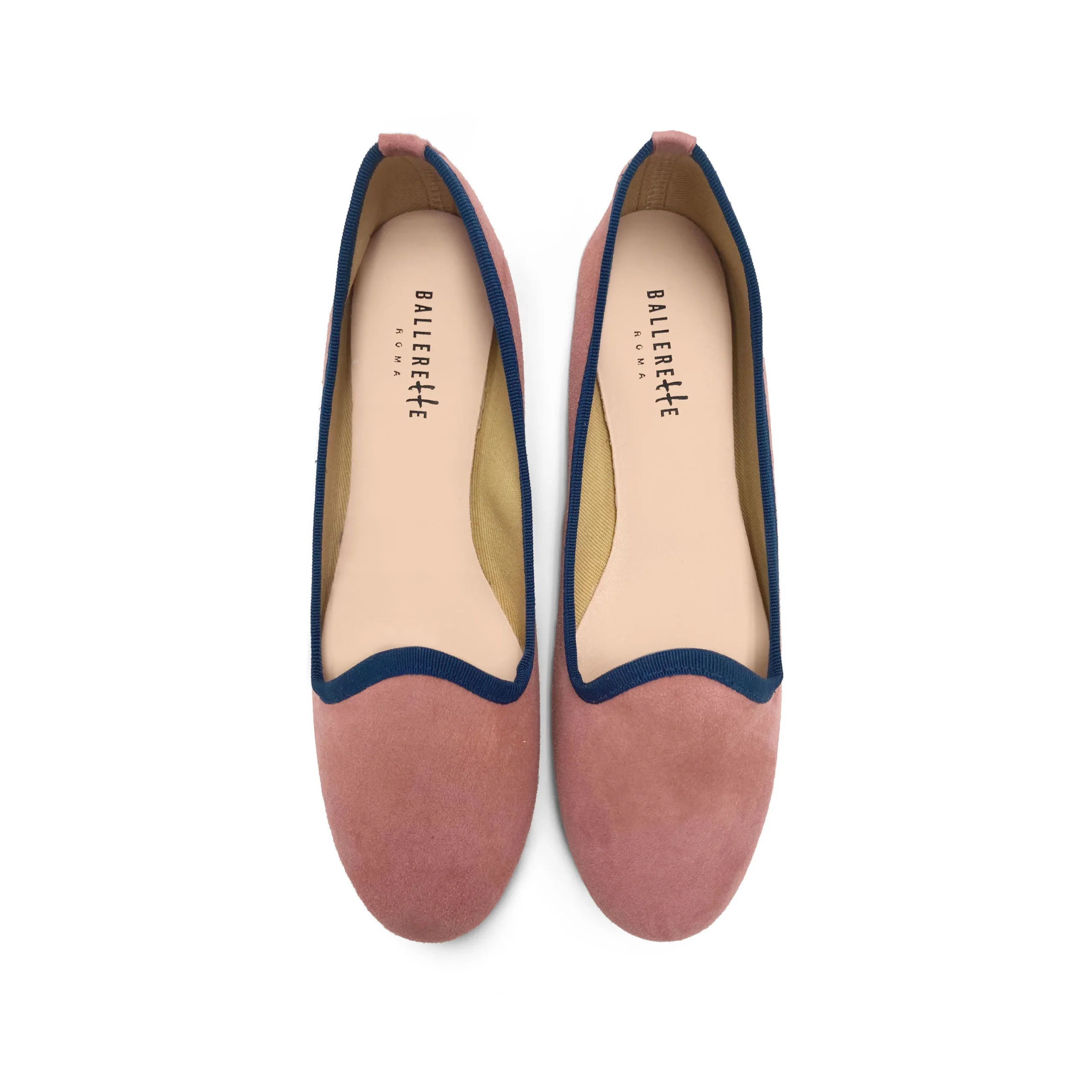 Le Saba sono slippers da donna stile « friulane » amate per la loro comodità e per lo stile elegante e versatile. Il disegno minimal del modello ha mascherina alta che accompagna il piede, punta tonda e tacco basso di 0,5 cm. L’interno è foderato in cotone con sottopiede in pelle in modo che si possano indossare comodamente in tutte le stagioni. Realizzate in morbido camoscio di colore rosa antico scuro, hanno bordo in gros grain di cotone blu intenso. Indossale sotto un completo blu navy in ufficio, o abbinale a un abito dalle tinte nude per un cocktail serale.