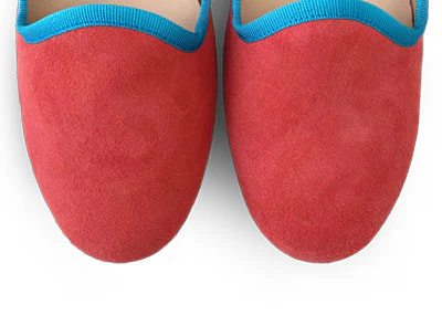 Le slippers Saba sono pantofoline da donne al contempo minimal e sofisticate. La forma a punta tonda e la mascherina alta sono sottolineate dal gros grain blu mare, a contrasto cromatico con la tomaia in camoscio rosa corallo. L’interno è foderato in cotone e il sottopiede è in morbida pelle, ad assicurare un comodo indosso tutta la giornata.