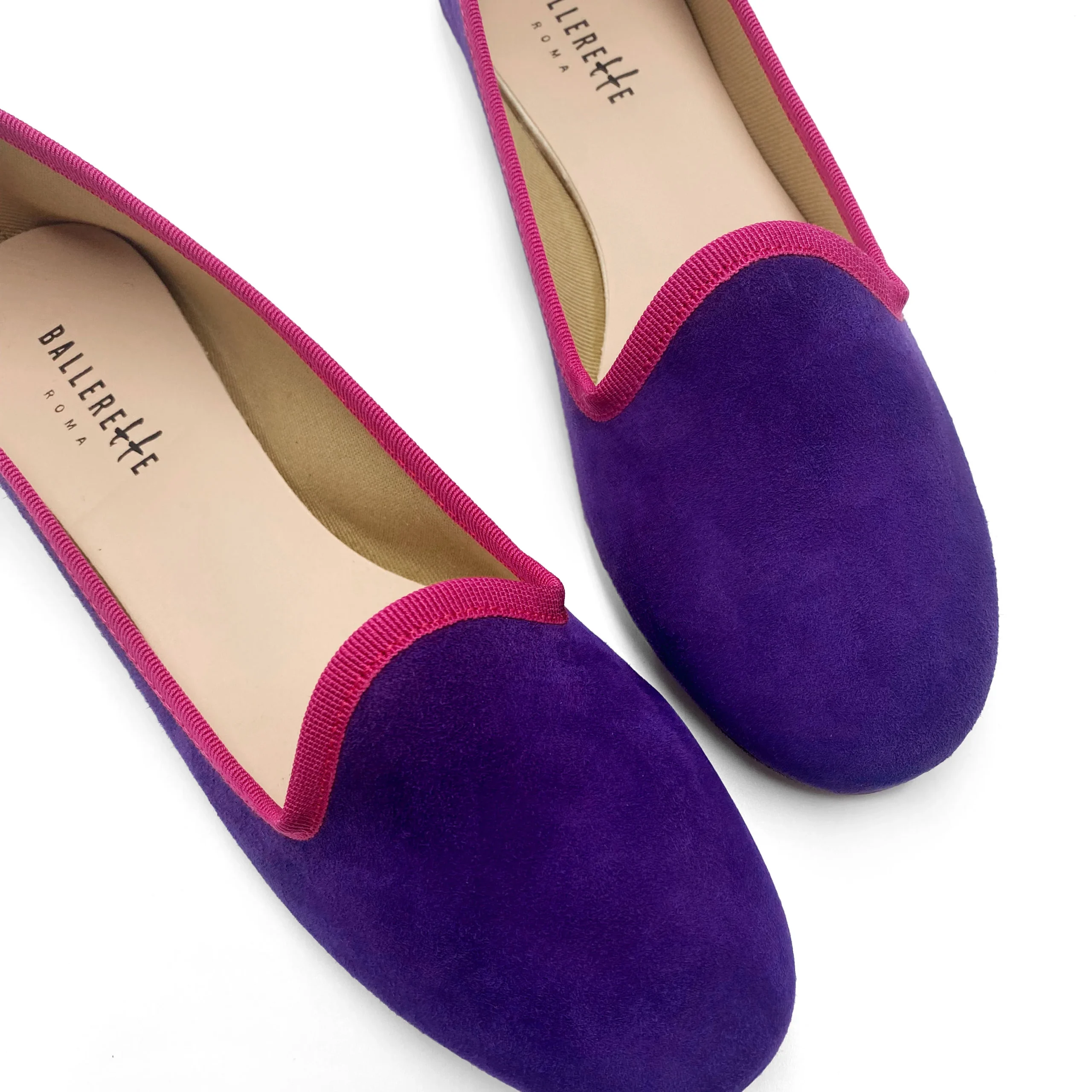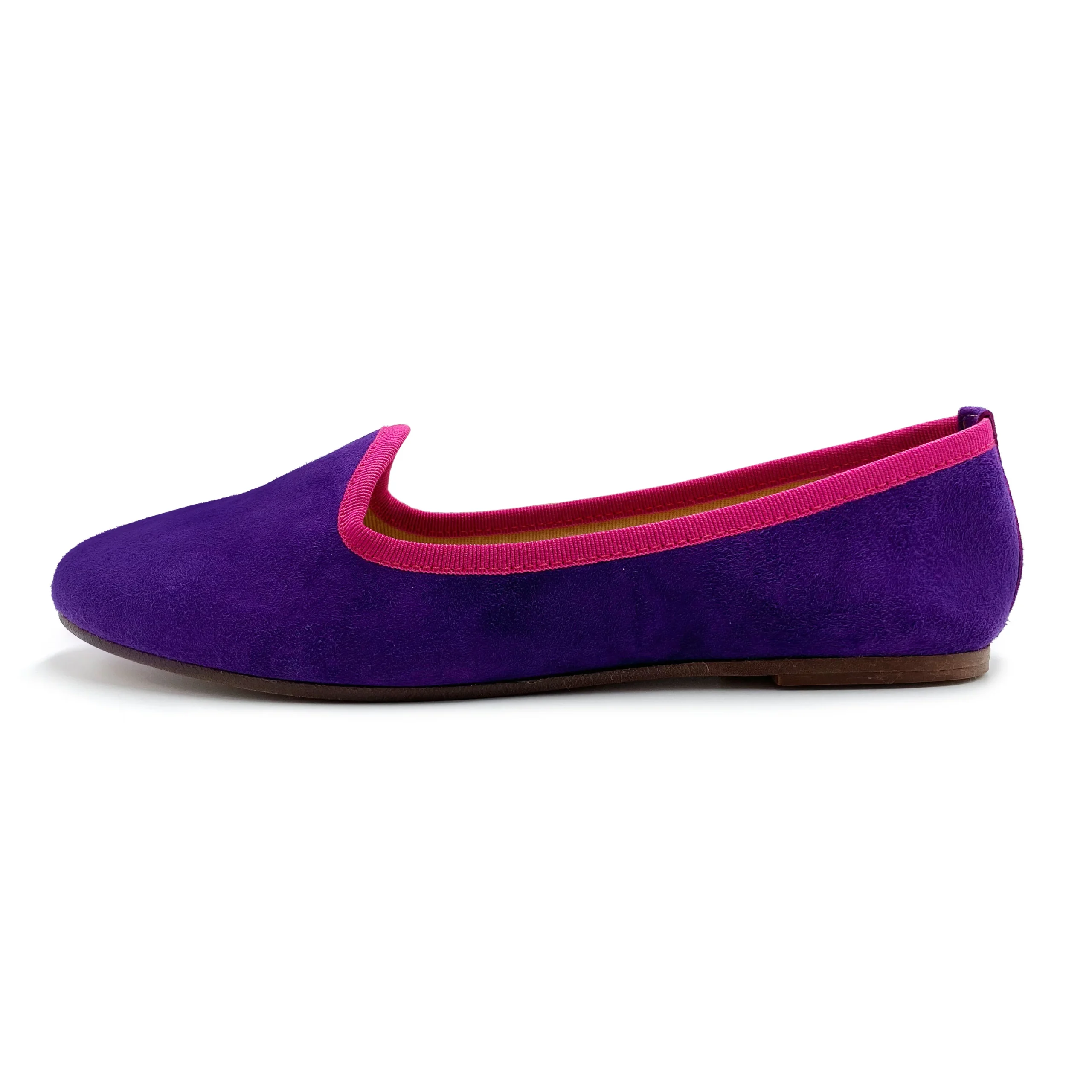 La collezione delle slippers Saba si amplia con nuovi divertenti colori. La versione in camoscio viola ha un gros grain fucsia che ne esalta la luminosità e il contrasto. Questo modello a pantofolina ha un tacco basso di 0,5 cm e avvolge perfettamente ogni tipo di piede con la sua punta tonda e la comoda mascherina alta. La fodera interna è in cotone e il sottopiede in pelle. Un abito attillato in maglia verde mela creerà un gioco di colori molto interessante.