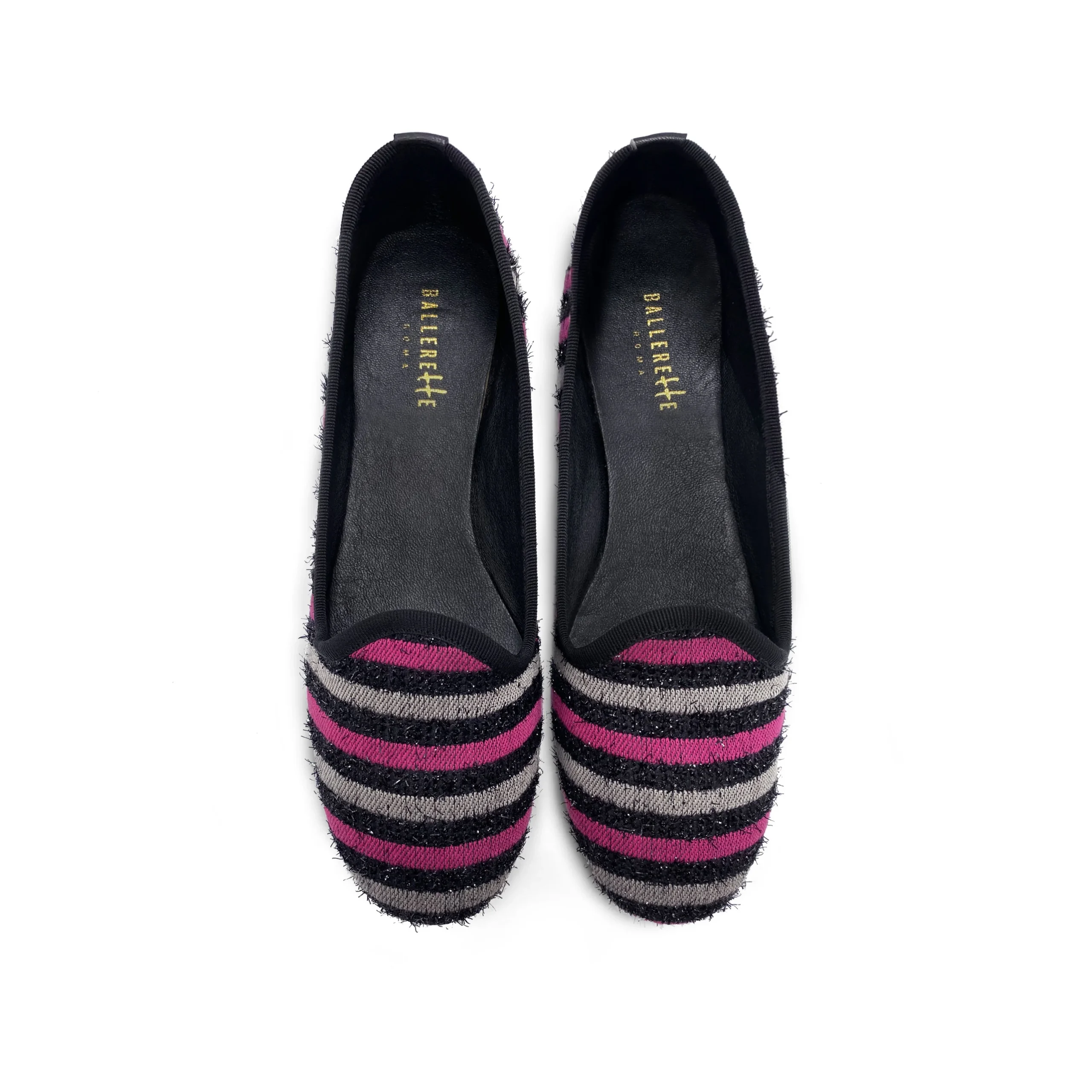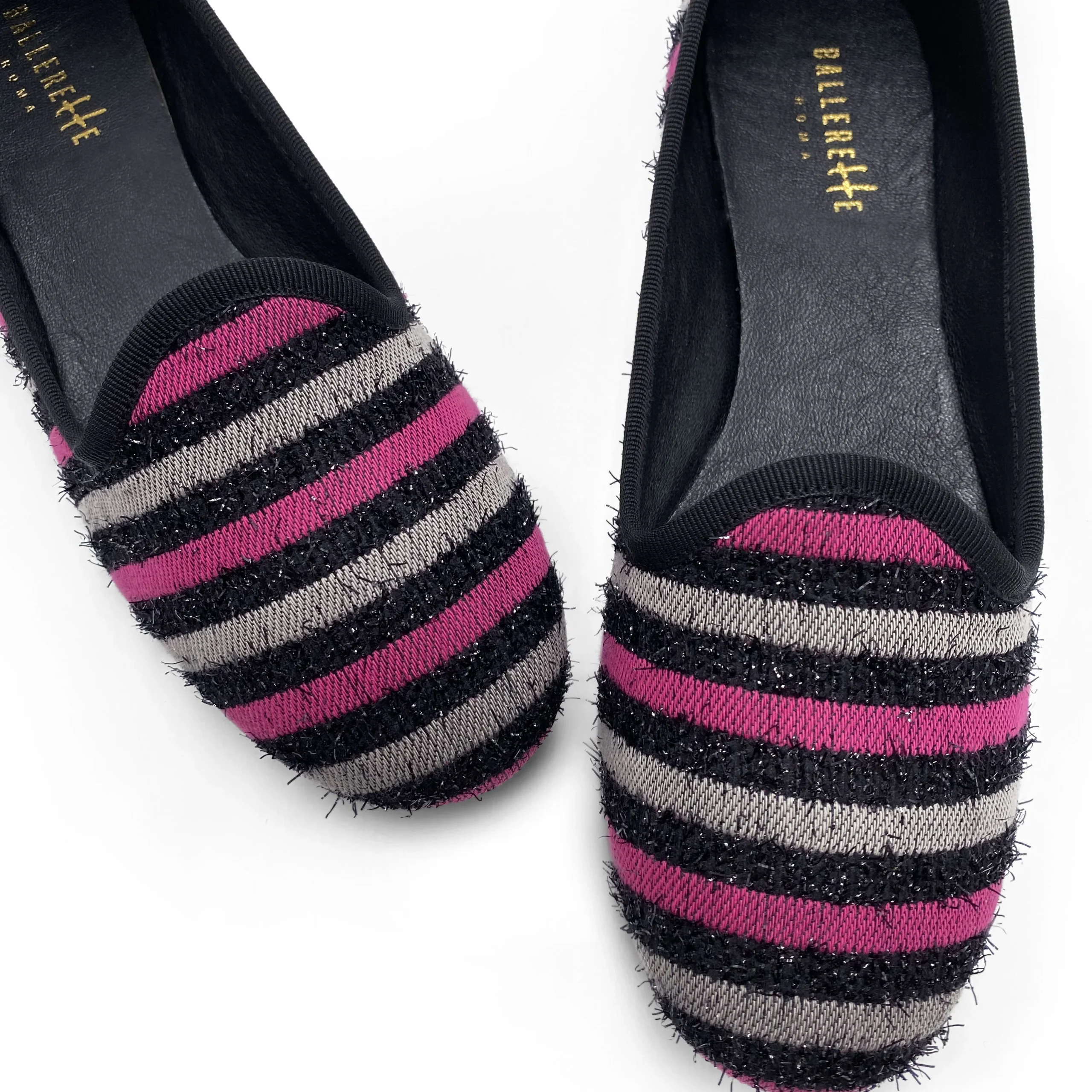 Fuxia, grigio e nero: i fantastici colori delle nostre Saba a righe in tessuto. Queste slippers dal fascino irrinunciabile sono un must have della stagione. Originali nella fantasia e comodissime, grazie al sottopiede in pelle e la calzata avvolgente, sono una furlana con la costruzione di una ballerina, versatili e adatte a tutte le fisionomie di piede. Le righe nere hanno un leggero effetto luminoso che danno un tocco glamour e night alla scarpa. Perfette perciò da indossare la sera con una mini gonna nera, collant lavorati e un maglioncino a scatoletta sui toni del lilla, si sposeranno alla perfezione anche di giorno con un pantalone con pinces e giacca da uomo oversize.
