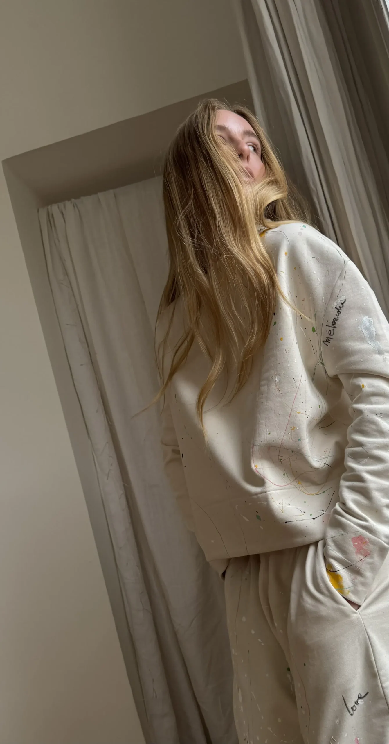 Sweat-shirt en coton molleton écru peint et brodé à la main, customisé. Une coupe minimaliste et intemporelle. PIÈCE UNIQUE