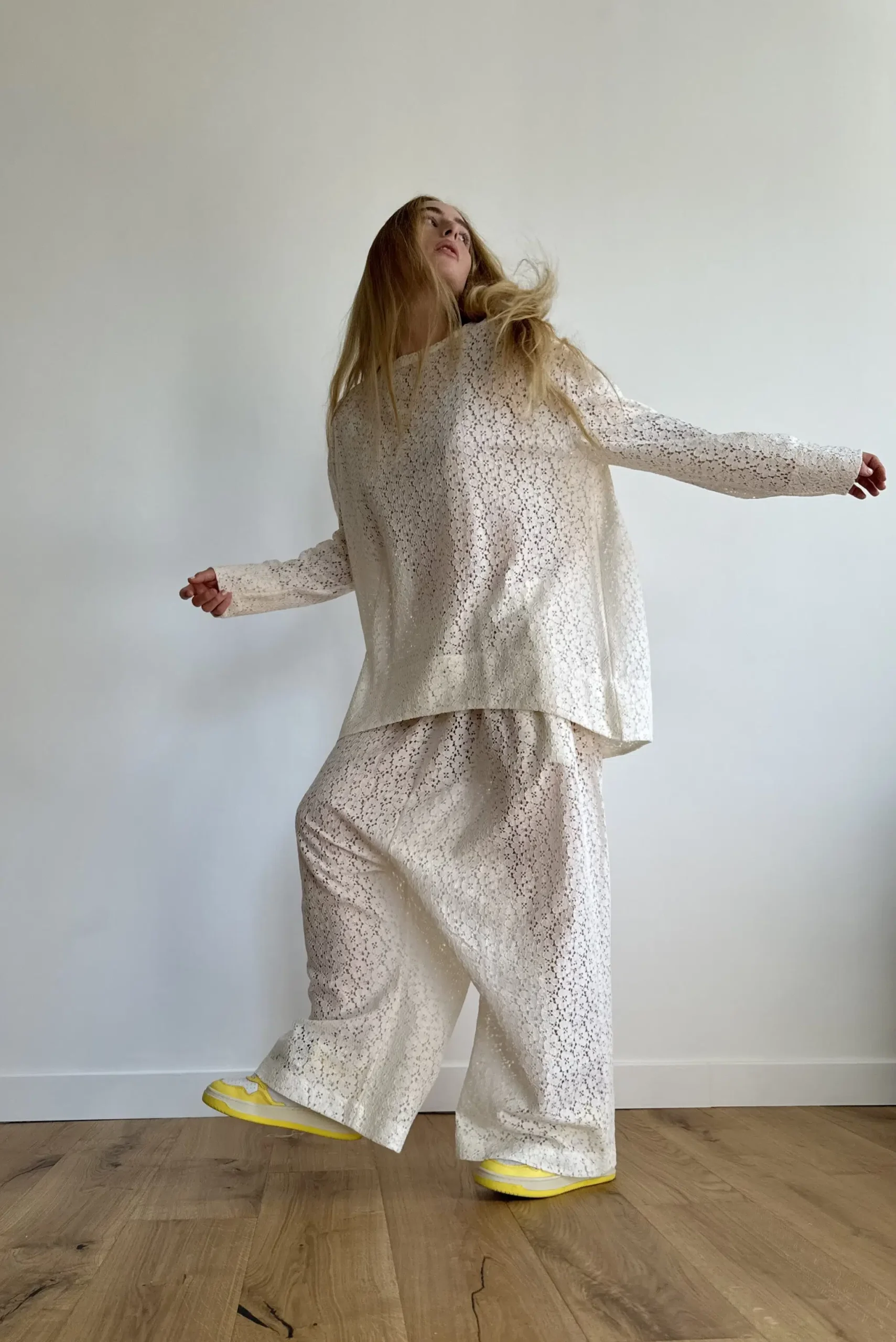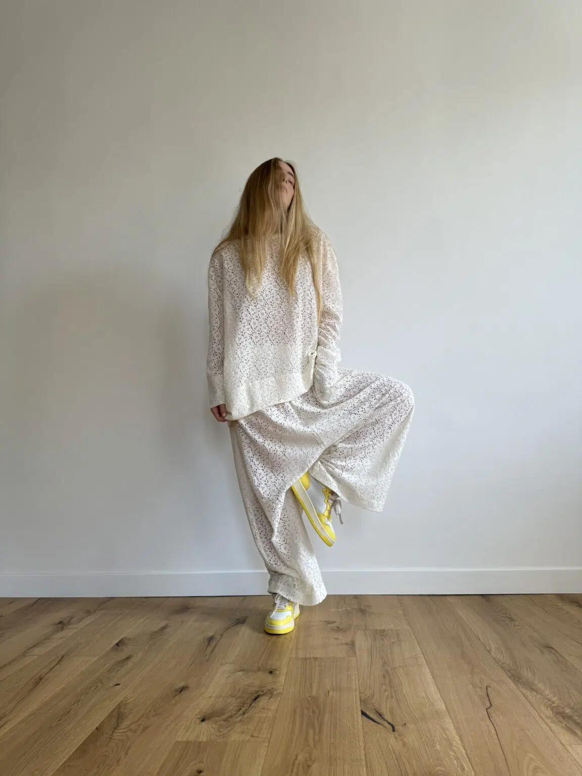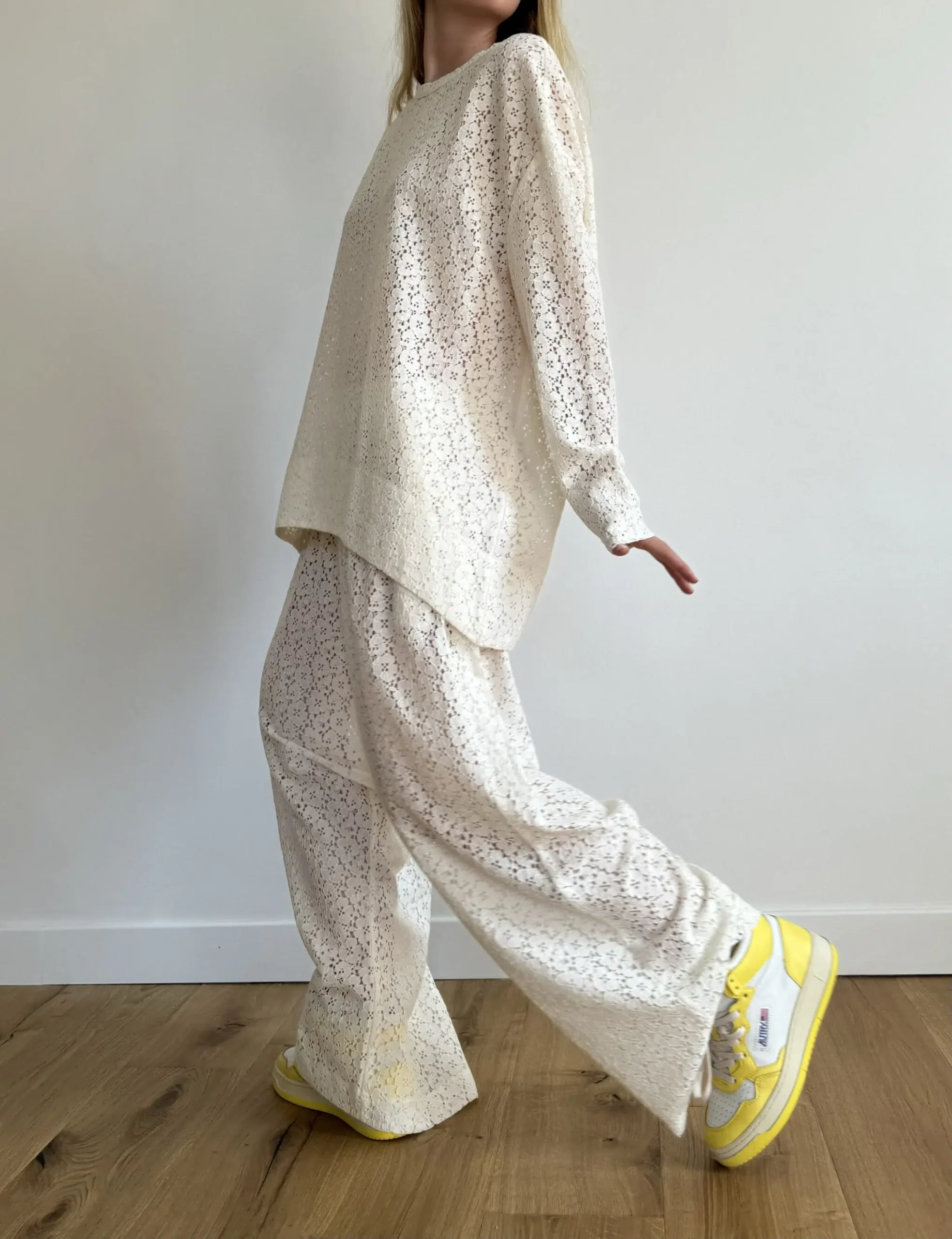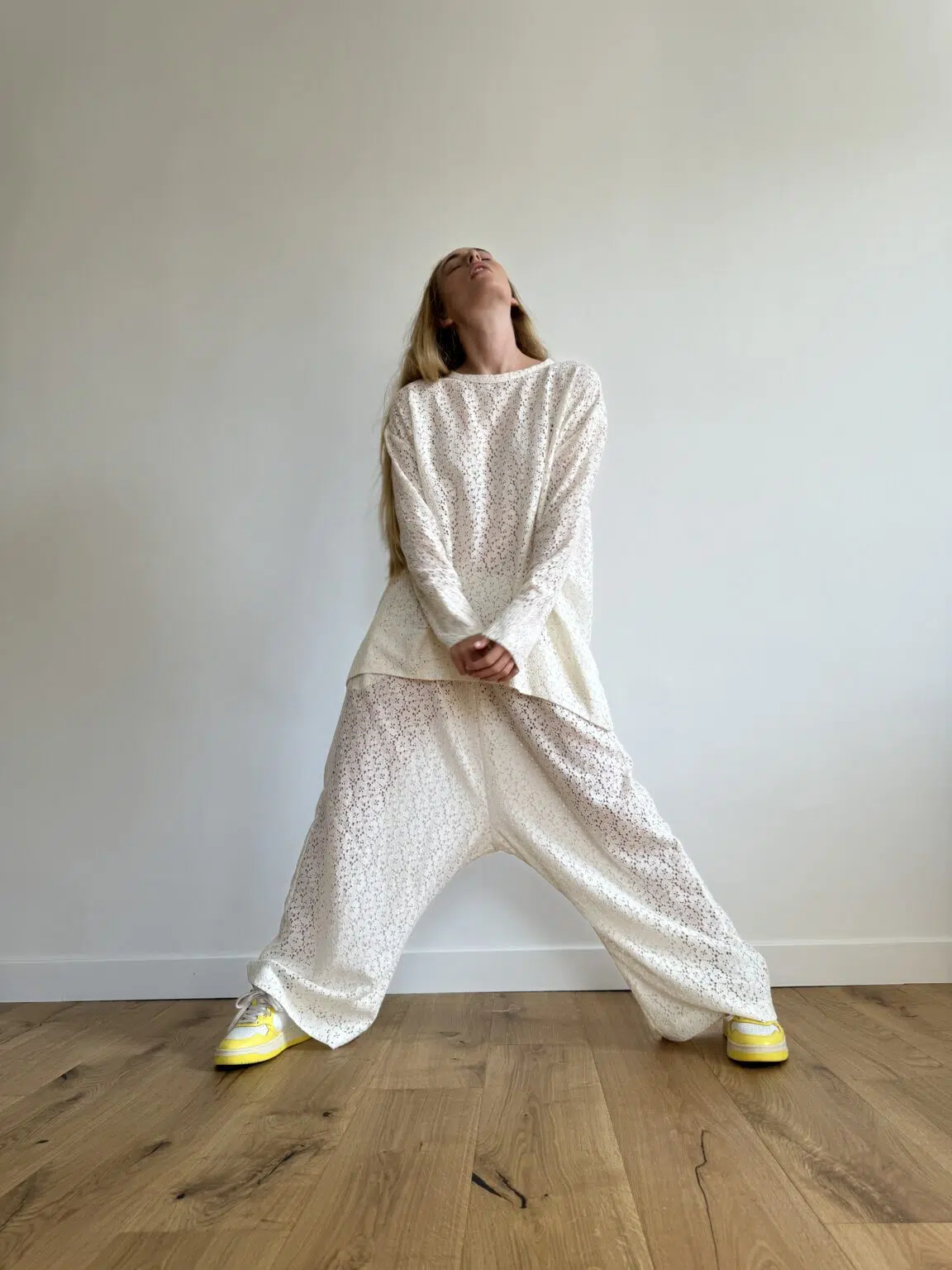 Sweat-shirt dans une sublime dentelle écrue, douce et légère. Col rond, bas de sweat-shirt arrondi. Une coupe oversize, minimaliste et intemporelle. Petite édition.