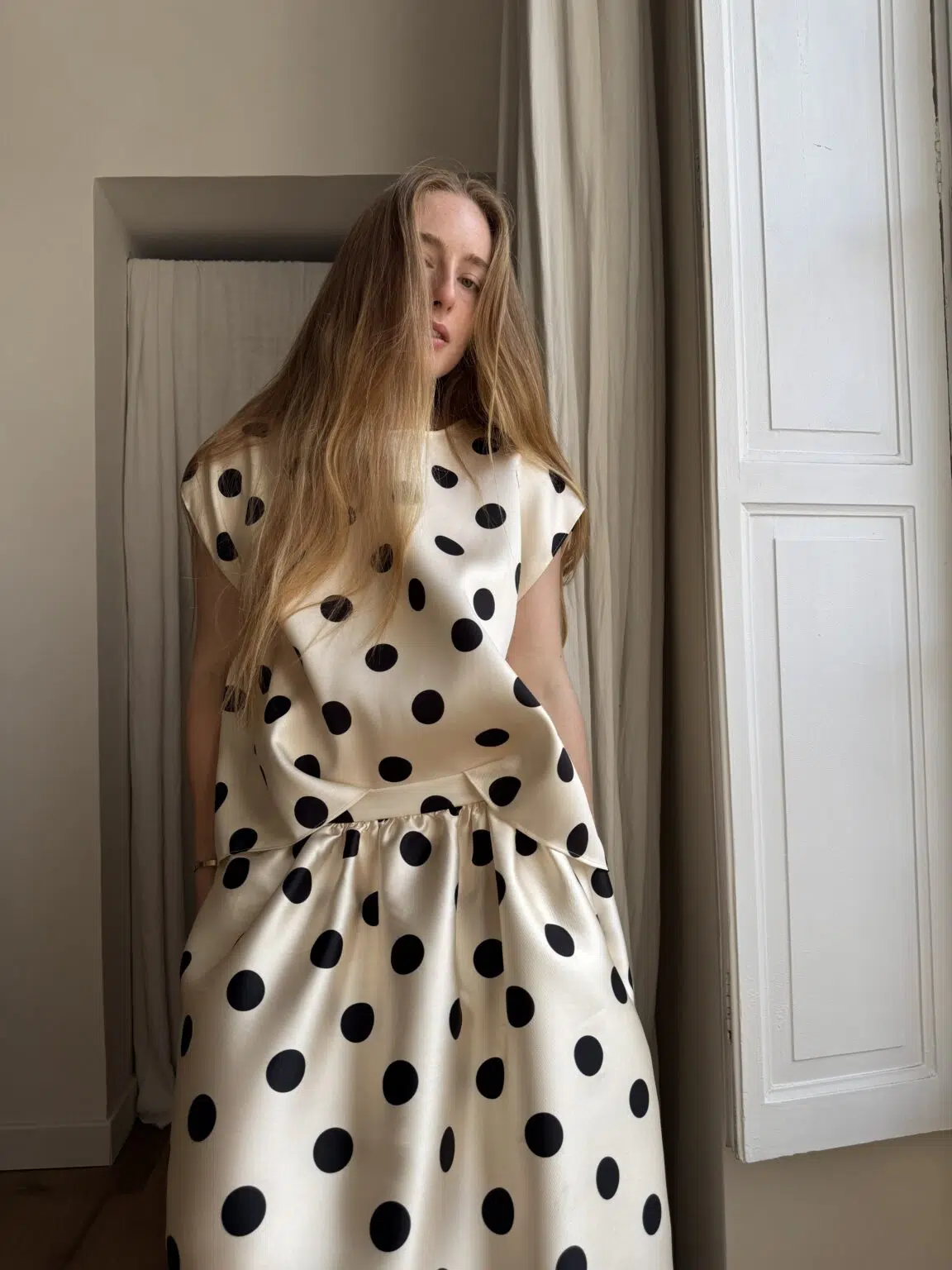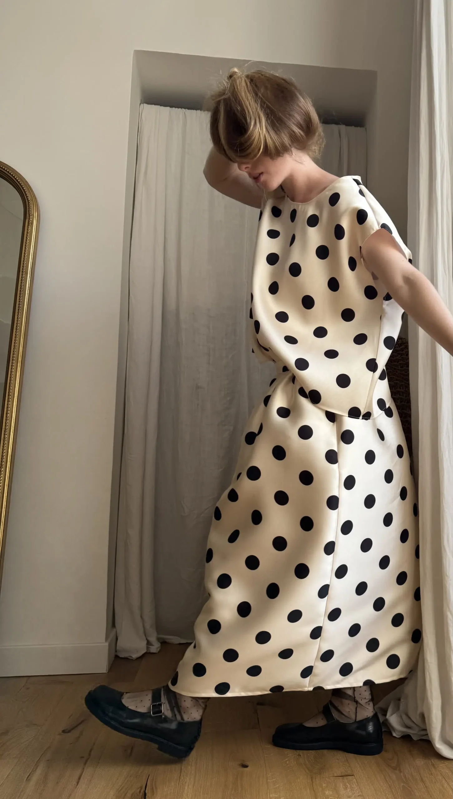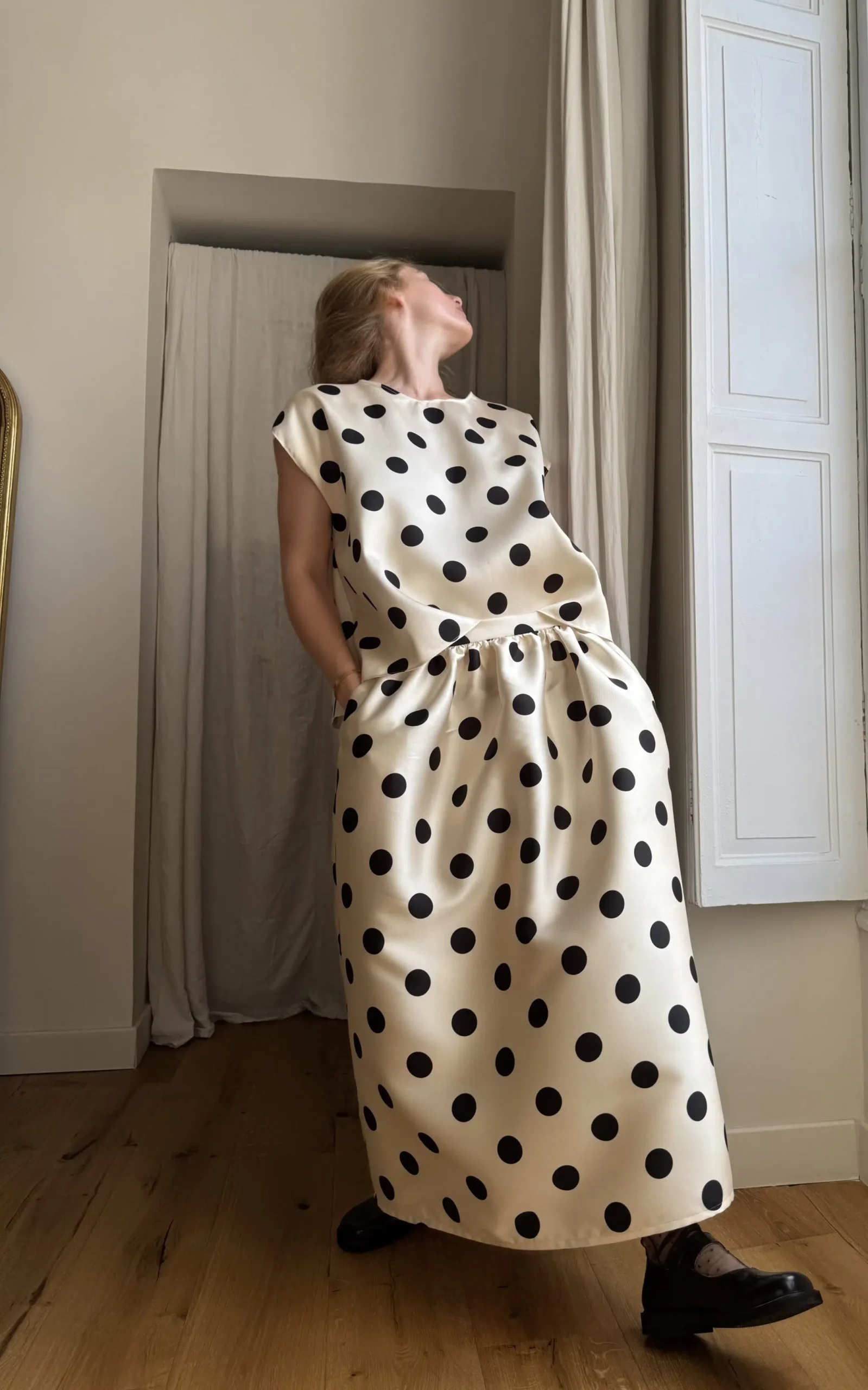 Sweat-shirt sans manche à pois noir sur fond nacre. Une coupe minimaliste et intemporelle. PETITE ÉDITION