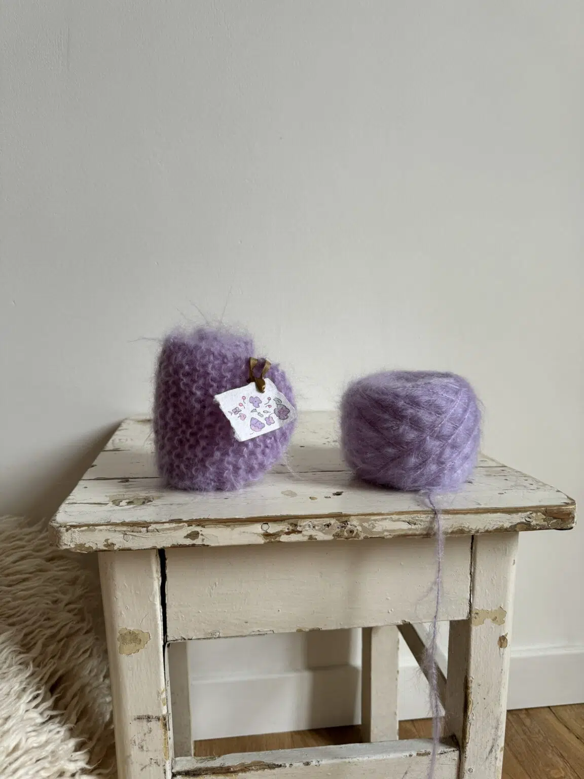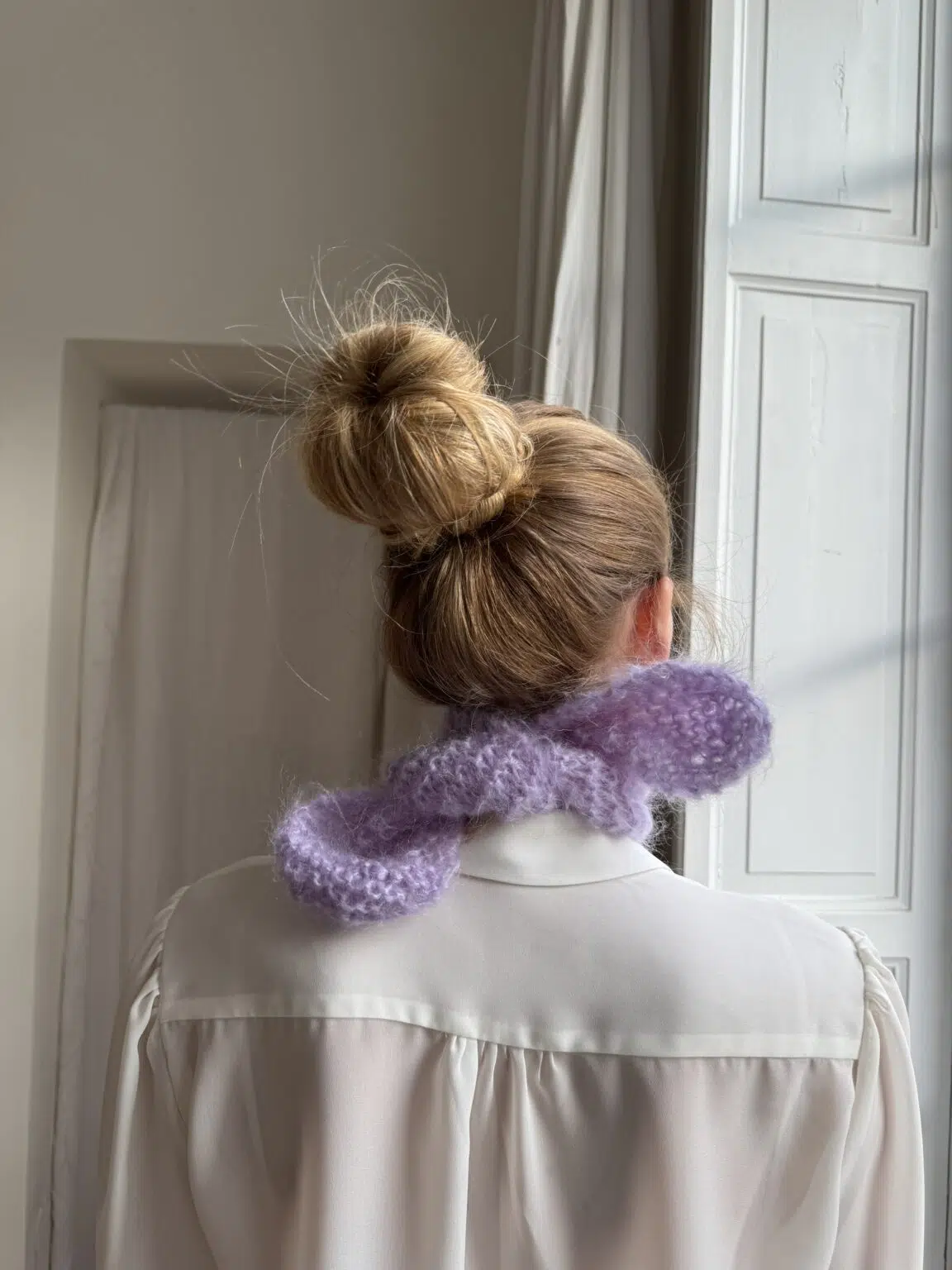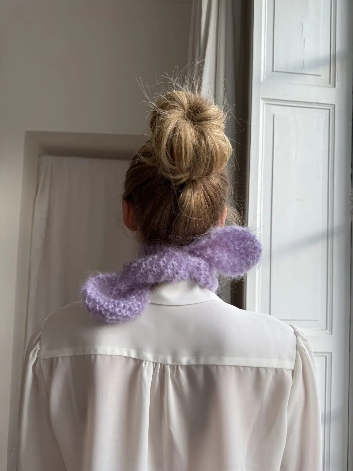 Tour de cou tricoté main en kid mohair coloris glycine. Doux tel un câlin. PIÈCE UNIQUE