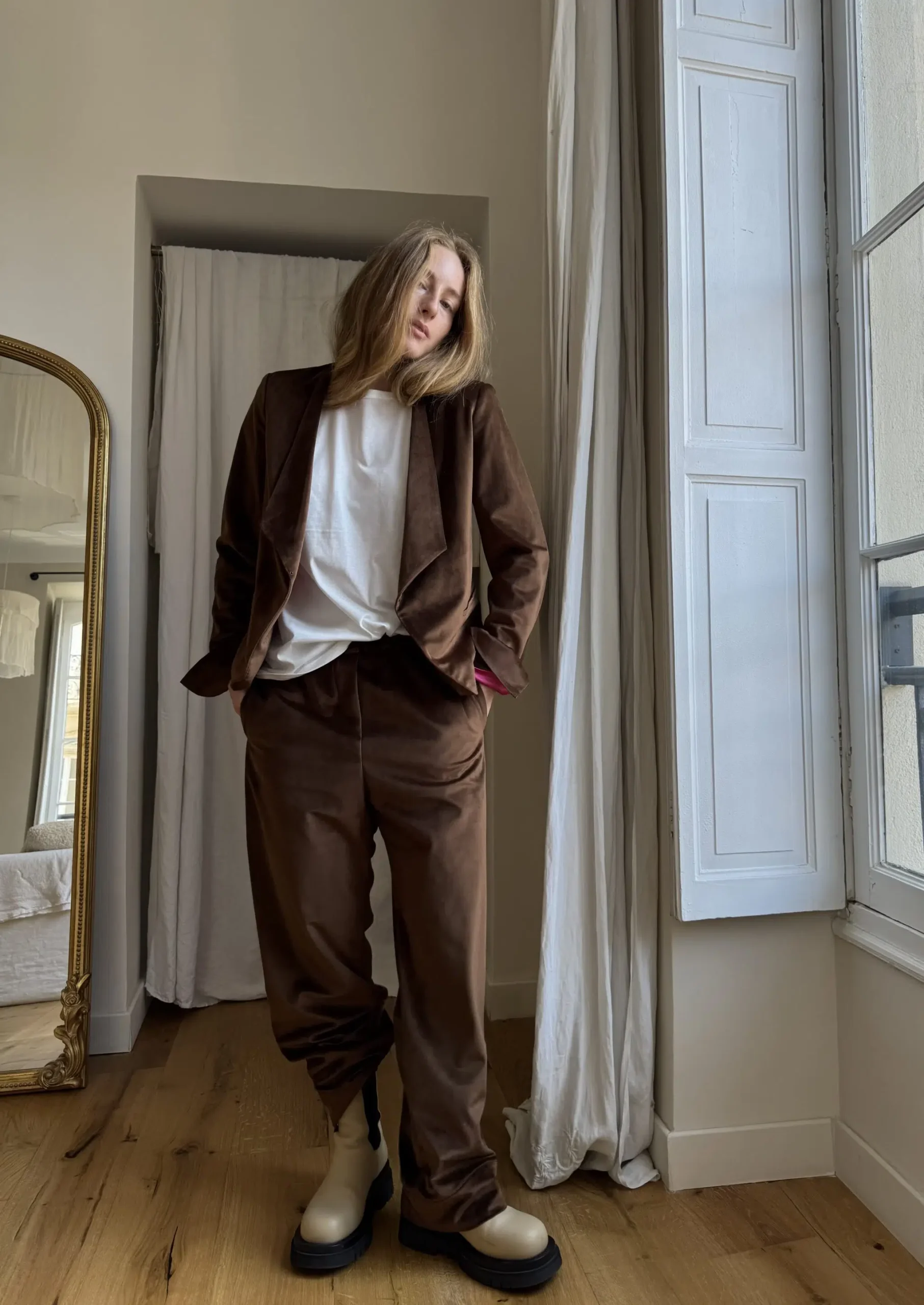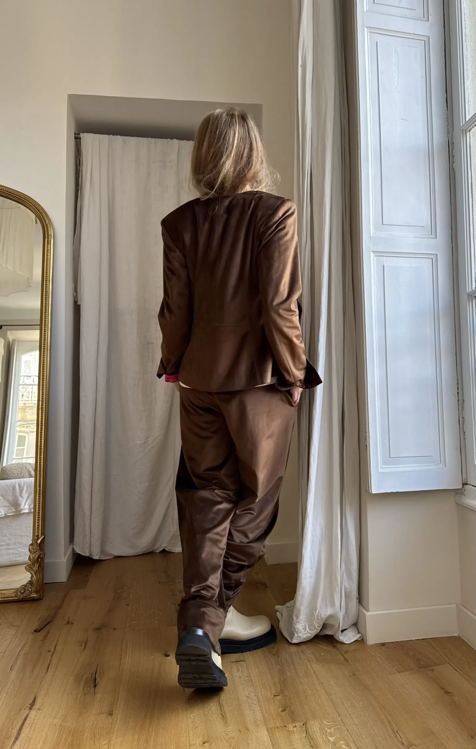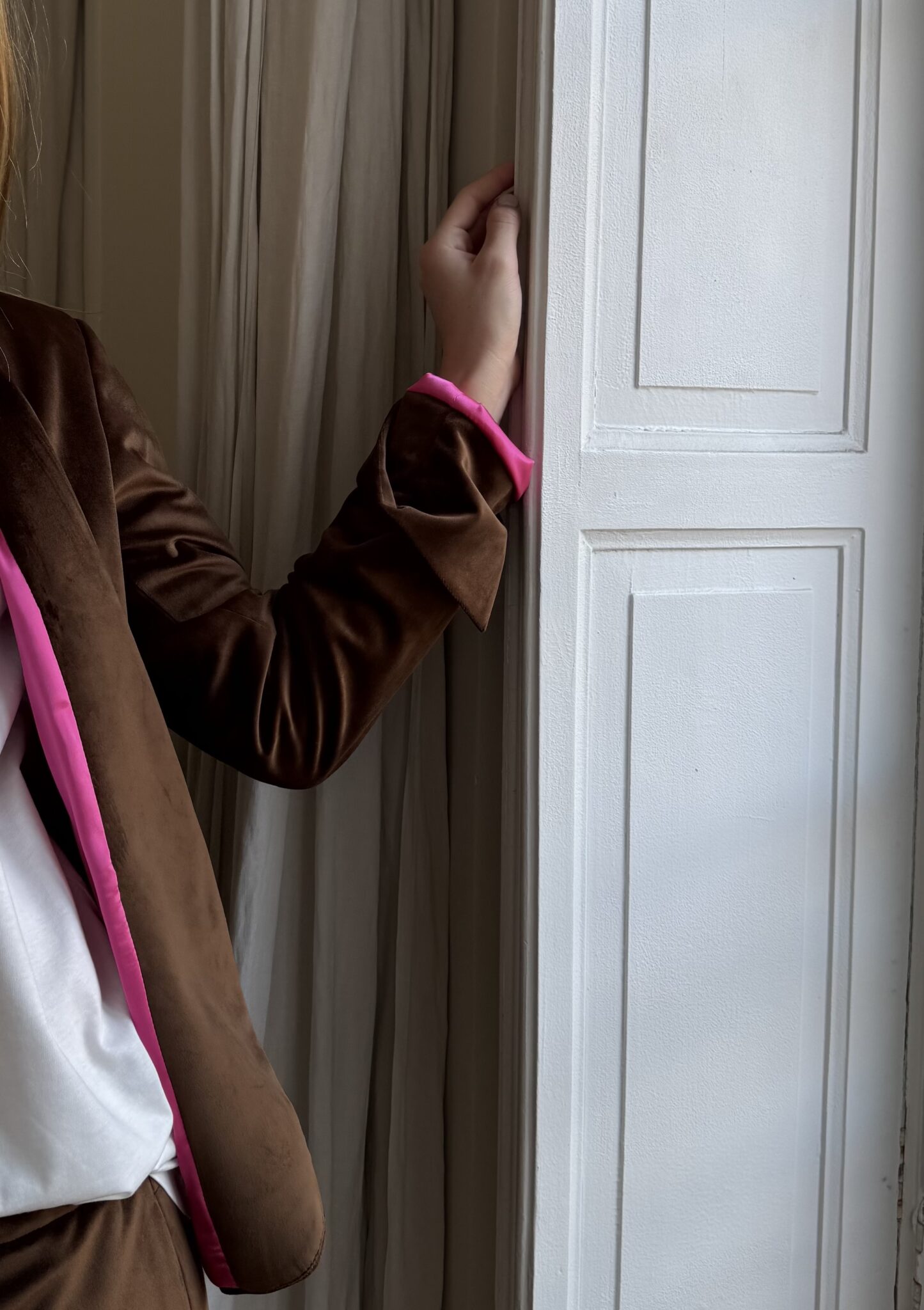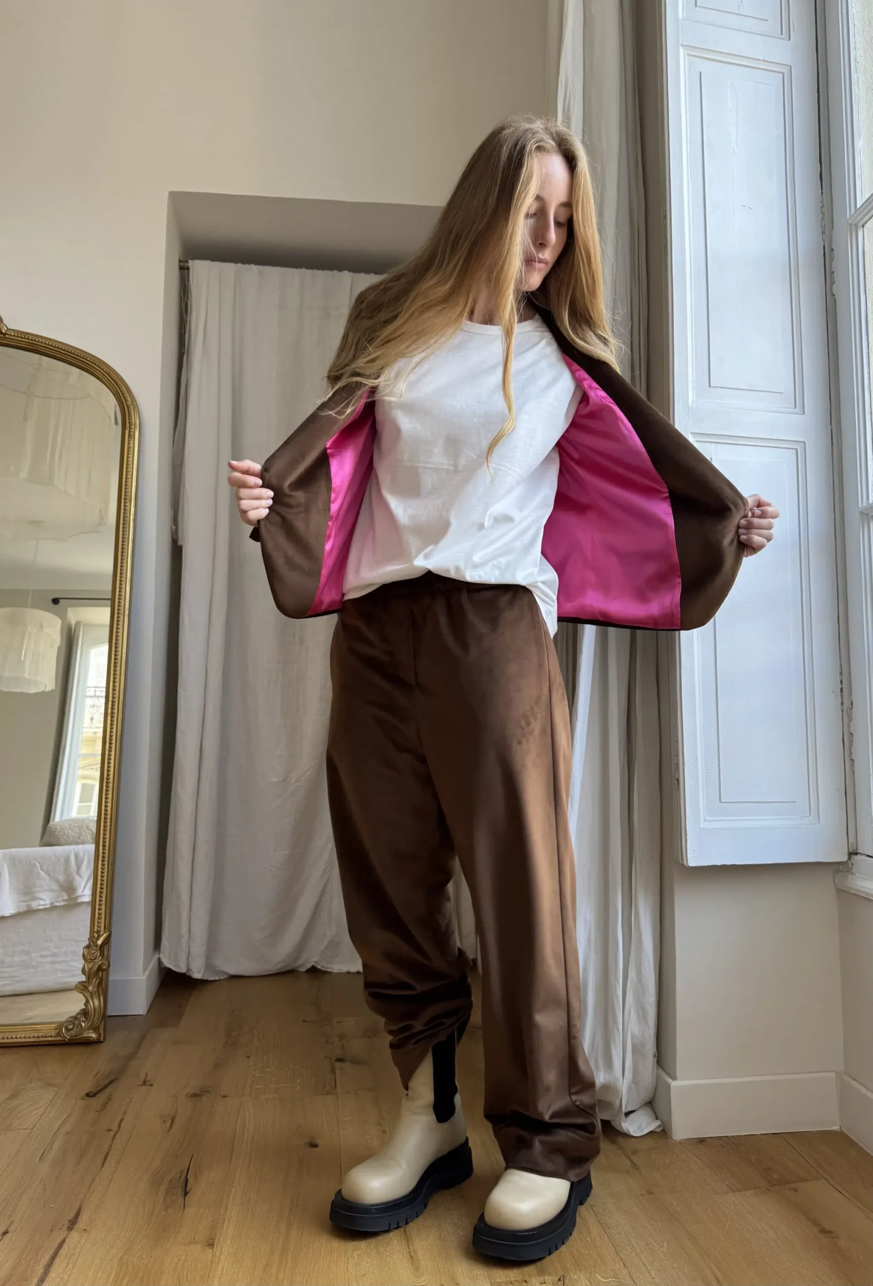 Veste Blazer « LOUISA » en velours lisse chocolat, entièrement doublée en crêpe satiné coloris fuchsia. Fermeture à pression. Veste chic et élégante. PIÈCE UNIQUE