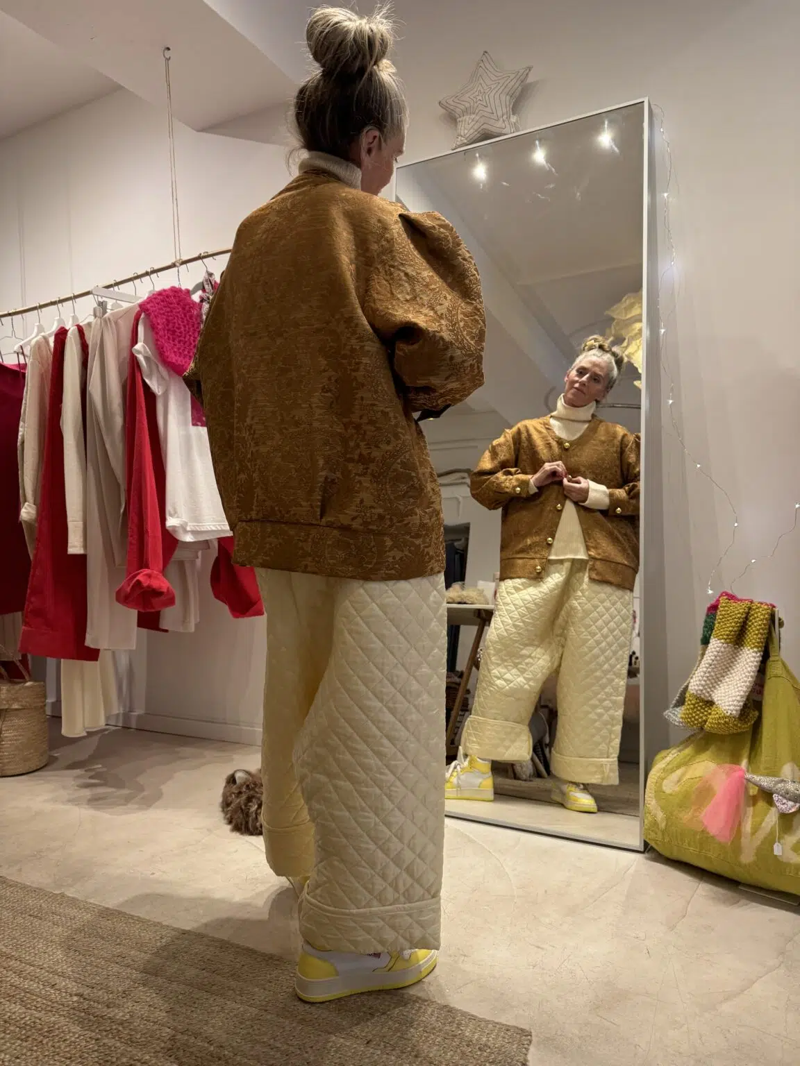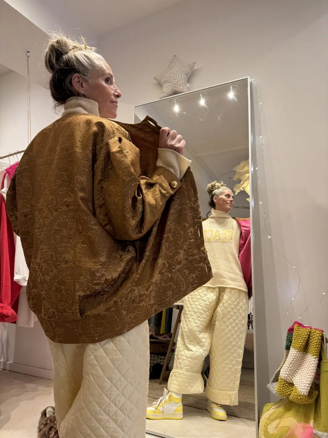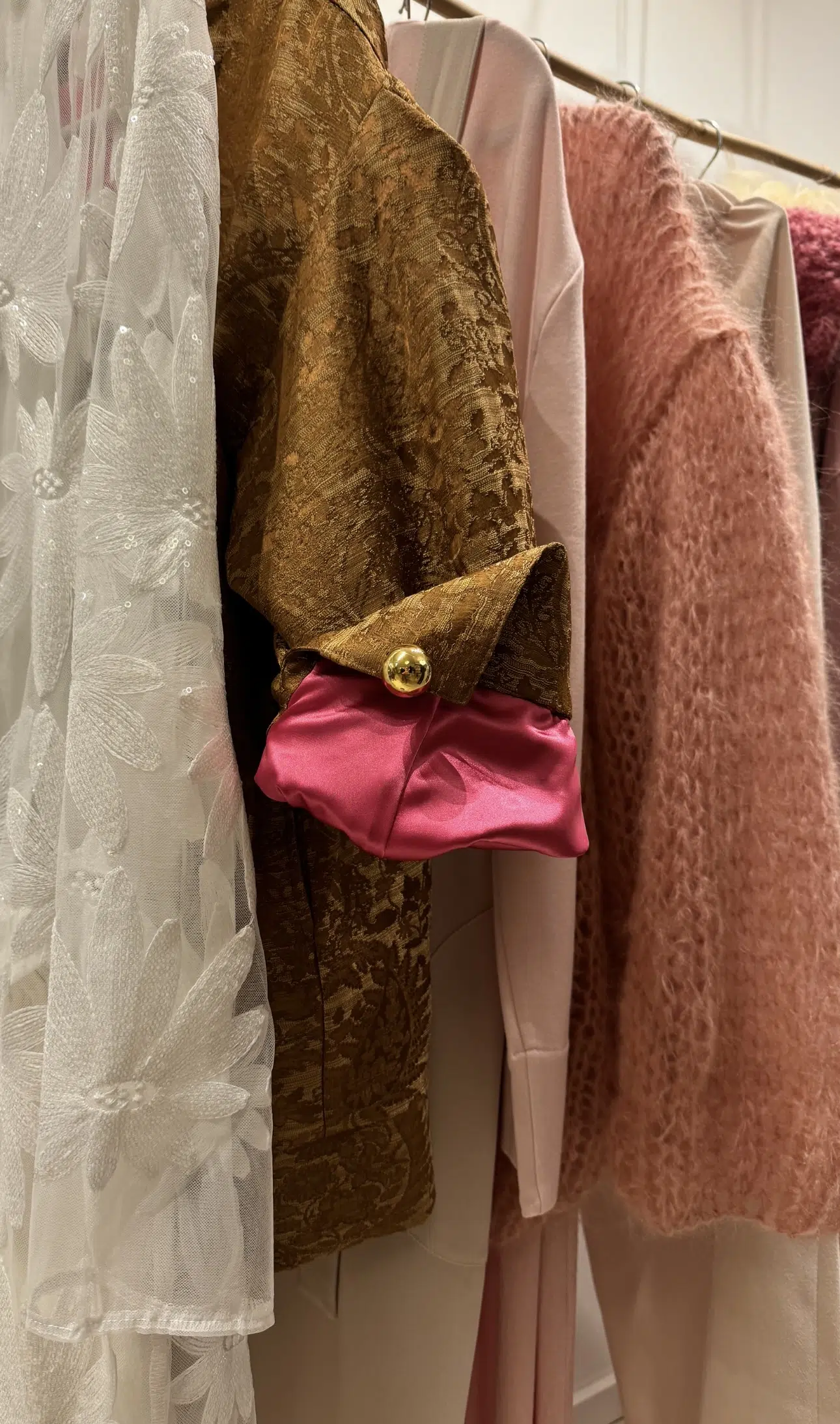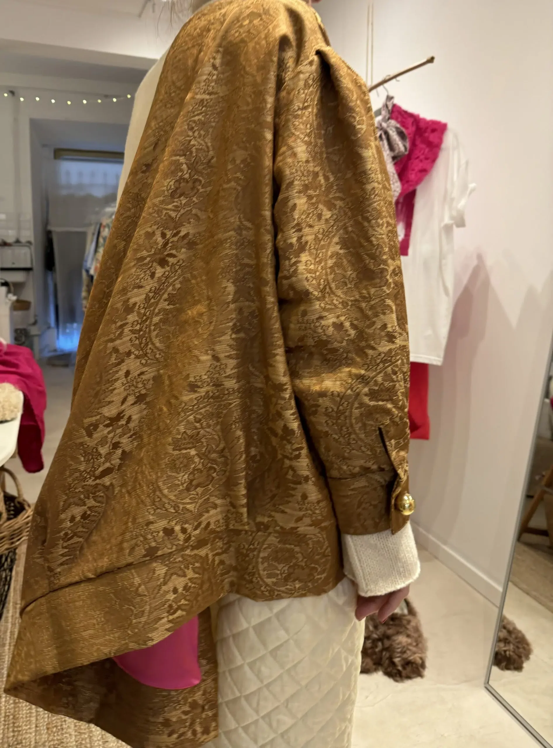 Veste Bomber « JANO » dans un sublime brocart de soie doré brodé. Entièrement doublée en crêpe satiné coloris fuchsia. Fronces aux épaules et aux poignets. Pinces au dos et en bas de veste. Boutons dorés. Une coupe loose et oversize, pour une veste stylée. PIÈCE UNIQUE