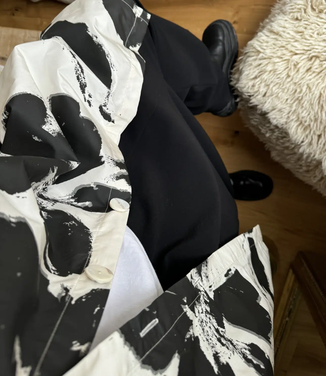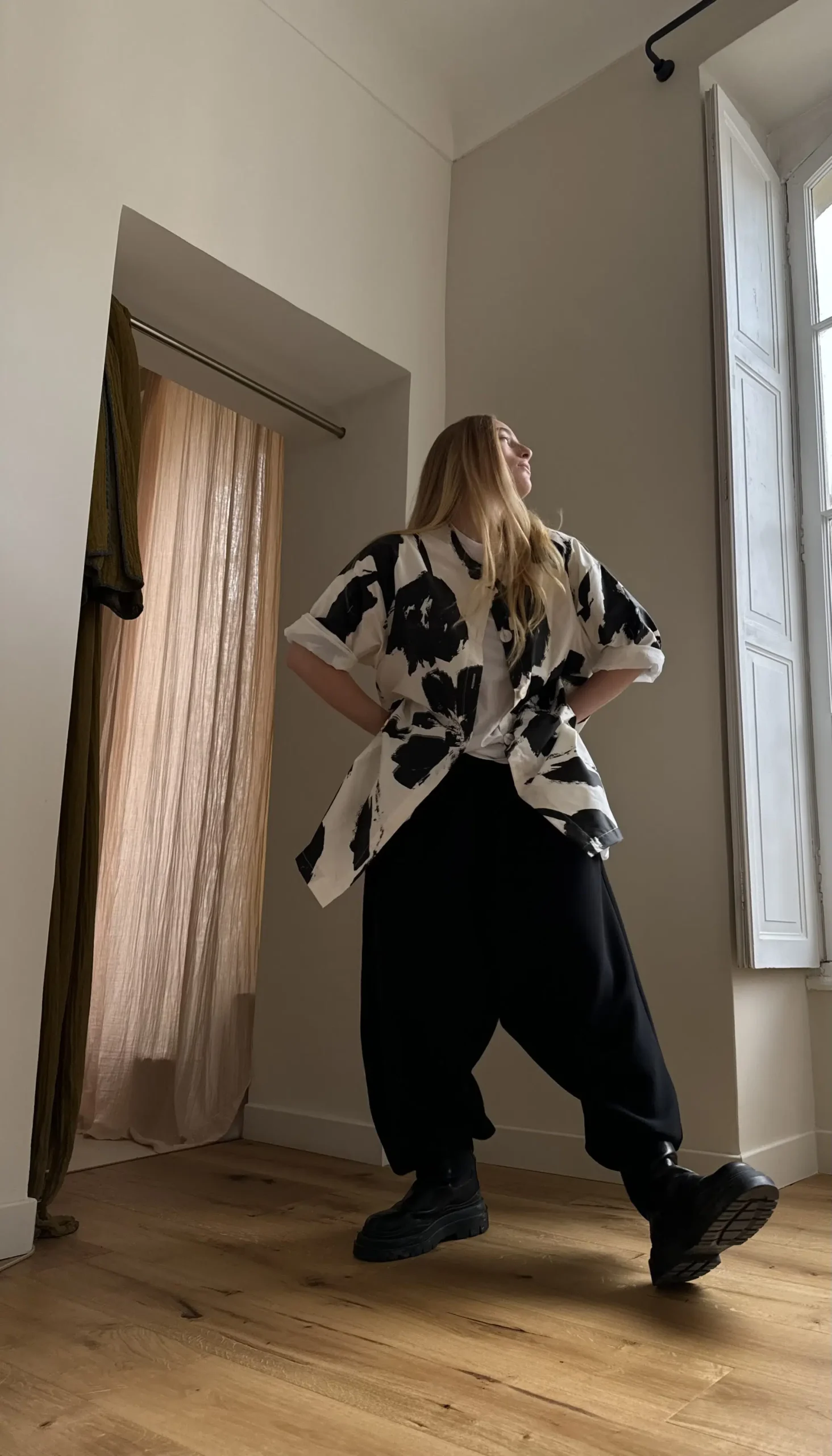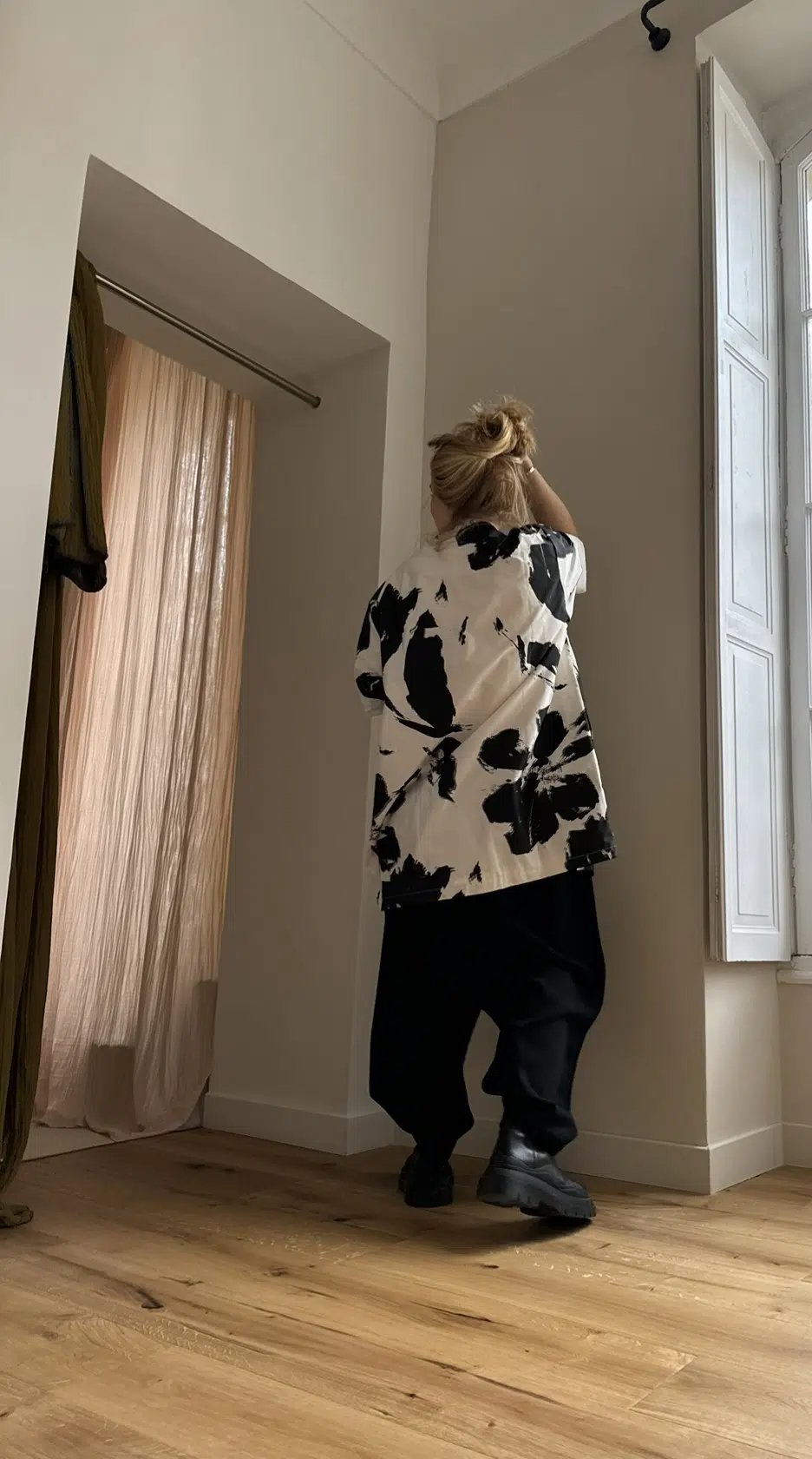 Veste « CLAUDE » en soie à fleurs. Une coupe minimaliste, oversize, à l’inspiration japonaise. Poches latérales. Veste boutonnée et entièrement doublée en soie et coton écru. Une création unique, poétique et élégante. PIÈCE UNIQUE