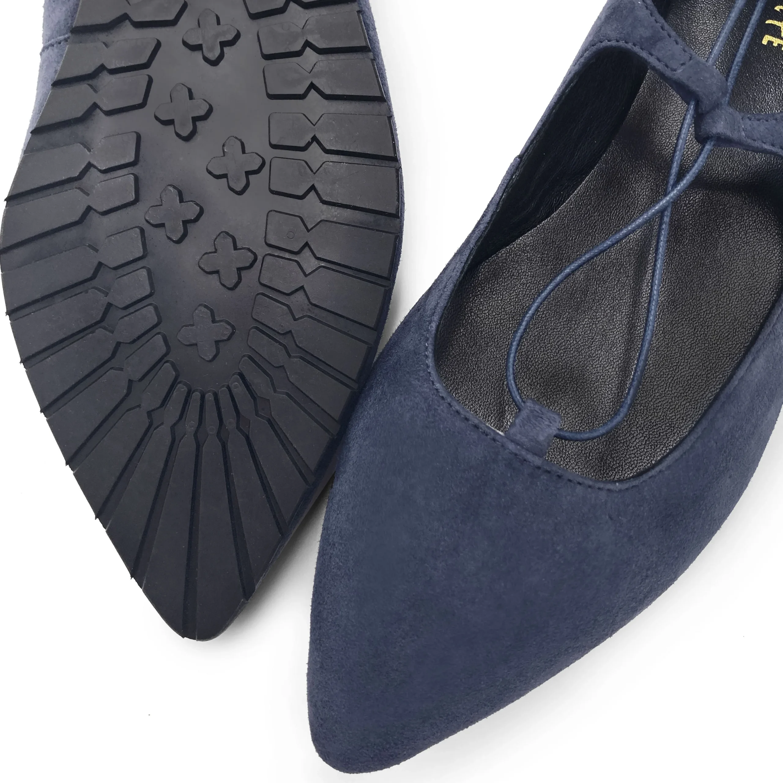 Un tocco di raffinatezza moderna per ogni momento della giornata: questa ballerina a punta in camoscio blu petrolio chiaro combina eleganza e versatilità con dettagli femminili unici. I lunghi lacci alla schiava, morbidi e regolabili, possono essere avvolti intorno alla caviglia o più in alto sul polpaccio, regalando un effetto sofisticato e personalizzato. La fodera e il sottopiede in pelle nera garantiscono una calzata confortevole, mentre la suola in gomma nera leggera assicura stabilità e comodità. Perfette per completare look diurni, come pantaloni cropped chiari e una blusa fluida, o per dare un tocco chic a un outfit serale composto da una gonna midi e un top minimalista, queste ballerine sono la scelta ideale per chi desidera uno stile d’impatto senza rinunciare alla praticità.