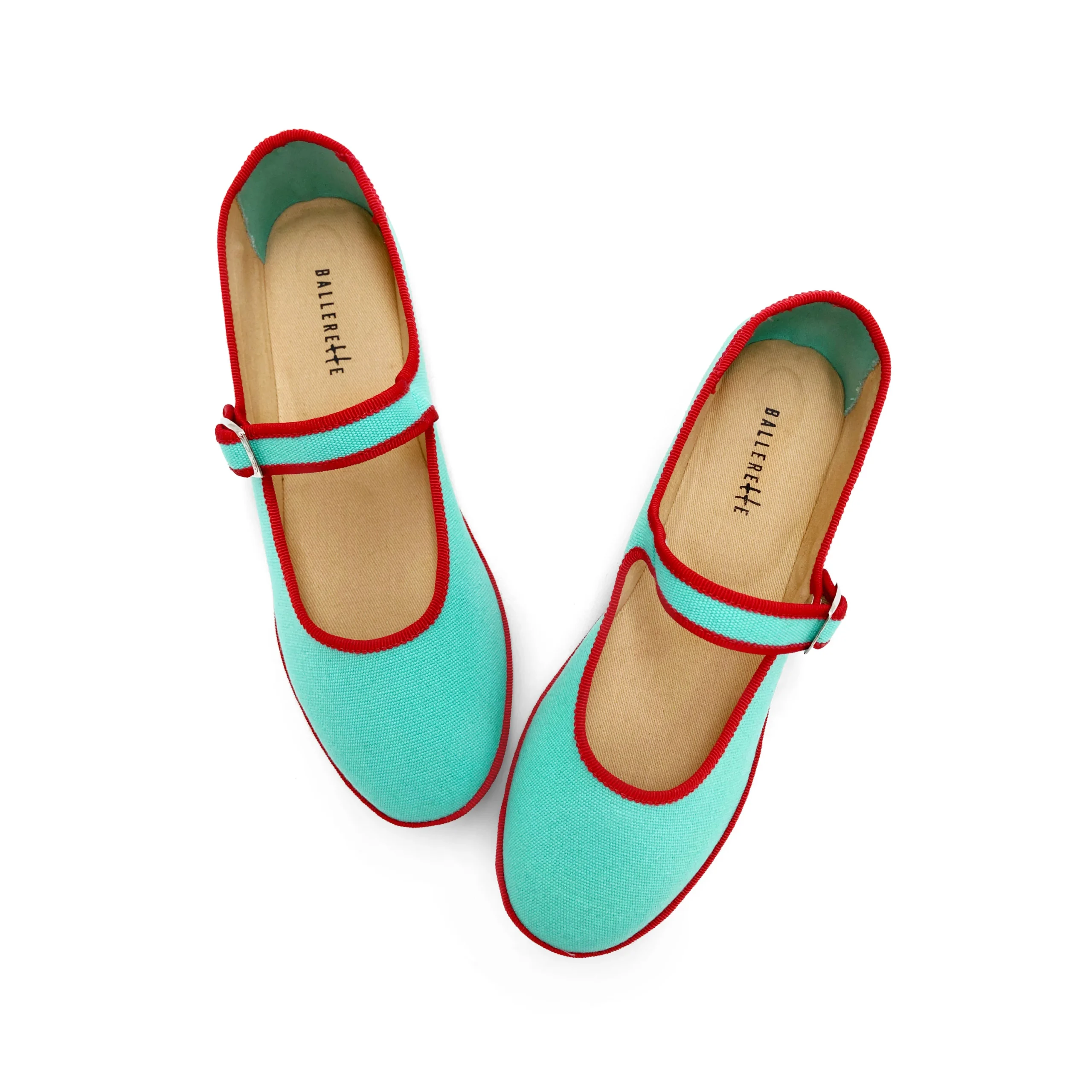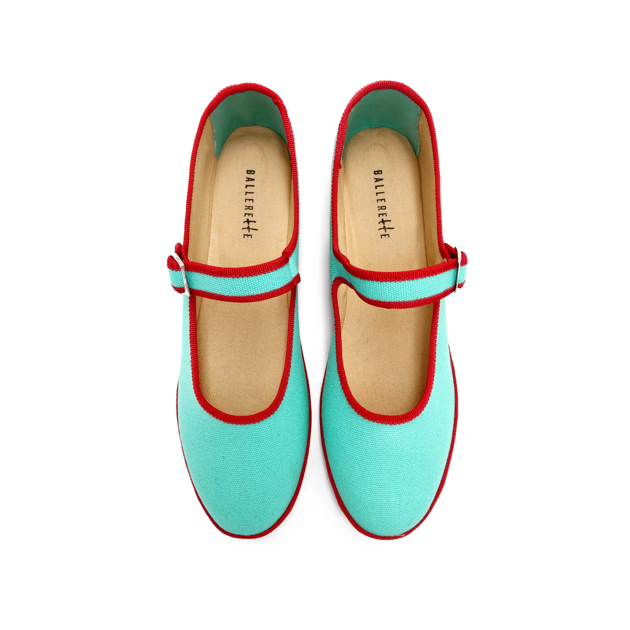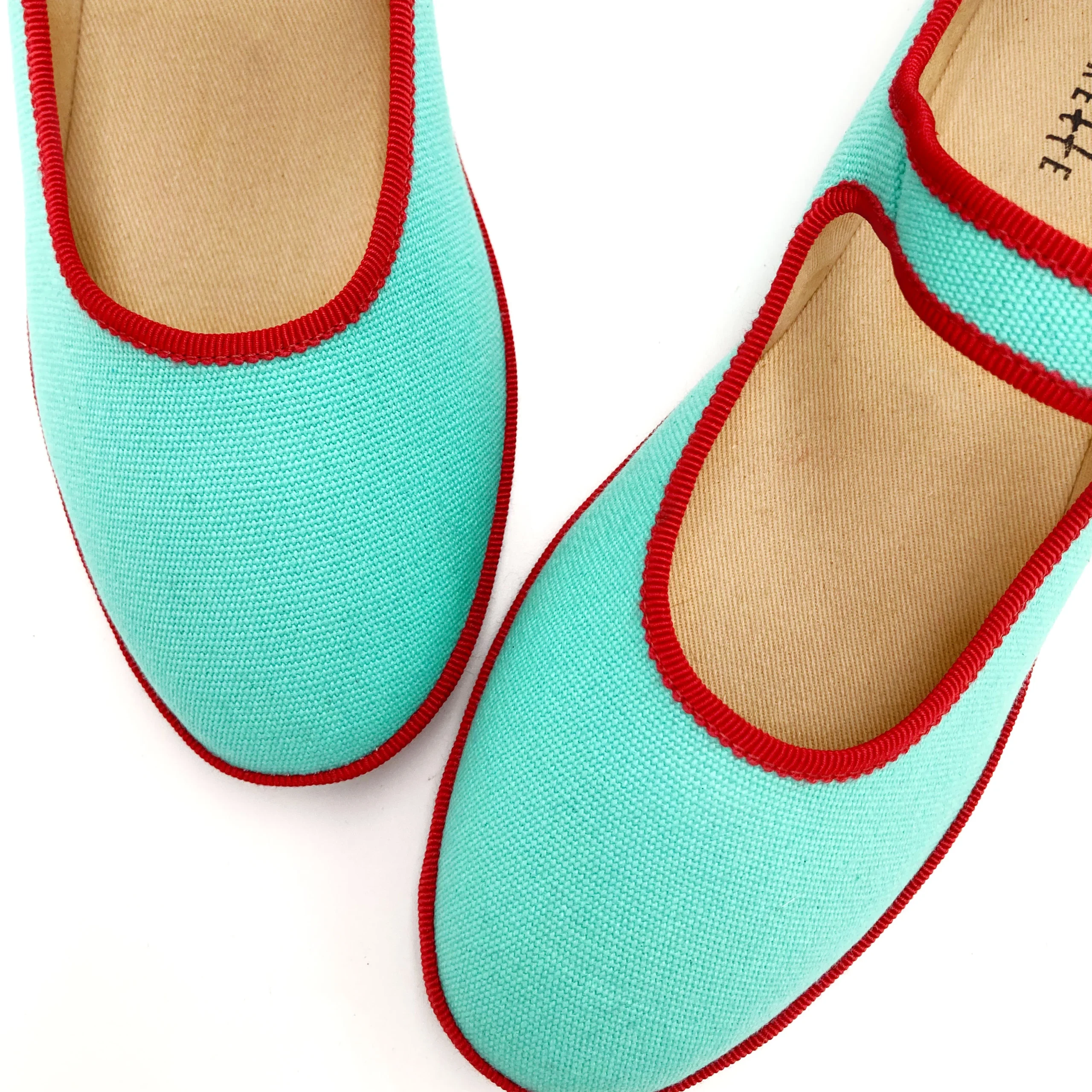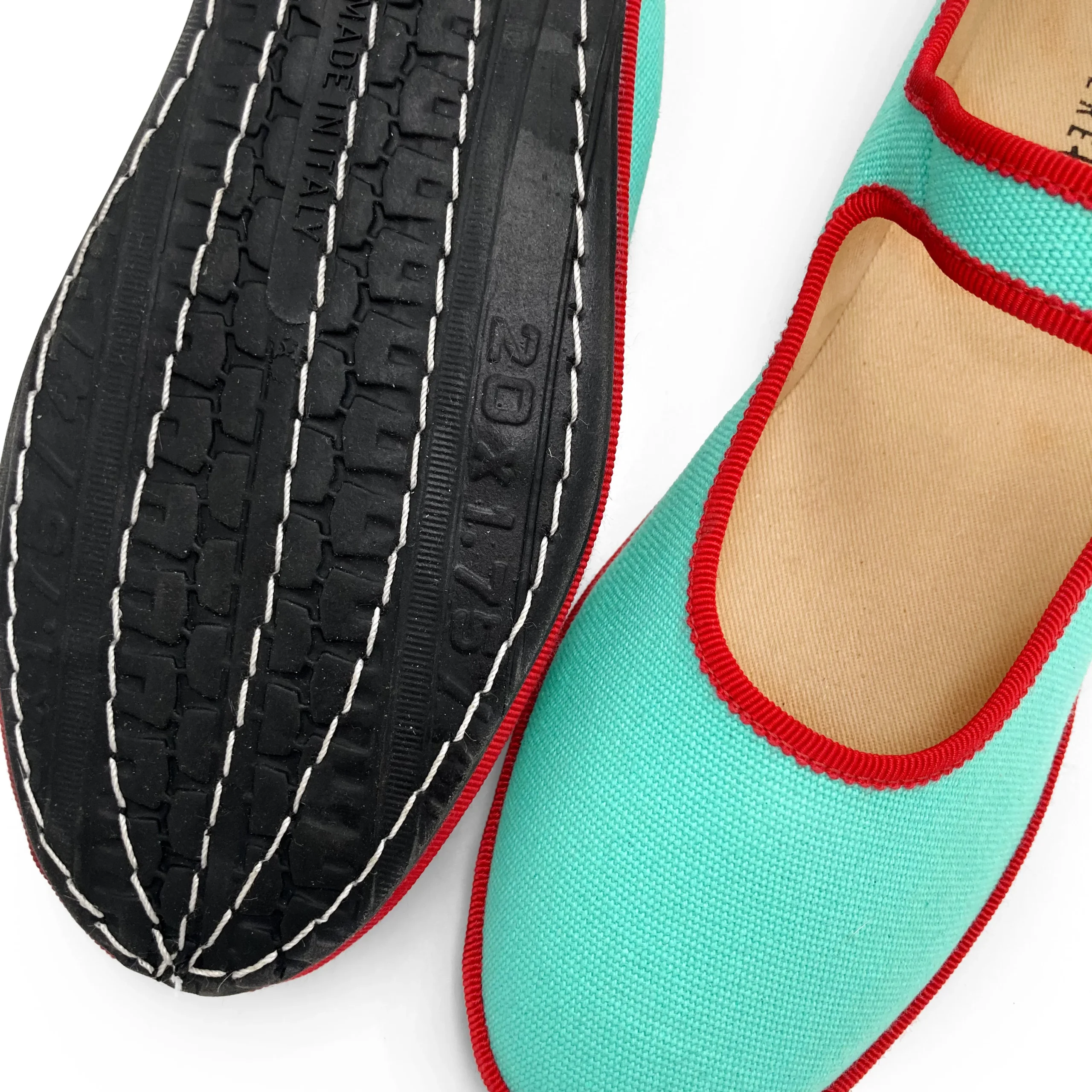 Le scarpette friulane o « furlane » sono un modello tipico di Venezia, lavorato a mano da sapienti artigiani. Queste ballerine hanno un laccetto baby sul dorso del piede, come nelle Mary Jane, che si chiude comodamente con un bottone automatico nascosto sul lato. La tomaia è realizzata in cotone naturale di un vivace azzurro acqua con bordo in gros grain a contrasto rosso acceso. Il sottopiede e la fodera sono in cotone e la suola è in gomma con la tipica impuntura bianca del modello. Caratterizzate per un’eleganza informale e la morbidezza della calzata, queste friulane artigianali italiane saranno il modello perfetto per la tua stagione primavera estate dando un tocco di colore e allegria a ogni tuo outfit.