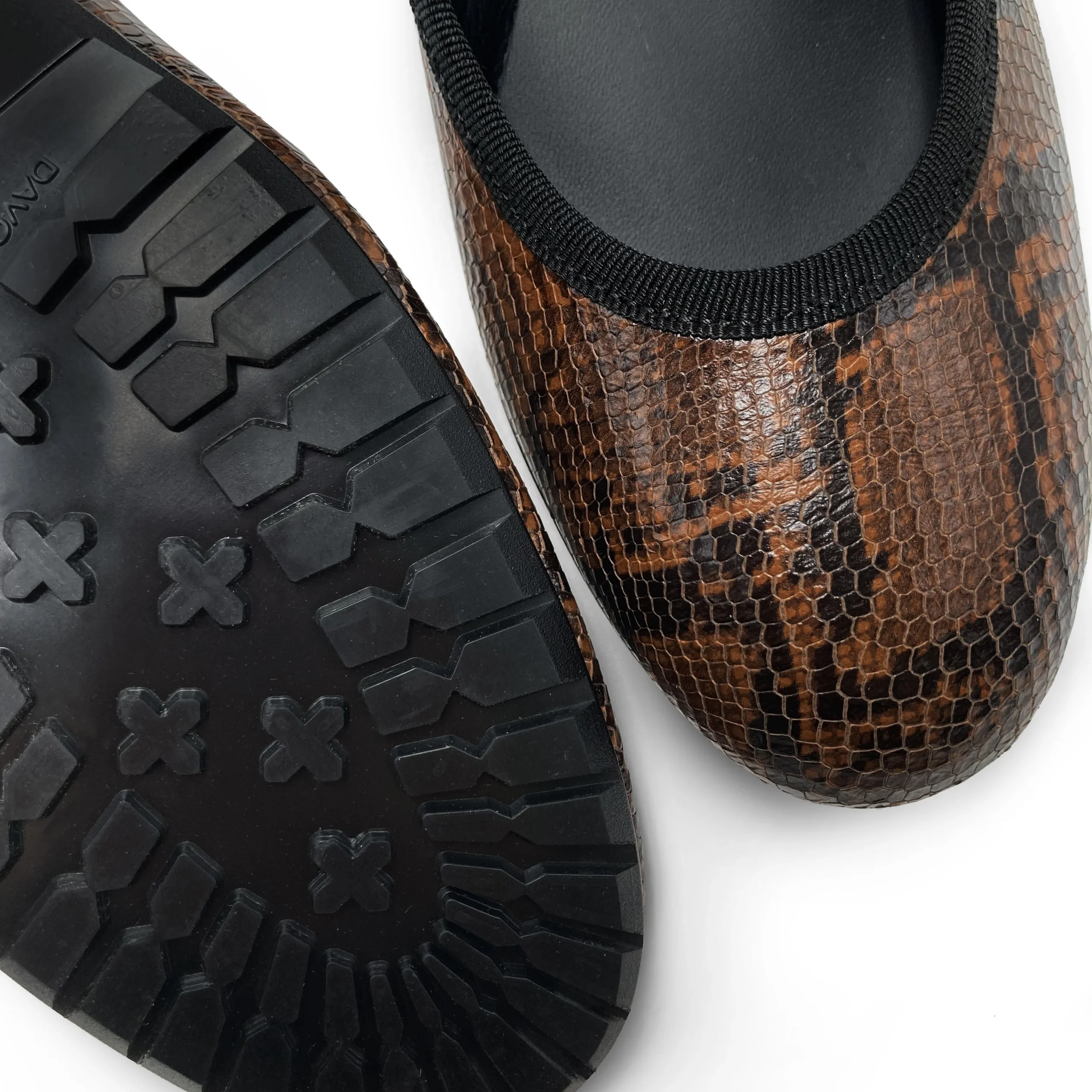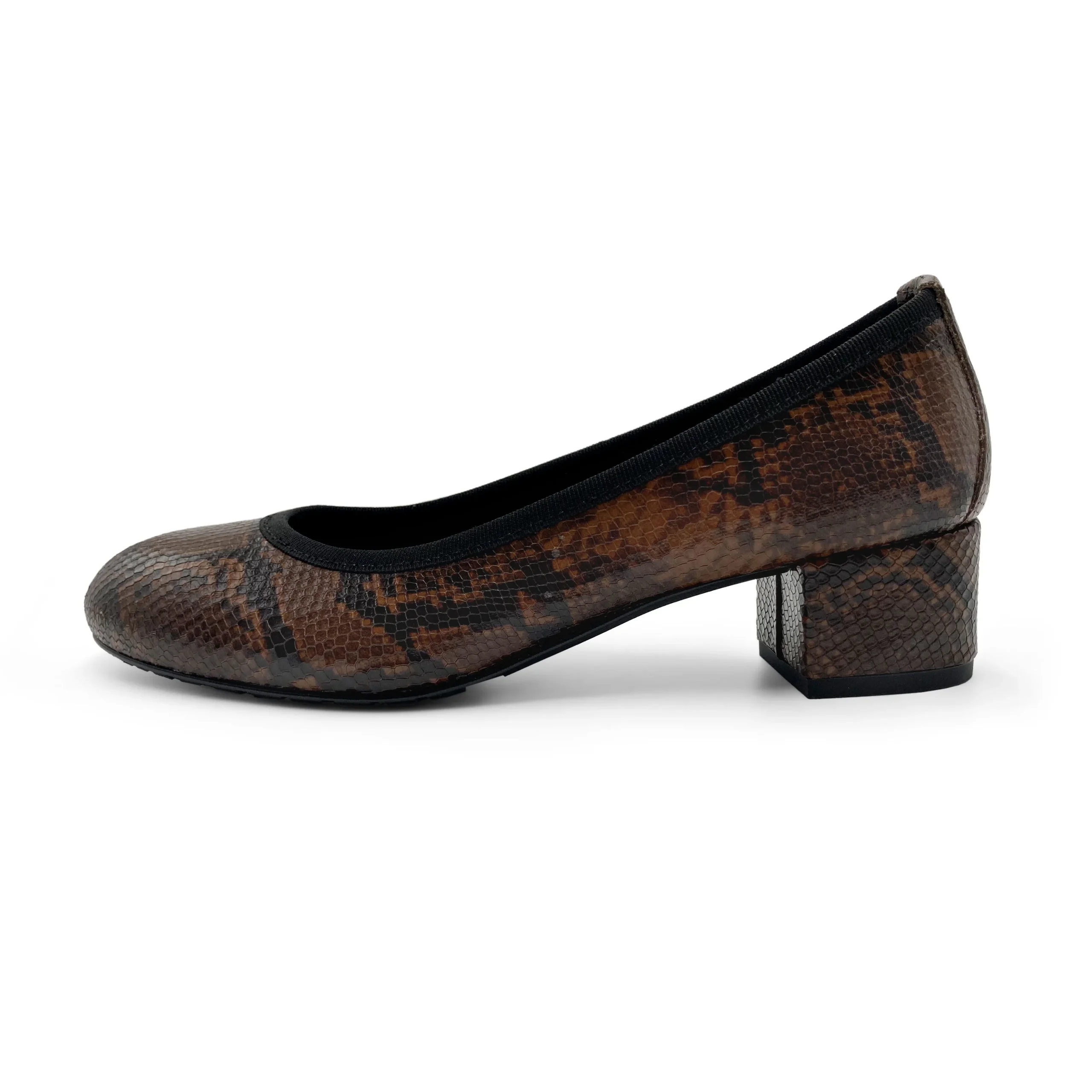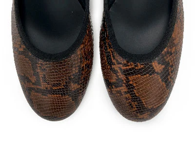 Le ballerine Aventino hanno una classica punta tonda e un tacco di 4 cm che conferisce comodità aggiuntiva alla calzata. Questa versione ha la suola in carrarmatino nero che le rendende pratiche da indossare anche nei mesi più freddi. La fodera interna è in pelle e il sottopiede è leggermente imbottito sul tallone per un’ottima vestibilità e comodità. Queste sofisticate ballerine invernali con tacco alto in pelle a stampa pitonata sui toni del nero e marrone sono laccessorio perfetto per rendere chic e alla moda look minimal: decisamente da provare con un tubino verde bottiglia o con un paio di pantaloni senape e una blusa nera.