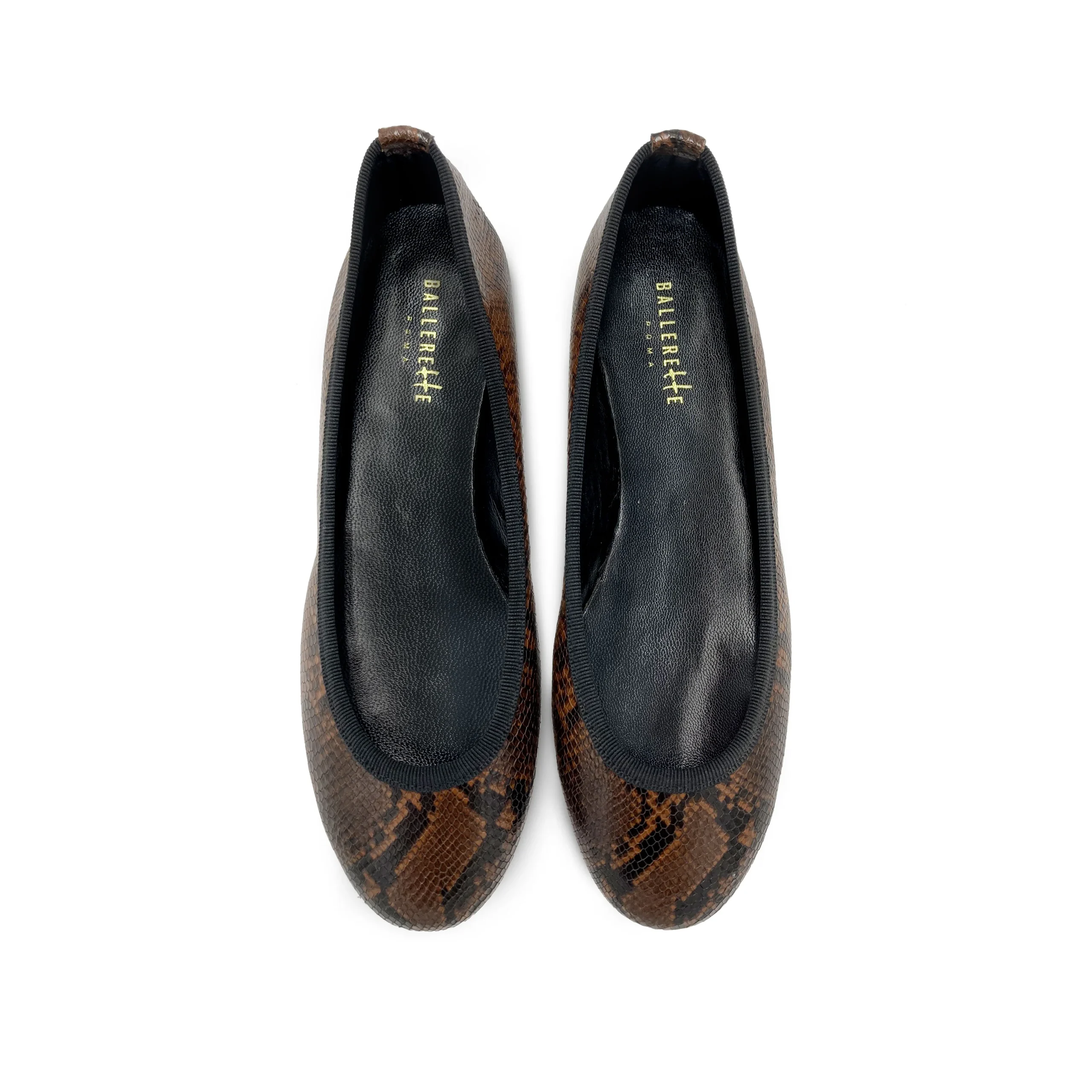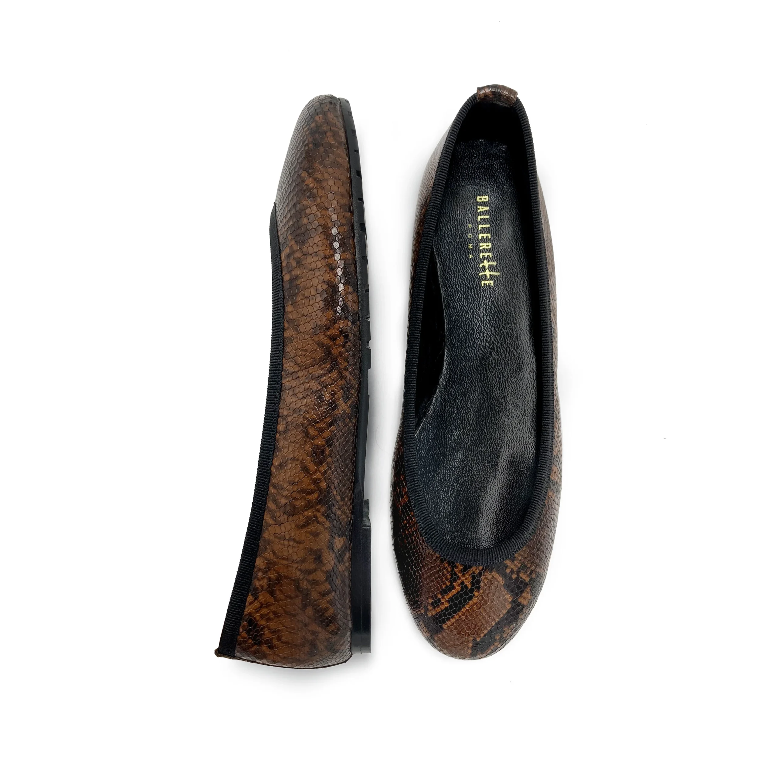 La stampa pitonata sui toni del marrone e nero rende queste ballerine basse invernali un accessorio elegante e moderno, perfetto per diventare un fidato passe-partout nel guardaroba femminile: gli abbinamenti da proporre sono infiniti, saprrano dare carattere a un look monocromatico nero o marrone e accompagnare colori accesi a contrasto come il viola, il verde e il rosso.