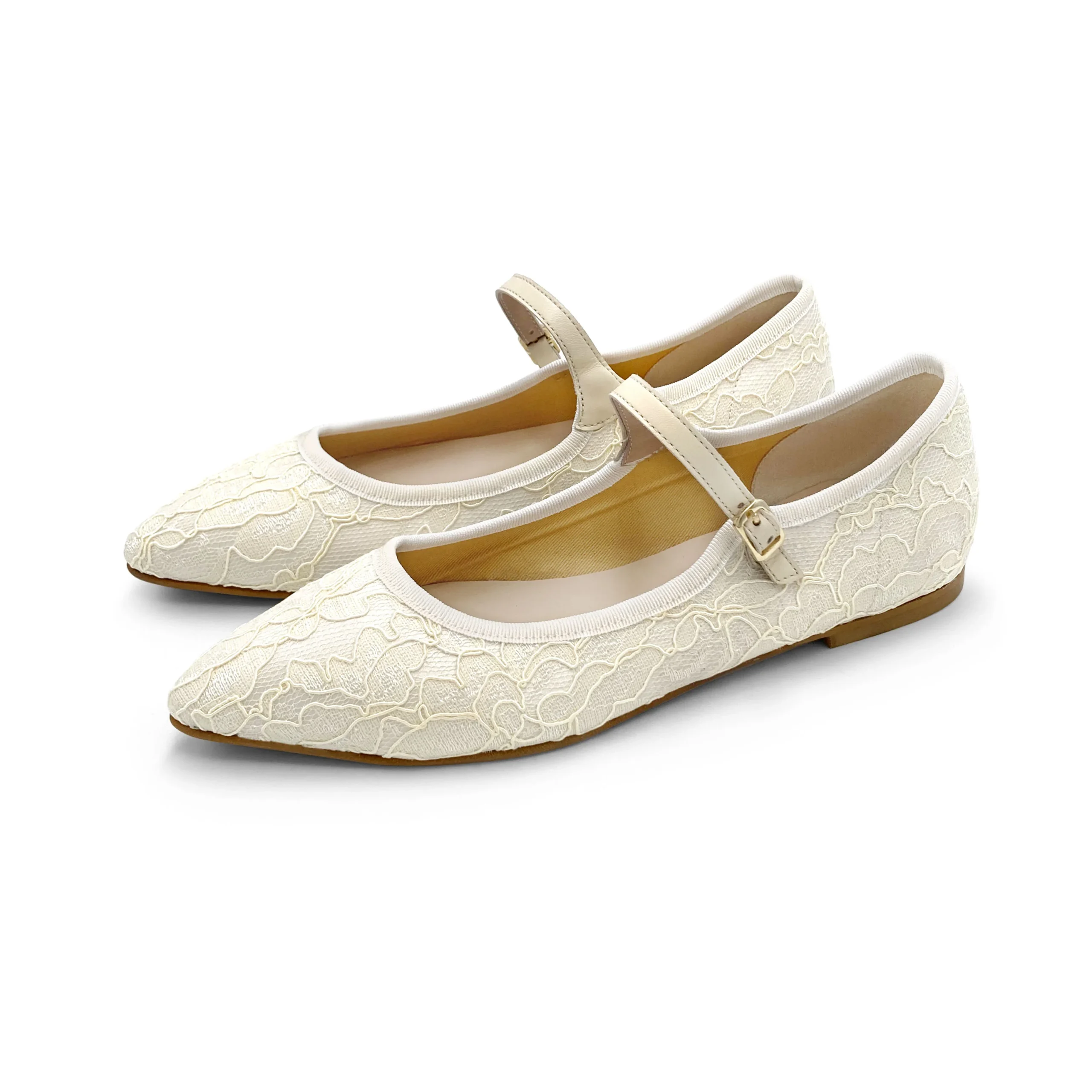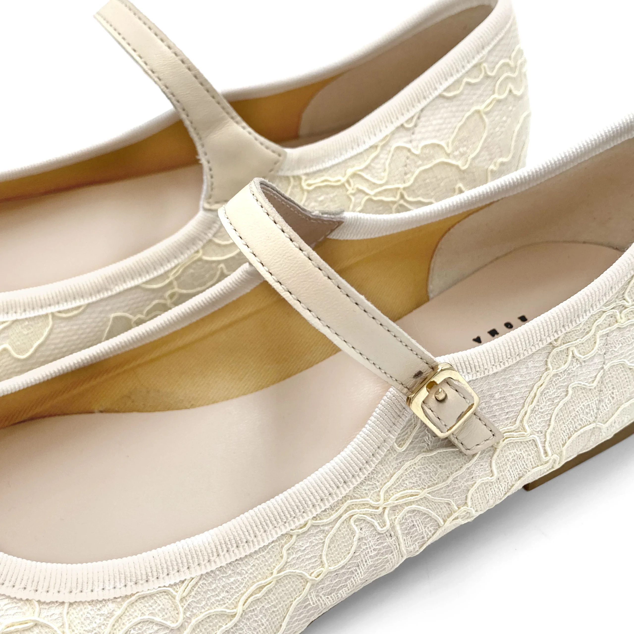 Le scarpe basse bianche di colore avorio da sposa o cerimonia, modello ballerine Mary Jane, sono capaci dii coniugare femminile eleganza, romanticismo e comodità. Realizzate in un pizzo a disegno floreale, con fodera in cotone e sottopiede in pelle, saranno perfette sotto il tuo abito e ti permetteranno di goderti appieno il giorno più bello. La linea delle ballerine da sposa è affusolata, con punta accogliente e cinturino regolabile sul dorso del piede per un tocco retrò e raffinato.