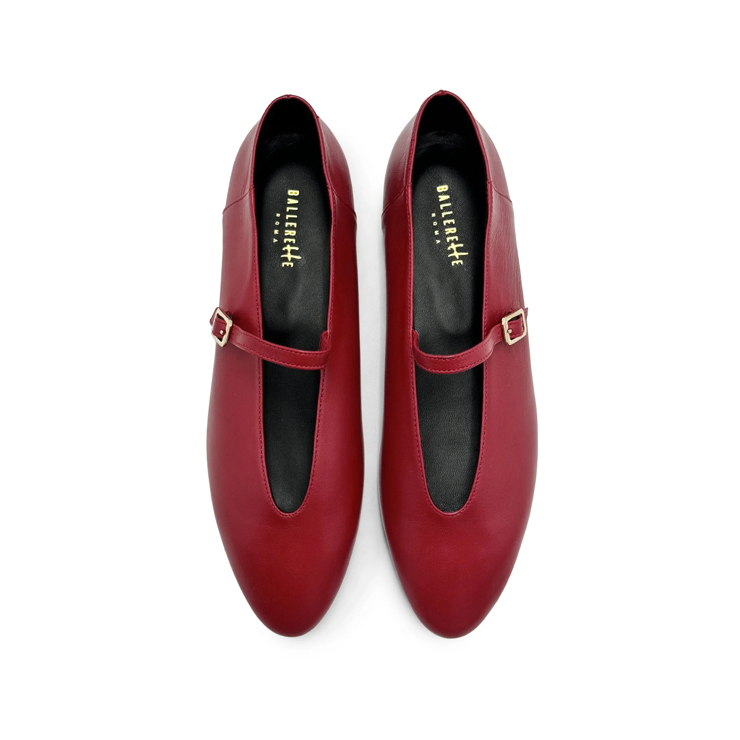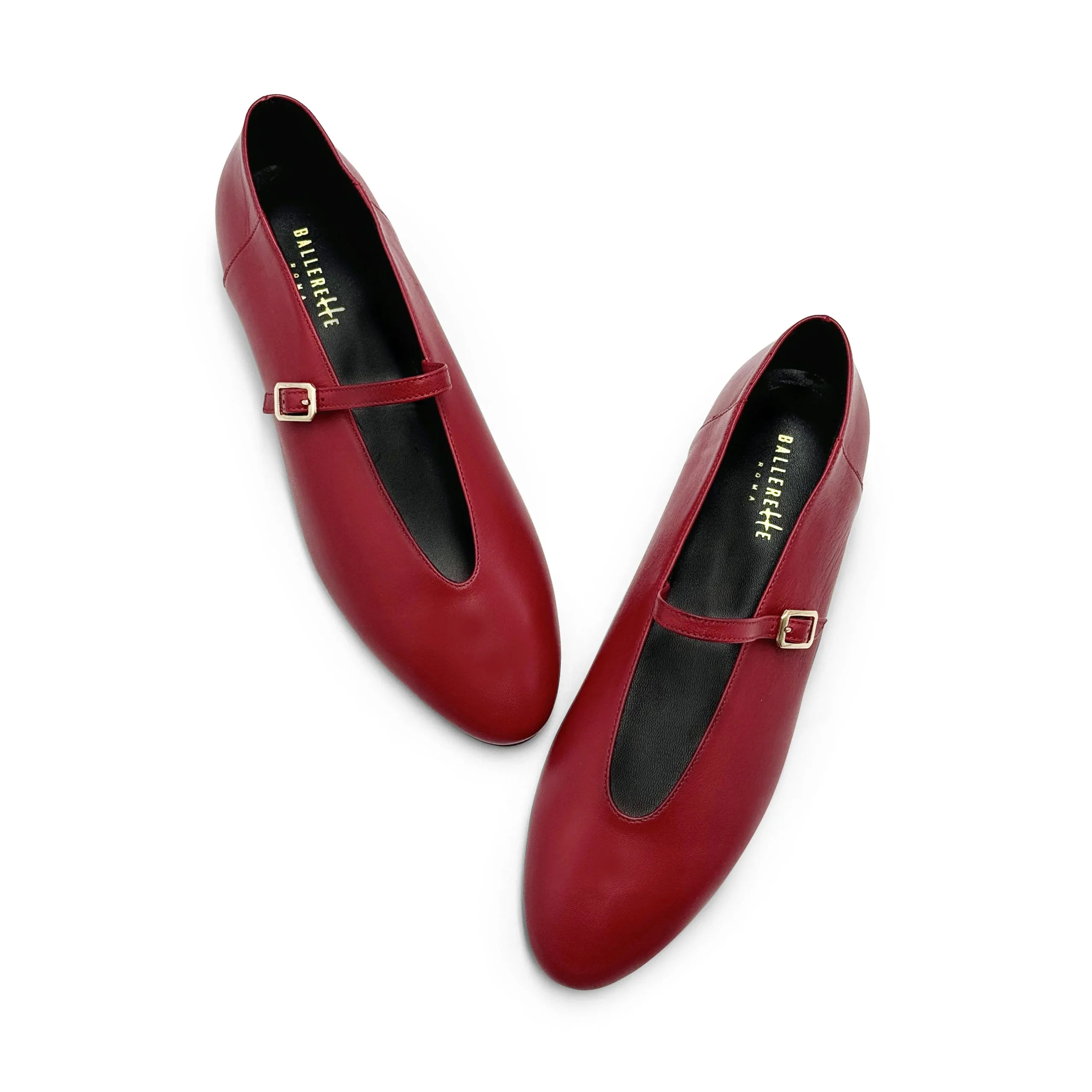 Lo stile inconfondibile del nostro modello Torlonia si arricchisce di un cinturino che abbraccia il piede e si chiude lateralmente sulla tomaia. Morbide e avvolgenti, sono caratterizzate da un particolare scollo a V che accompagna bene il piede, e da una linea a punta tonda minimal ed elegante. Queste ballerine accollate sono realizzate in pelle rosso scuro e foderate in pelle. La suola è in gomma light di colore nero per essere indossate con comodità in ogni occasione.