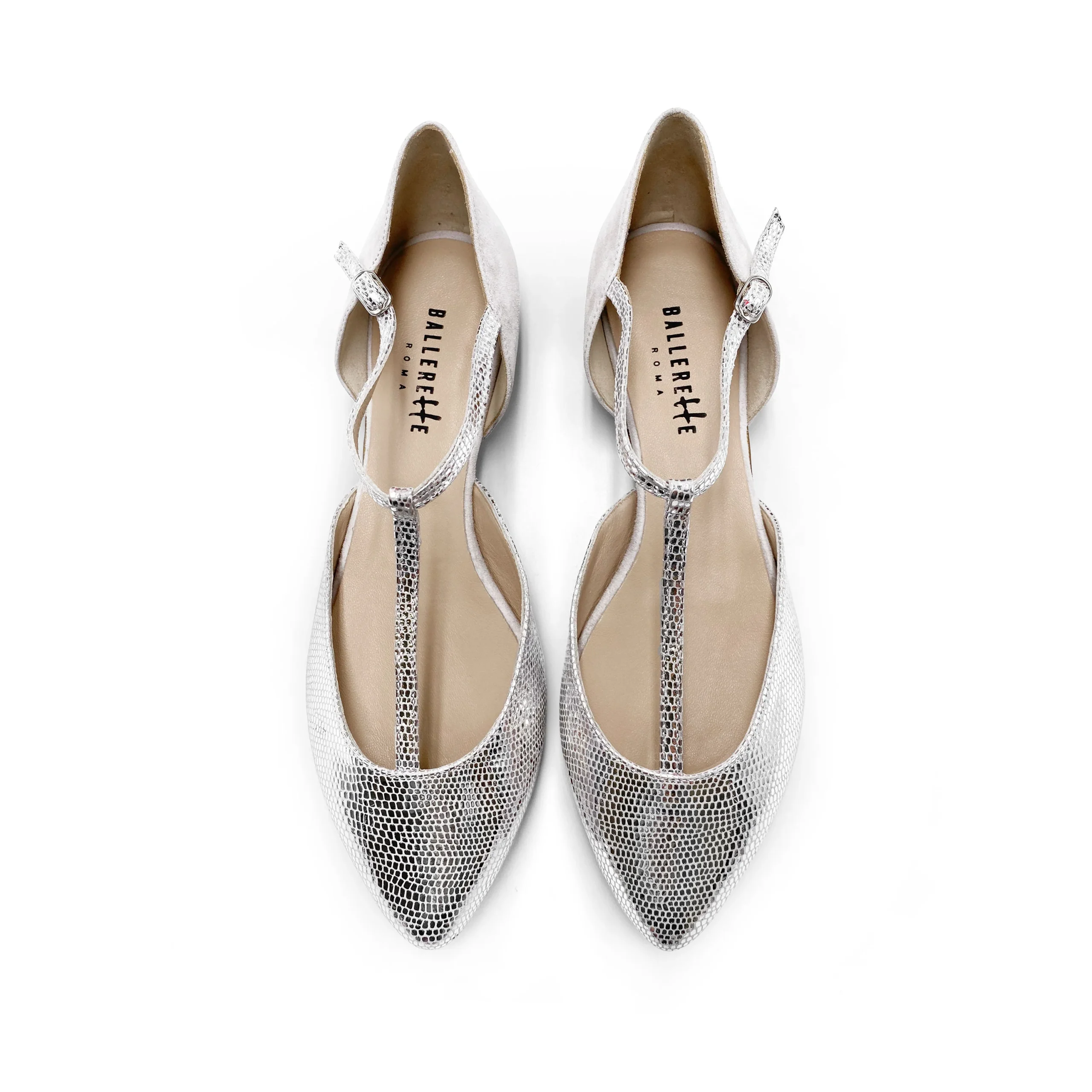 Le ballerine t-bar Mercede hanno una linea a punta con un caratteristico cinturino a T ad accompagnare e adornare il piede. Il laccetto si chiude sulla caviglia con una metalleria argento. La scarpa ha una forma aperta e avvolgente ed è realizzata in camoscio bianco avorio con trama laminata argento. L’effetto luminoso rende questo modello di scarpe basse perfetto d’abbinare sia di giorno che di sera, anche come scarpa da cerimonia o sposa. La comodità è inoltre garantita dalla morbidezza dei pellami scelti sia per la tomaia che per la fodera interna e il sottopiede. Indossa le tue t-bar con un abito chemisier di cotone bianco e cintura gioiello o dai luce ai tuoi jeans preferiti in una versione più informale.