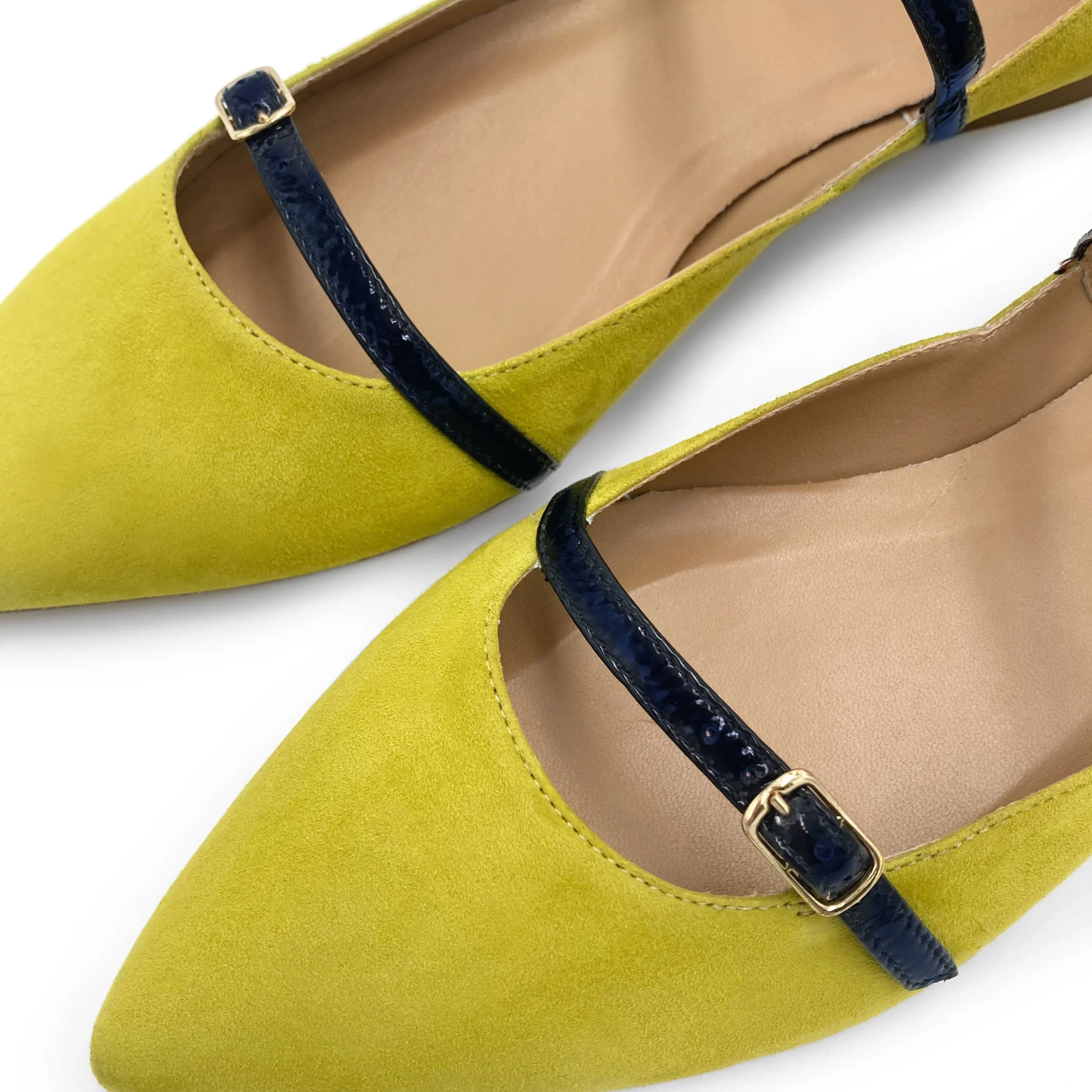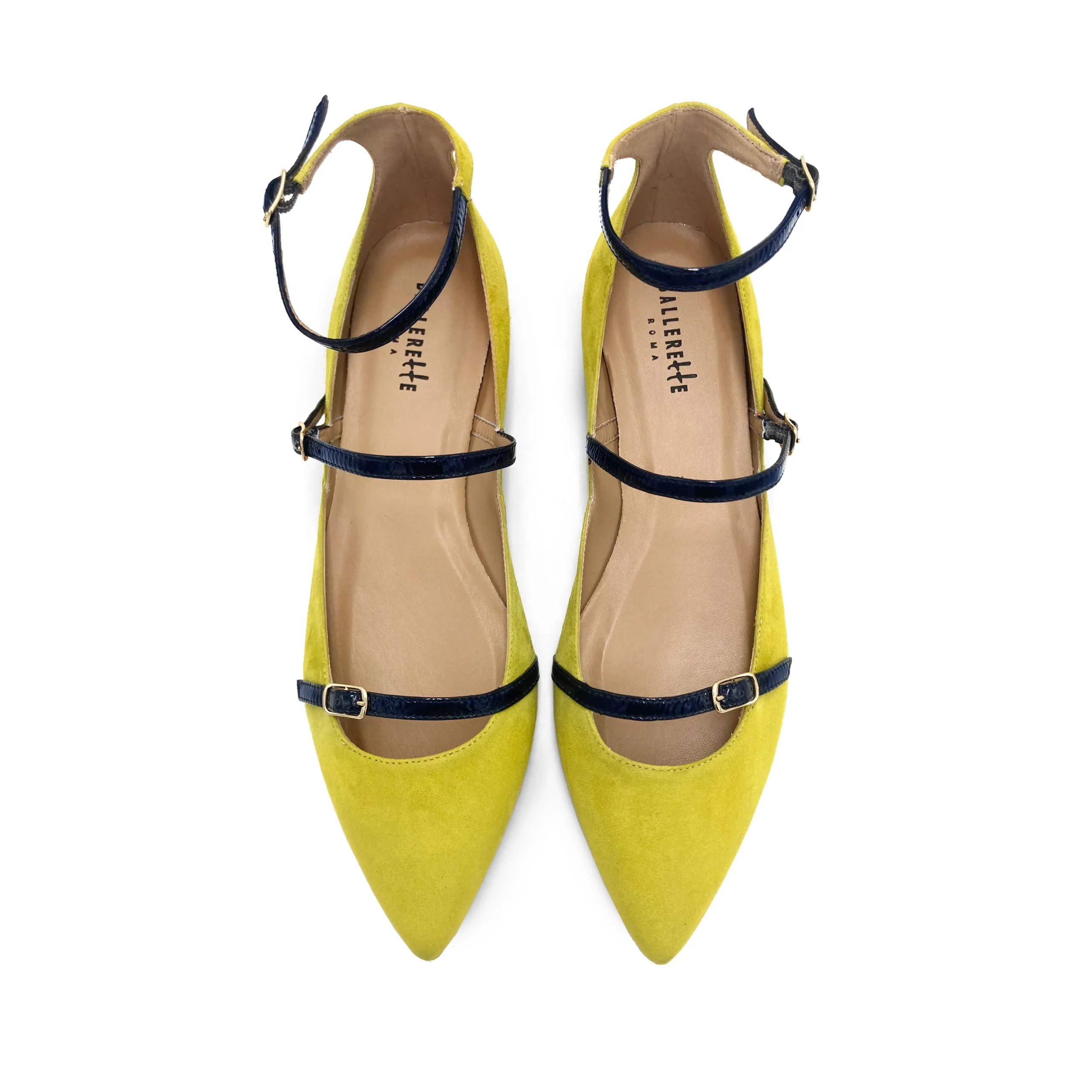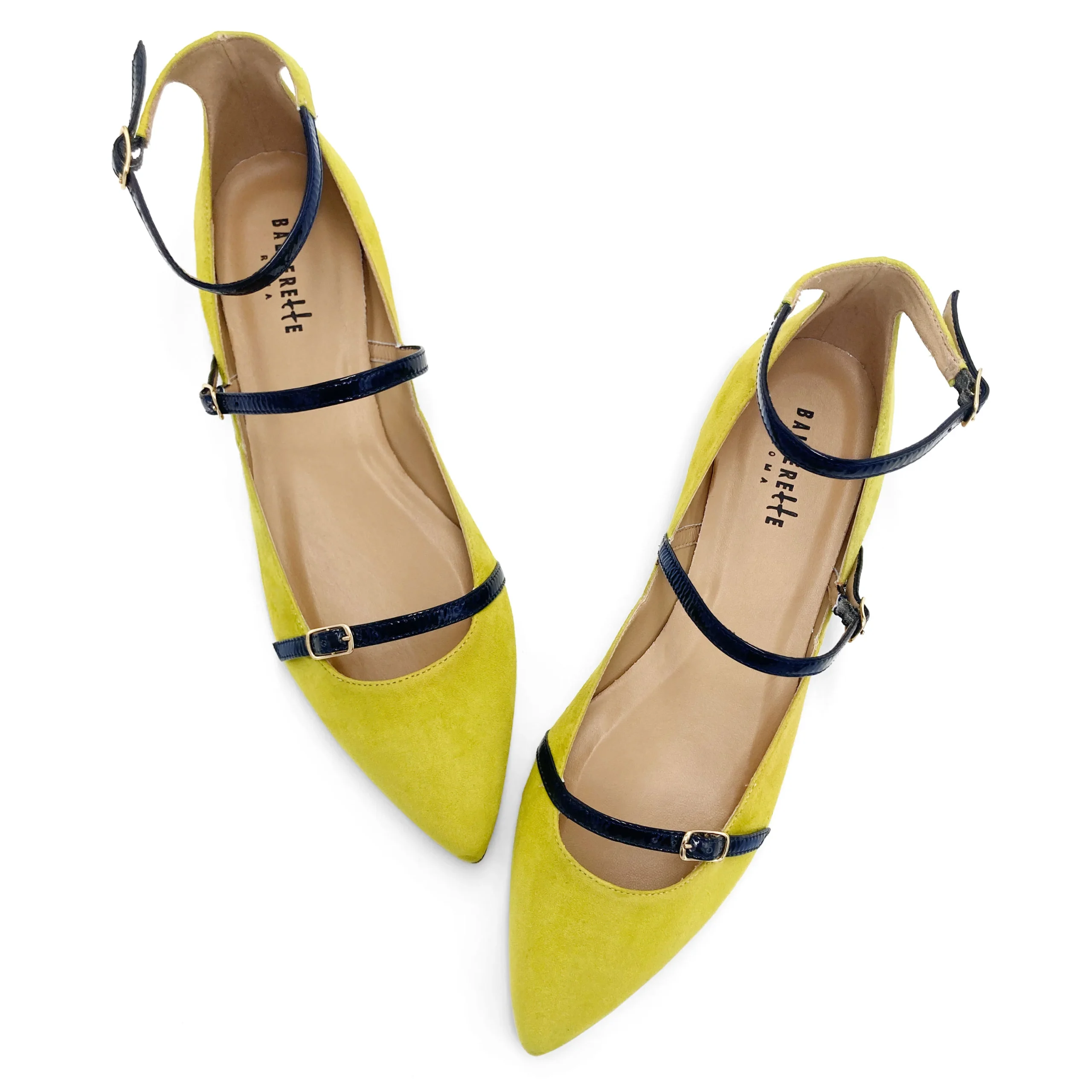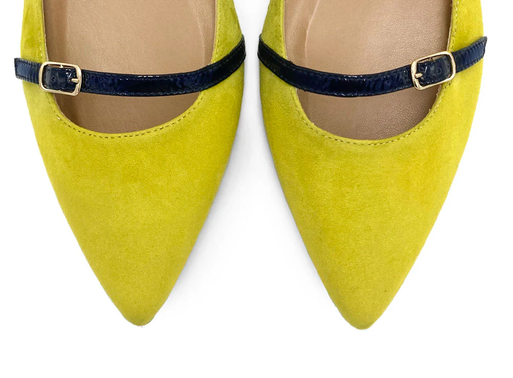 Le Leonine sono delle ballerine a punta dalla linea affusolata, con scollo laterale e tre laccetti ad accompagnare il piede e la caviglia. La scarpa è realizzata in camoscio di colore verde oliva, fodera e sottopiede in pelle e suola in cuoio. I laccetti decorativi e funzionali sono realizzati in vernice di colore blu con un particolare effetto « stroppicciato ». Le ballerine femminili ed eleganti con cinturini sono un modello femminile e raffinato. Puoi indossare questo abbinamento cromatico verde e blu con un completo estivo in lino o con un abito a trapezio di colore arancio di tendenza nella stagione.